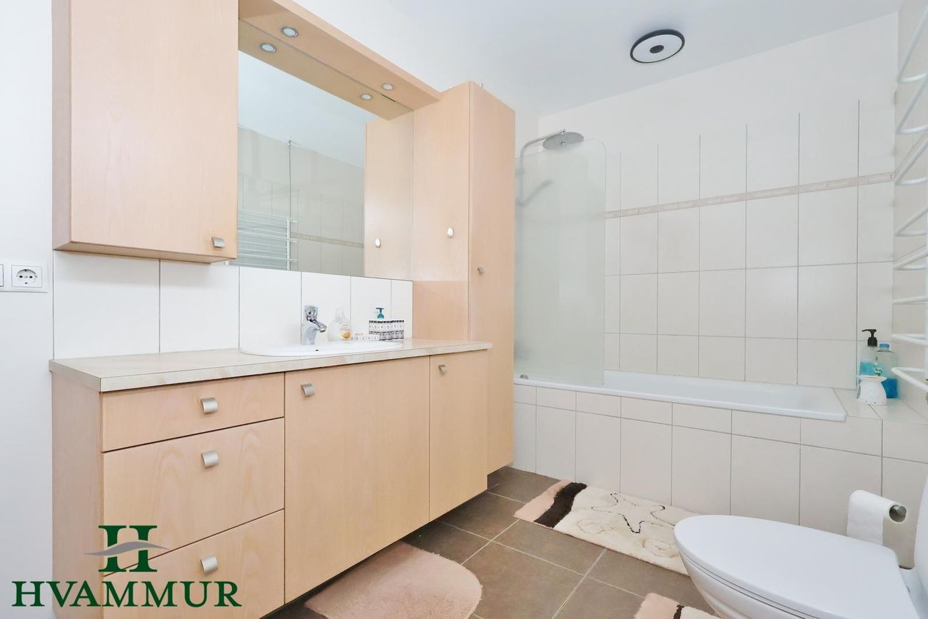 Baðherbergi er með góðri innréttingu, baðkari með sturtutækjum, wc og handklæðaofni. Flísar á gólfi og hluta veggja.