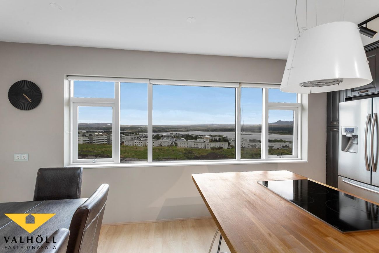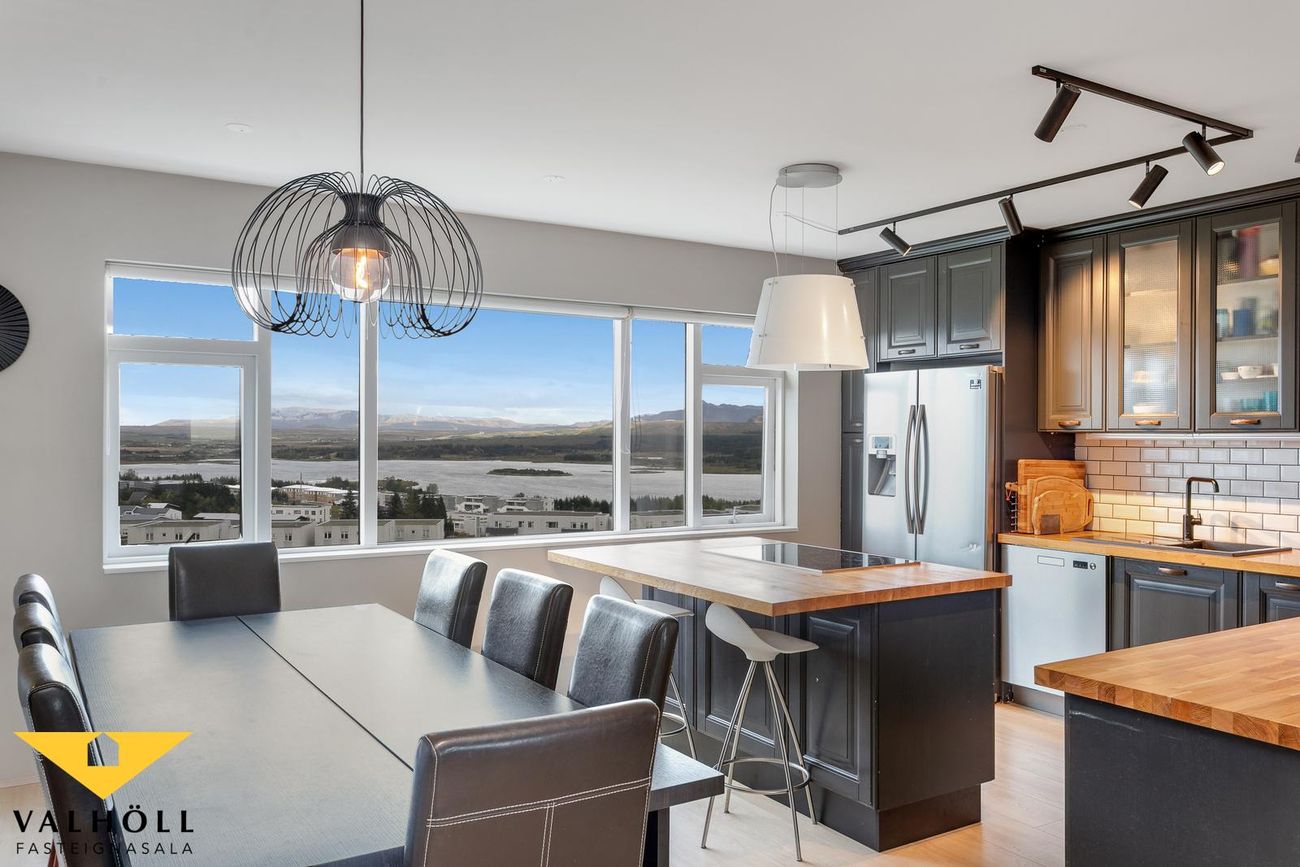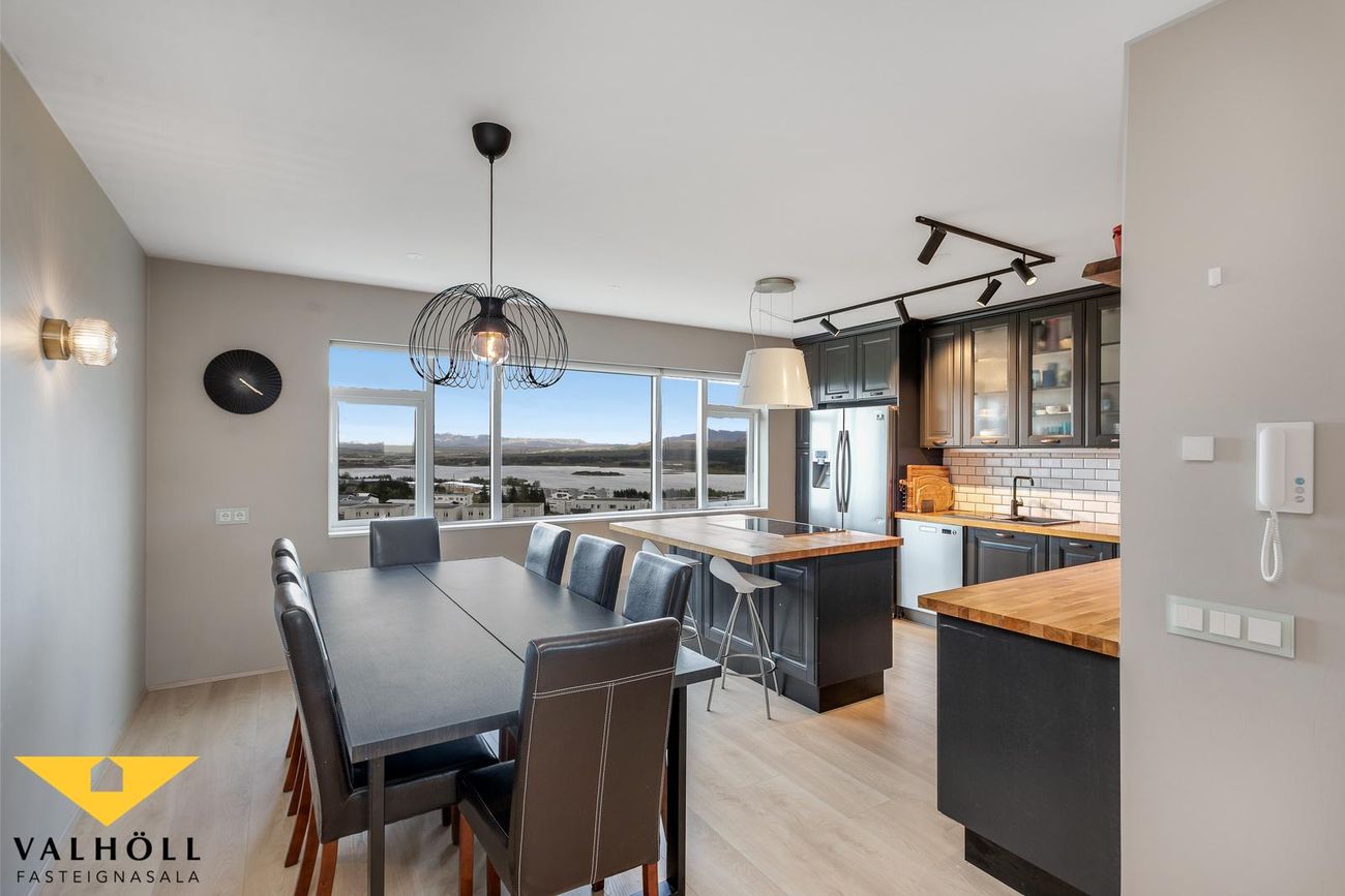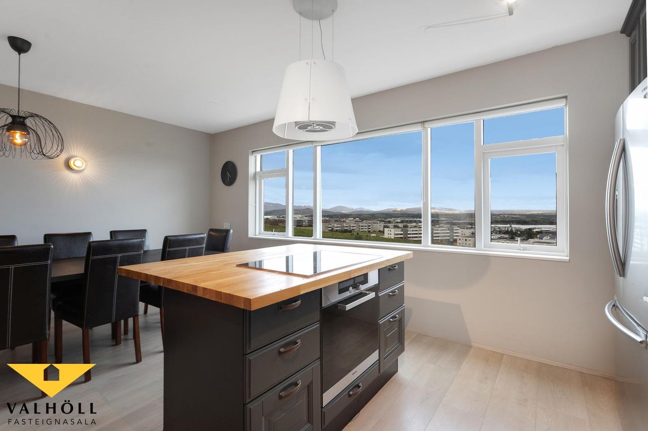 Eldhús er opið með borðstofu og stofu með parketi á gólfi, dökkri innréttingu, eyju, Miele spanhelluborði, Miele ofni, borðkrók og mjög stórum glugga með stórfenglegu útsýni til norðausturs m.a. yfir Elliðavatn.