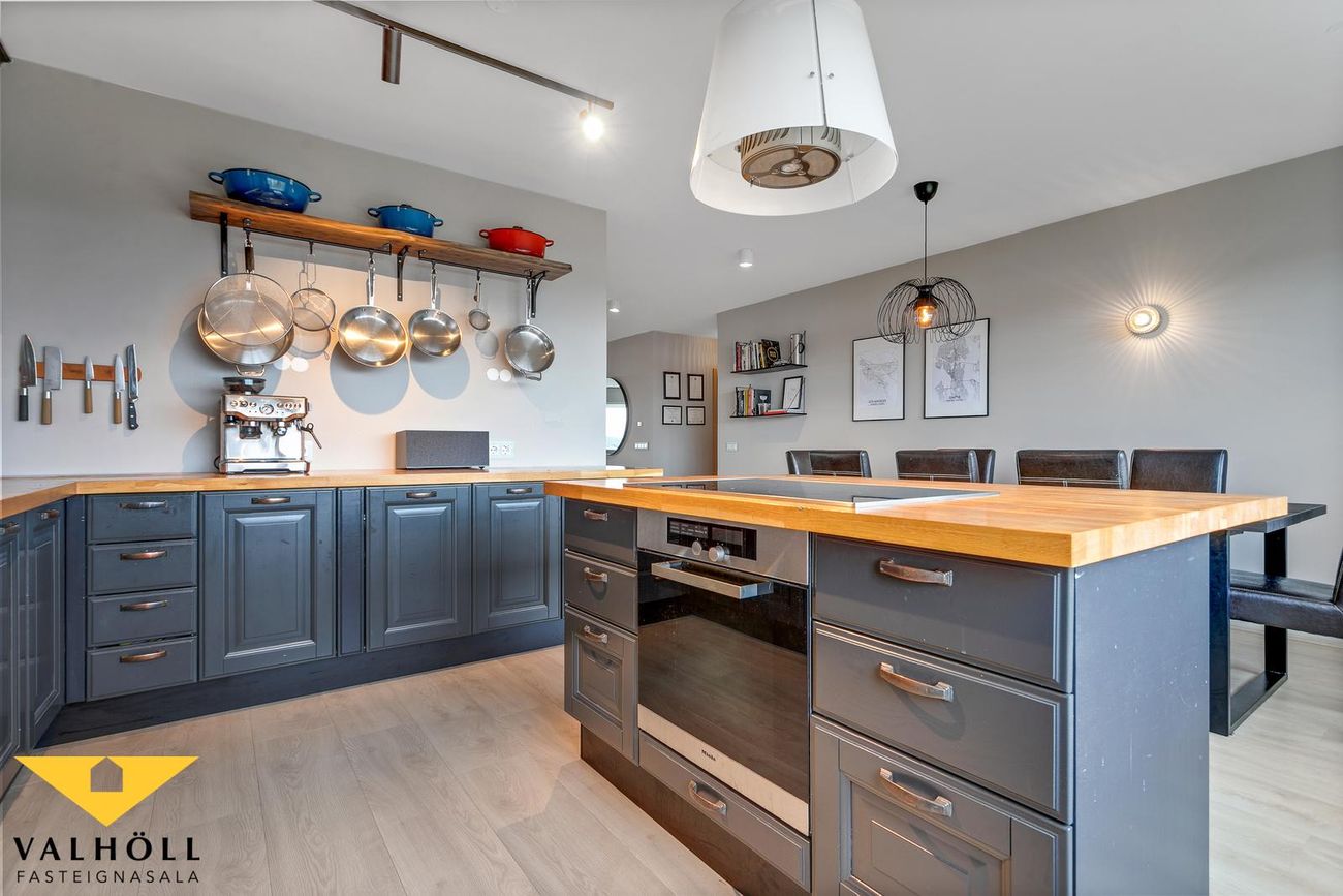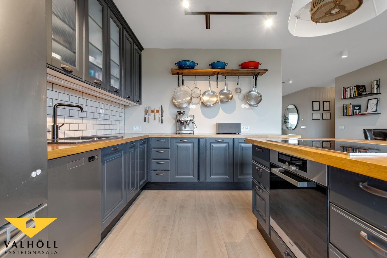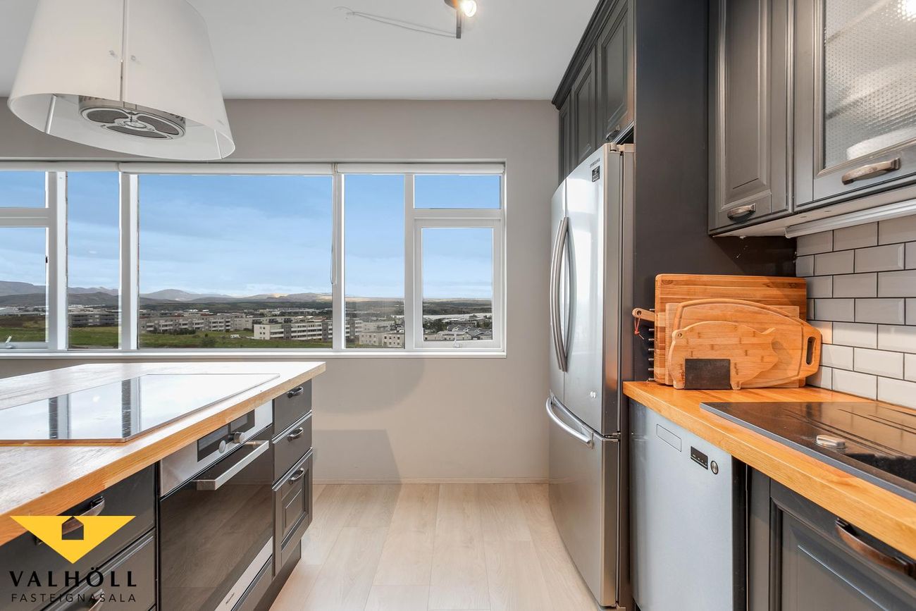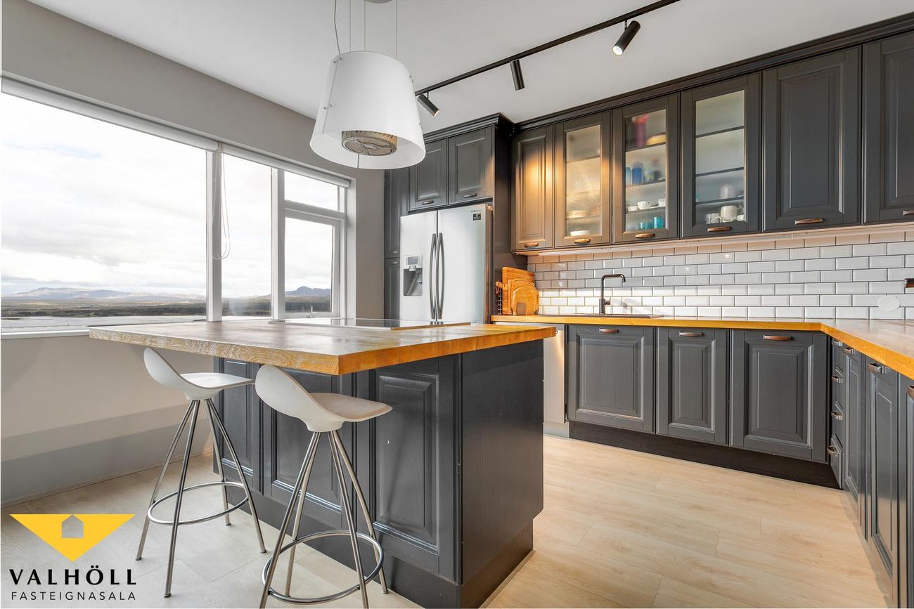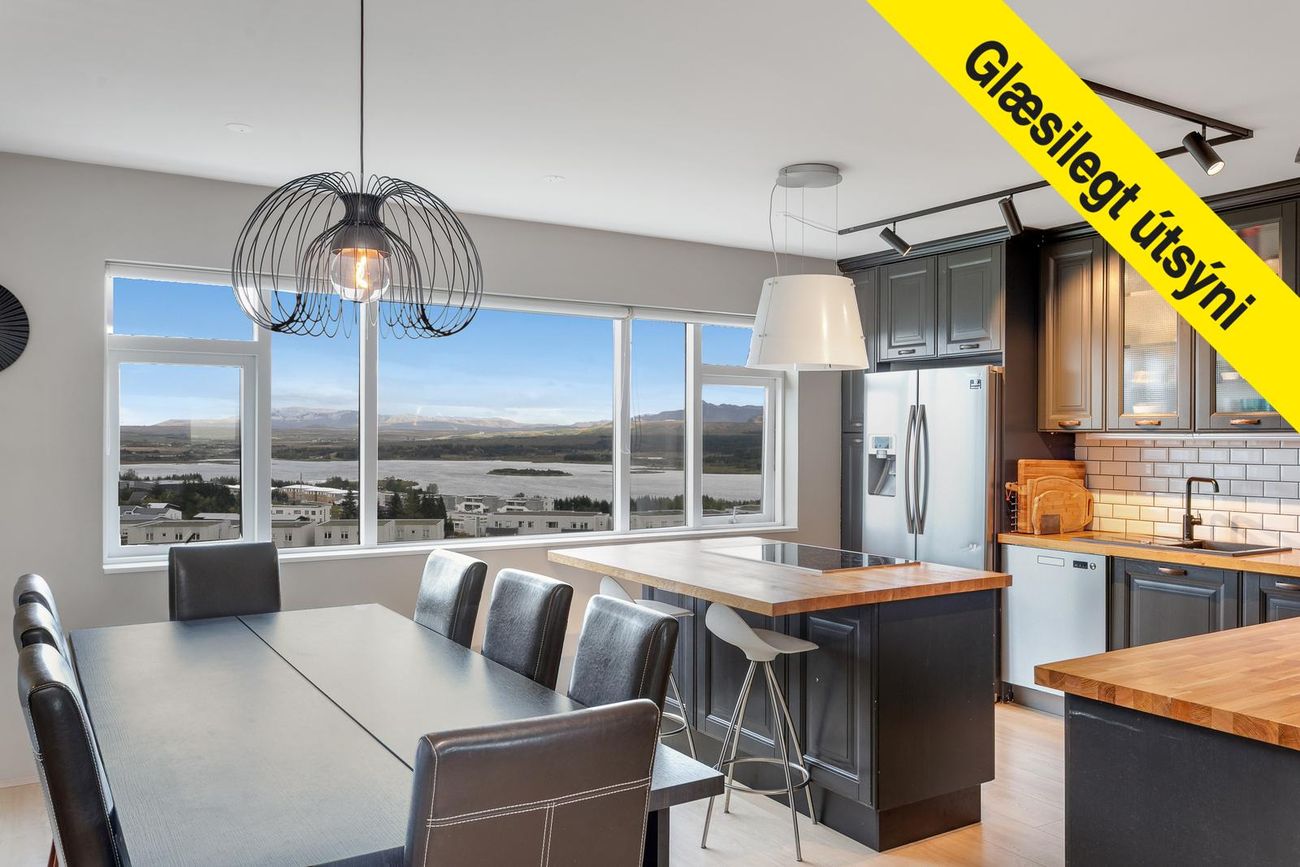 Eldhús er opið með borðstofu og stofu með parketi á gólfi, dökkri innréttingu, eyju, Miele spanhelluborði, Miele ofni, borðkrók og mjög stórum glugga með stórfenglegu útsýni til norðausturs m.a. yfir Elliðavatn.