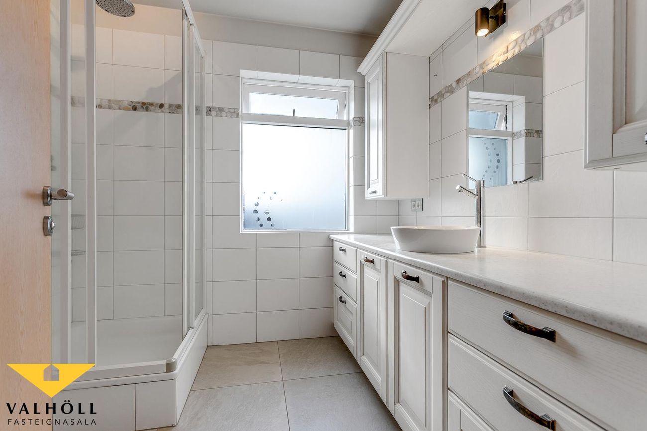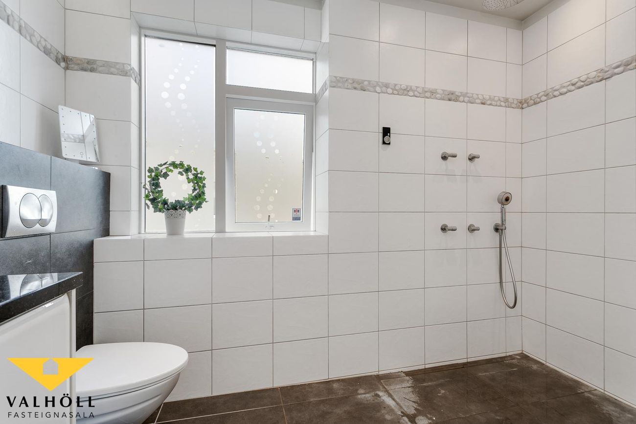 Baðherbergið er flísalagt í hólf og gólf, með fallegri innréttingu, stórum vaski glugga og rúmgóðri flísalagðri sturtu.