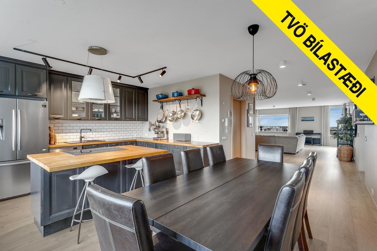 Tvö sér bílastæði hlið við hlið í lokaðri bílageymslu. Búið að setja upp rafhleðslukerfi í húsinu og þarf eingögnu að setja upp stöð.