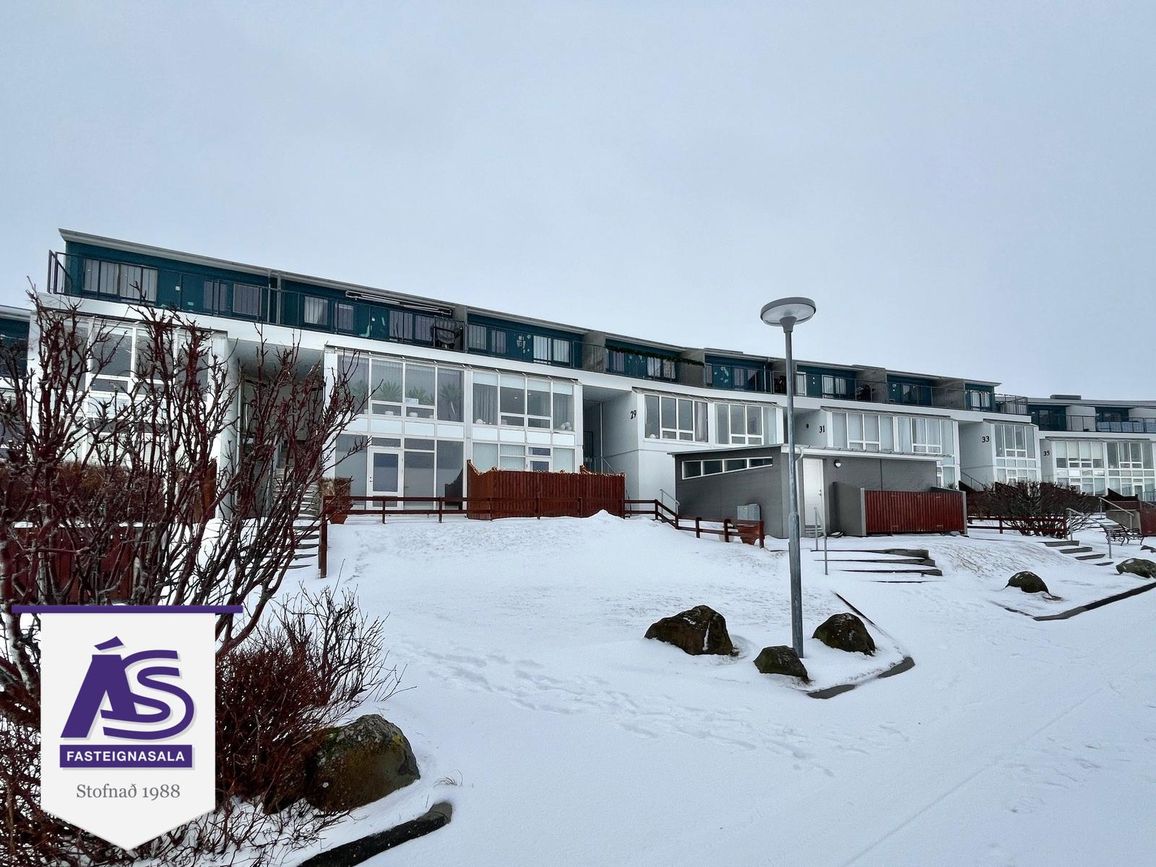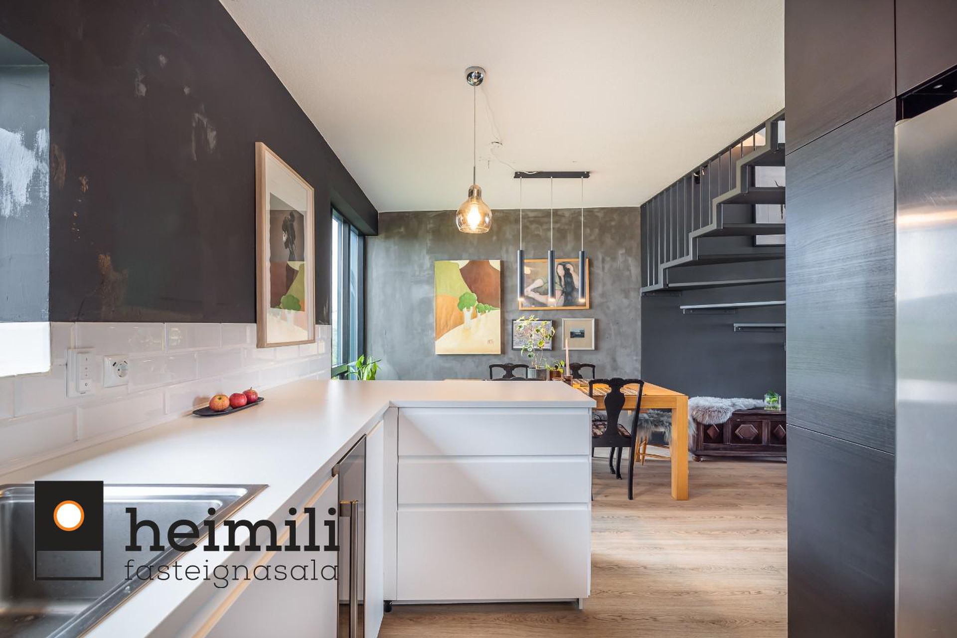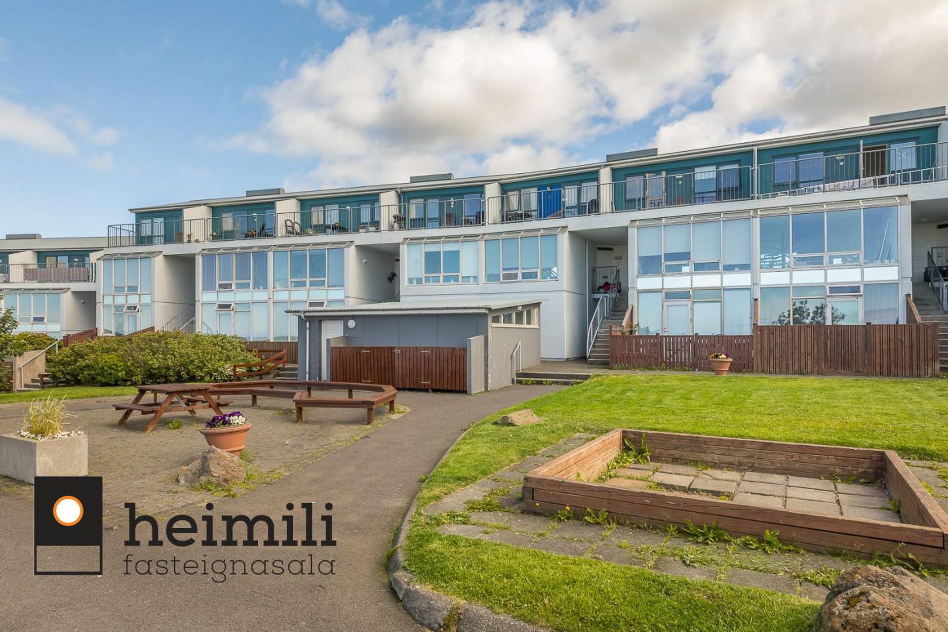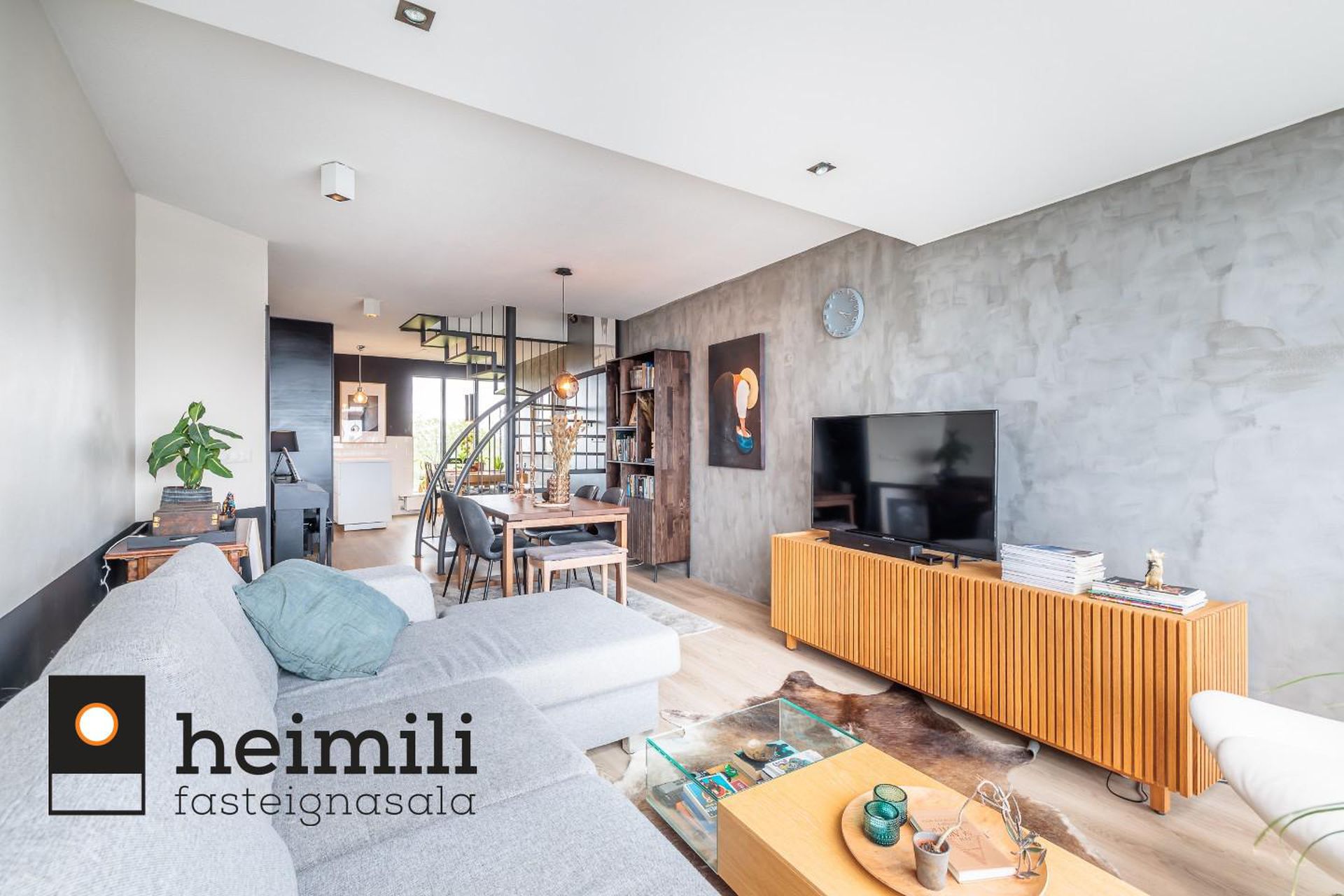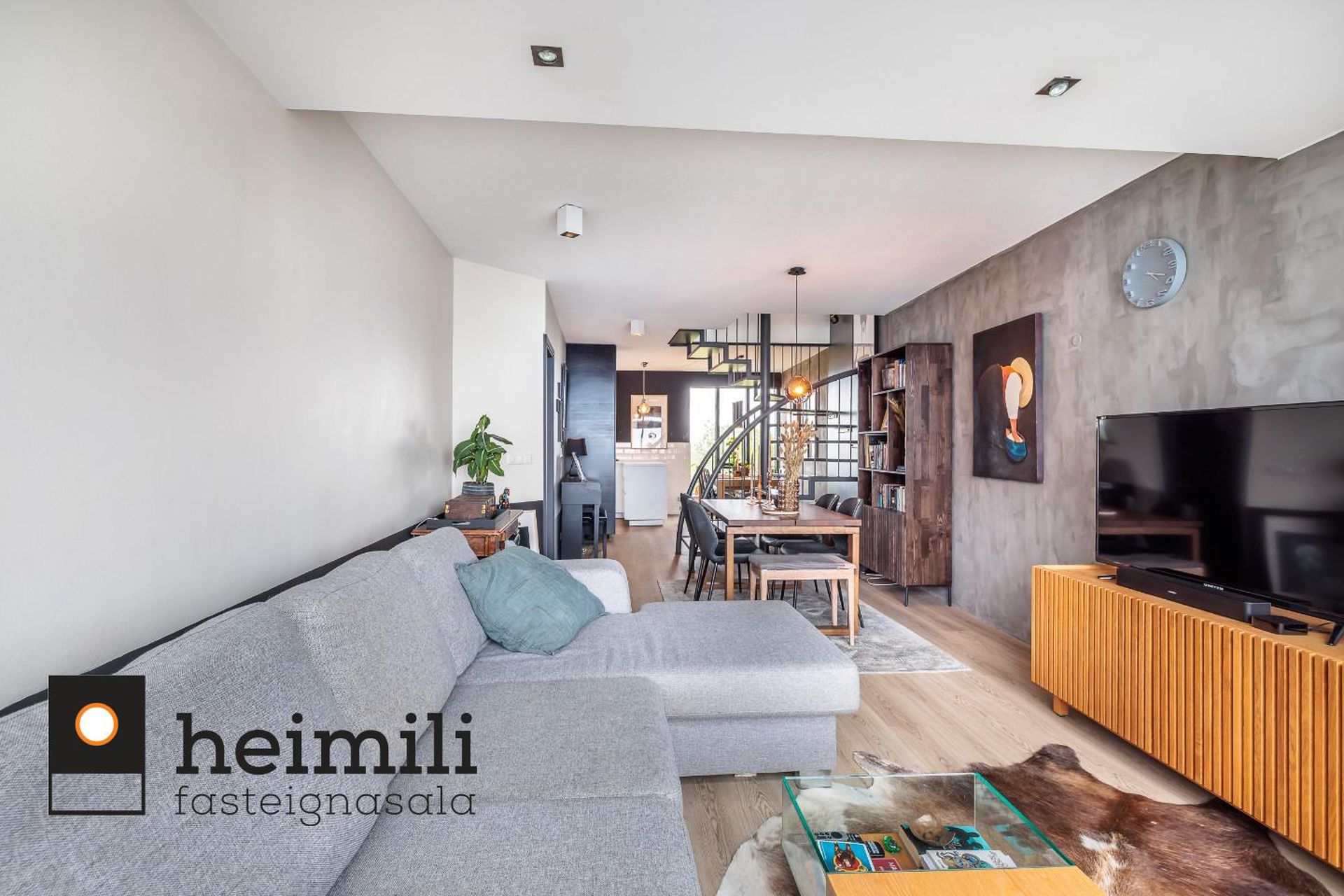 106,1 fm íbúð á tveimur hæðum með 4 herbergjum, sér stæði í lokaðri bílageymslu og sameiginlegri geymslu.