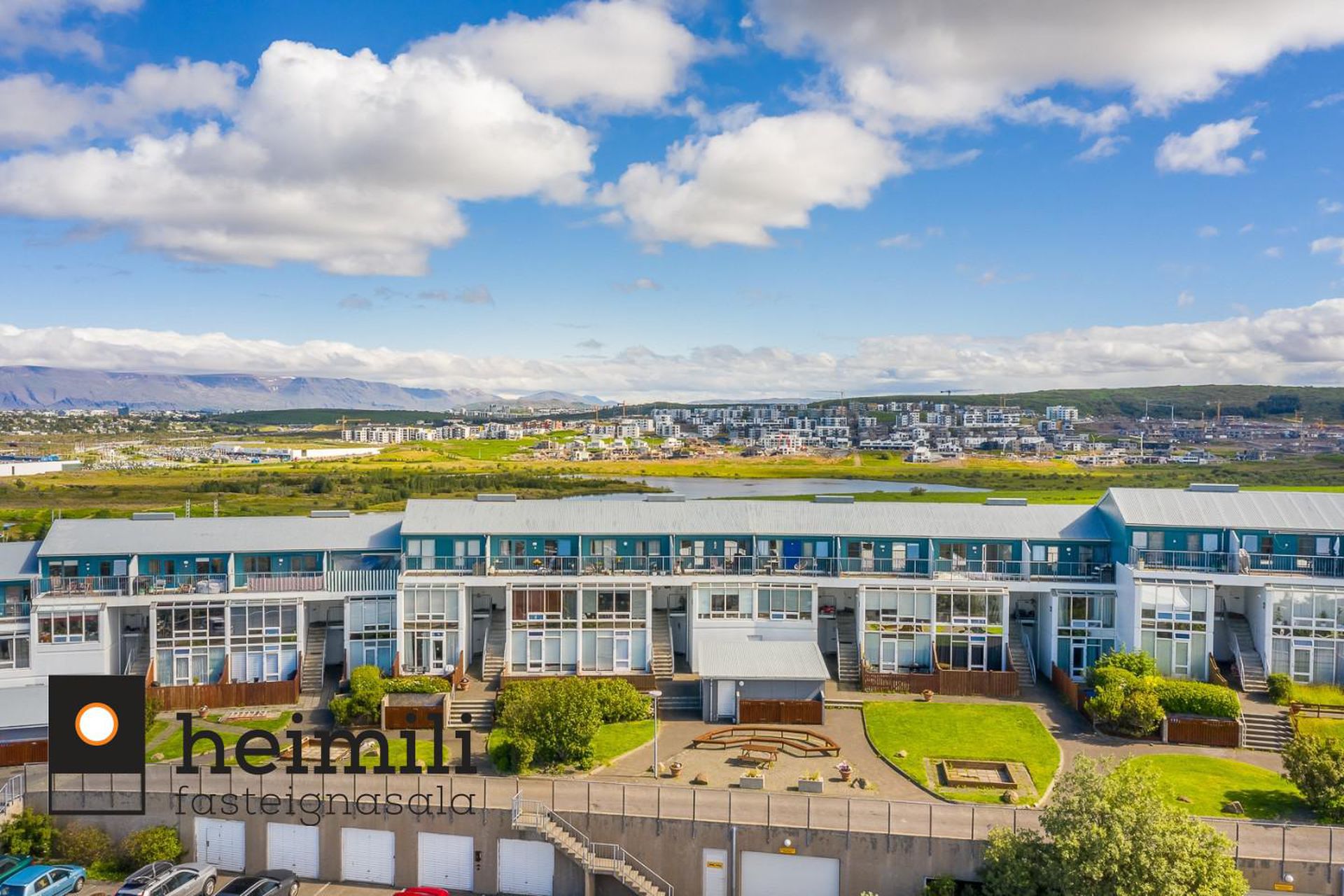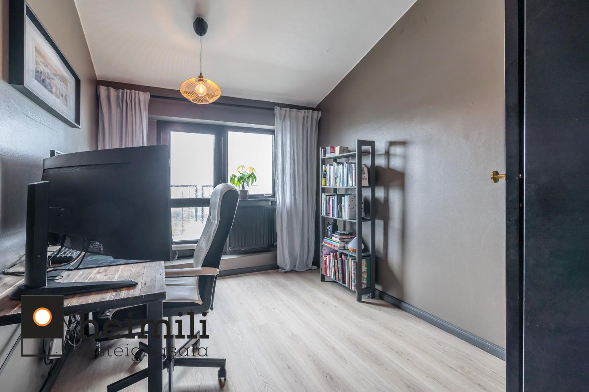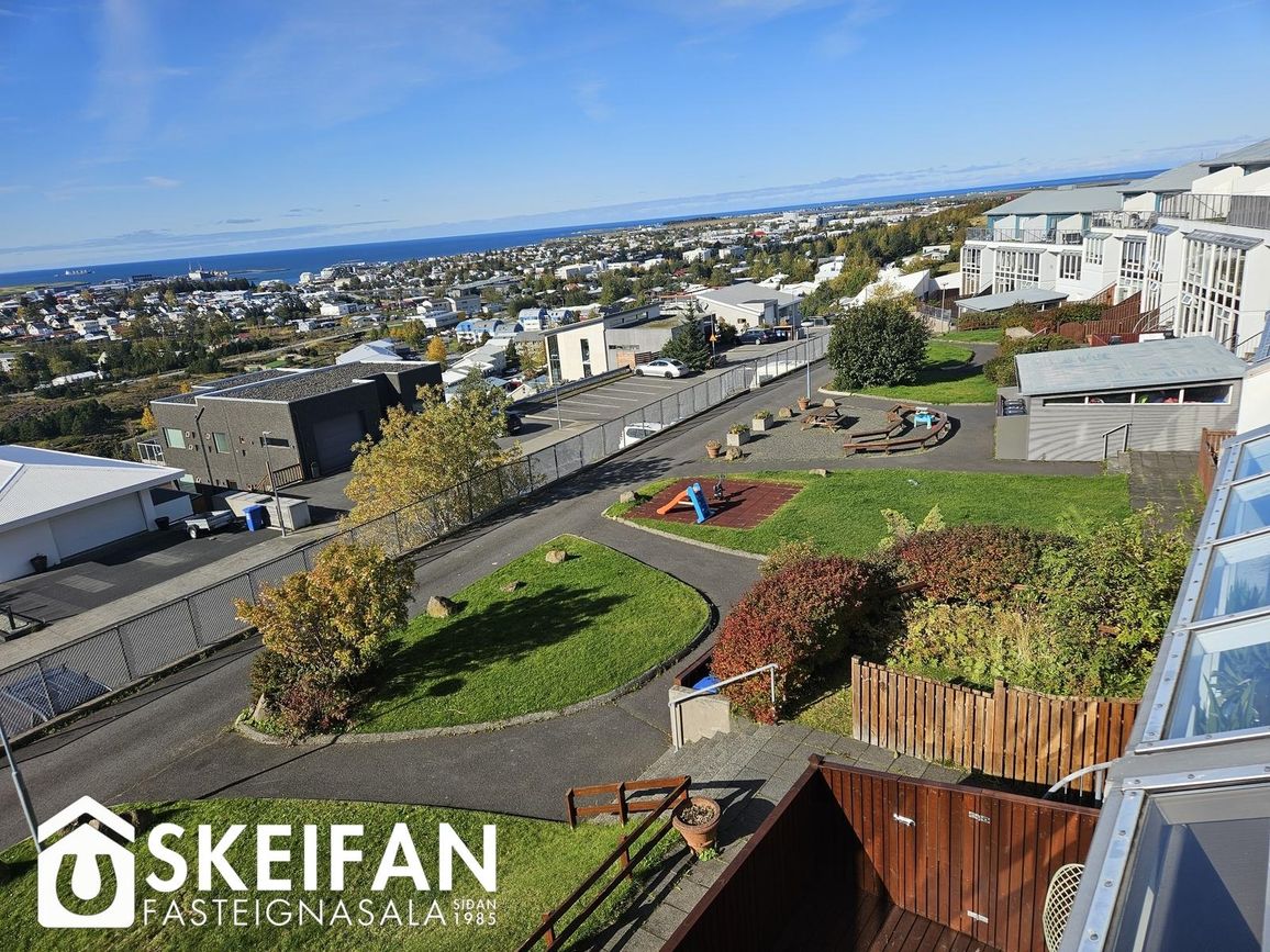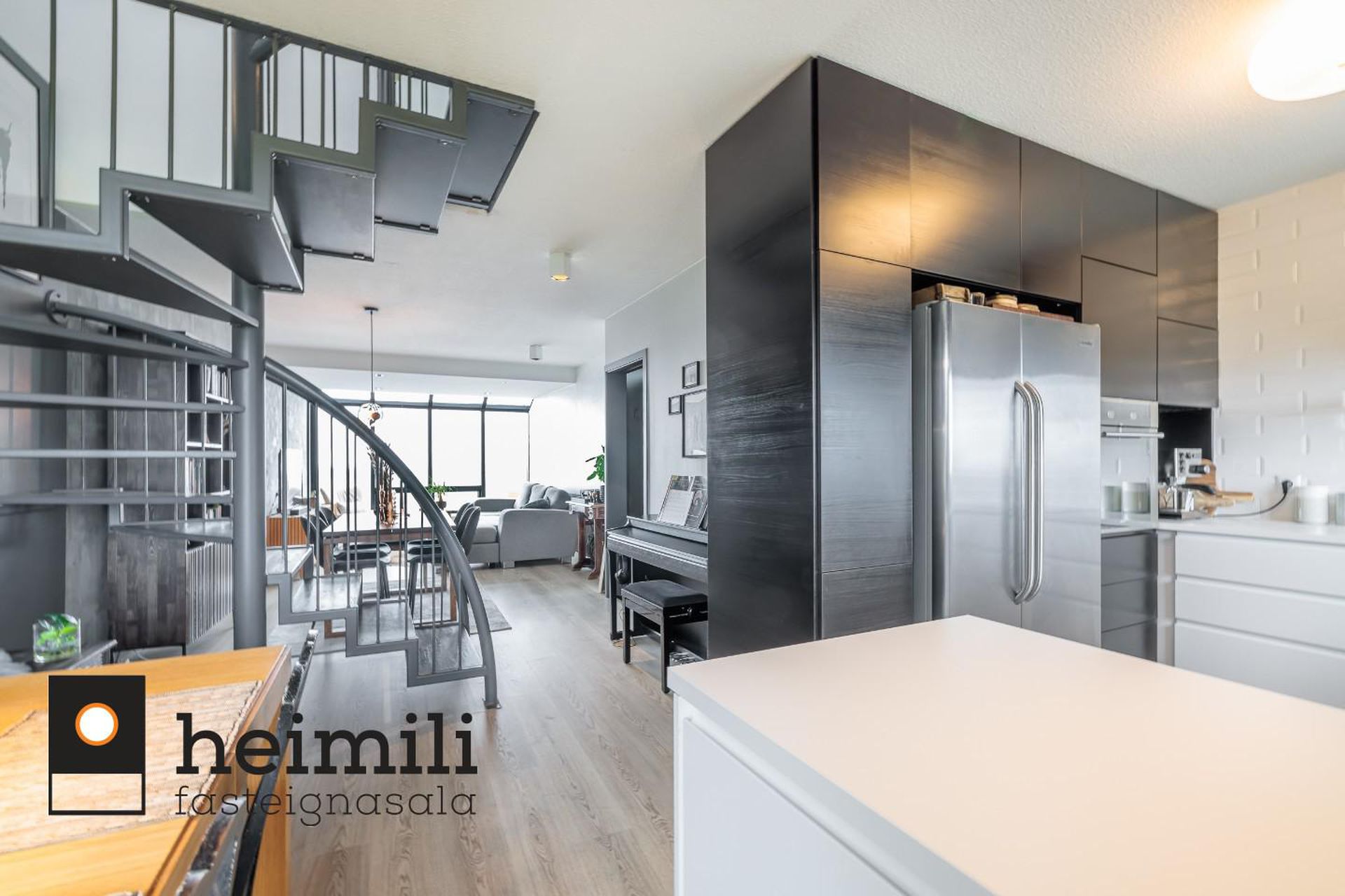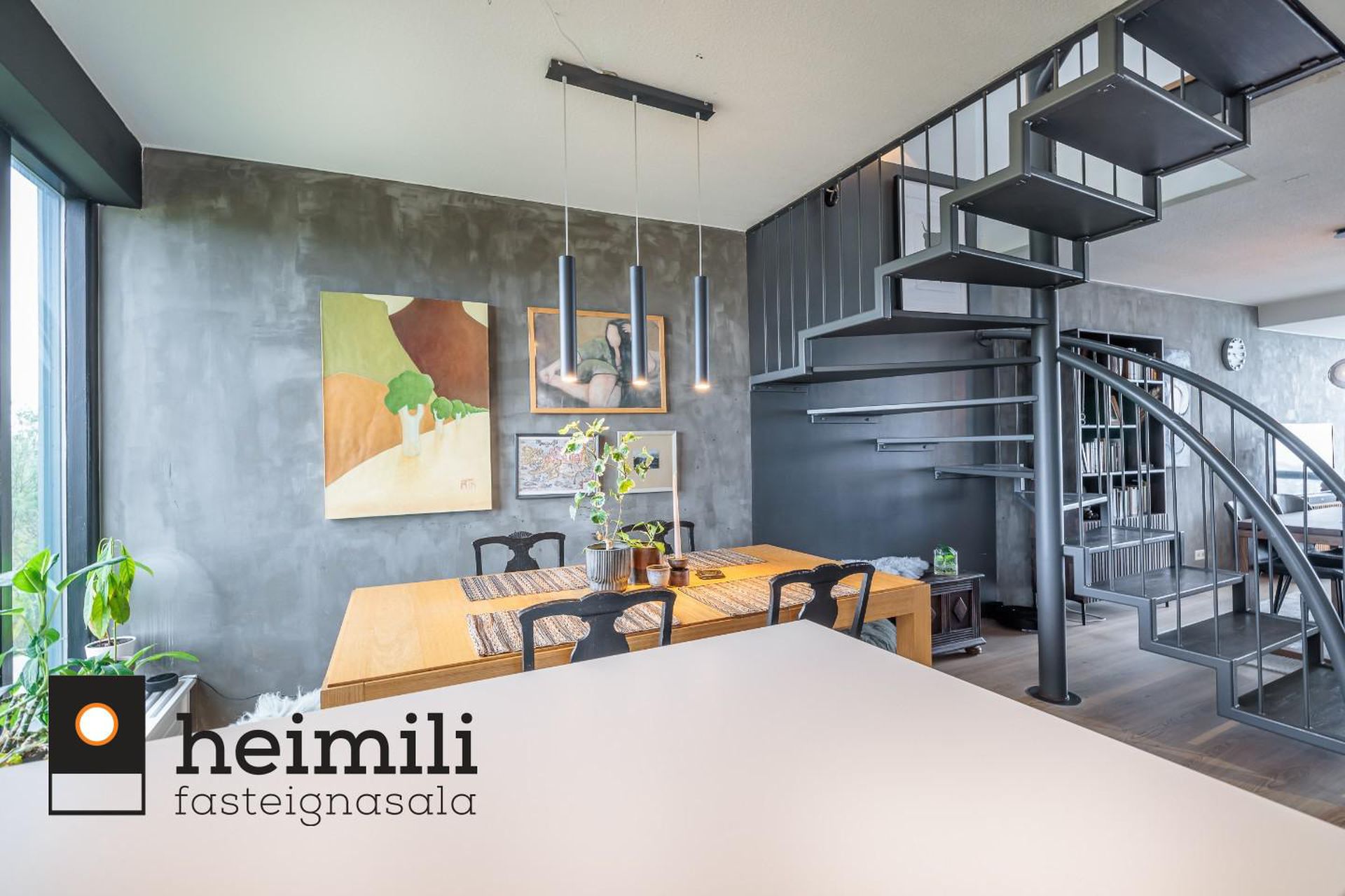 106,1 fm íbúð á tveimur hæðum með 4 herbergjum, sér stæði í lokaðri bílageymslu og sameiginlegri geymslu.