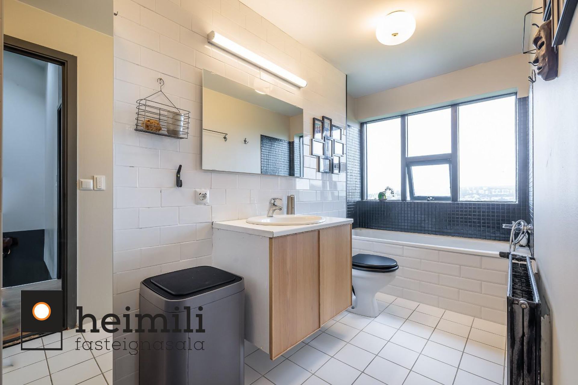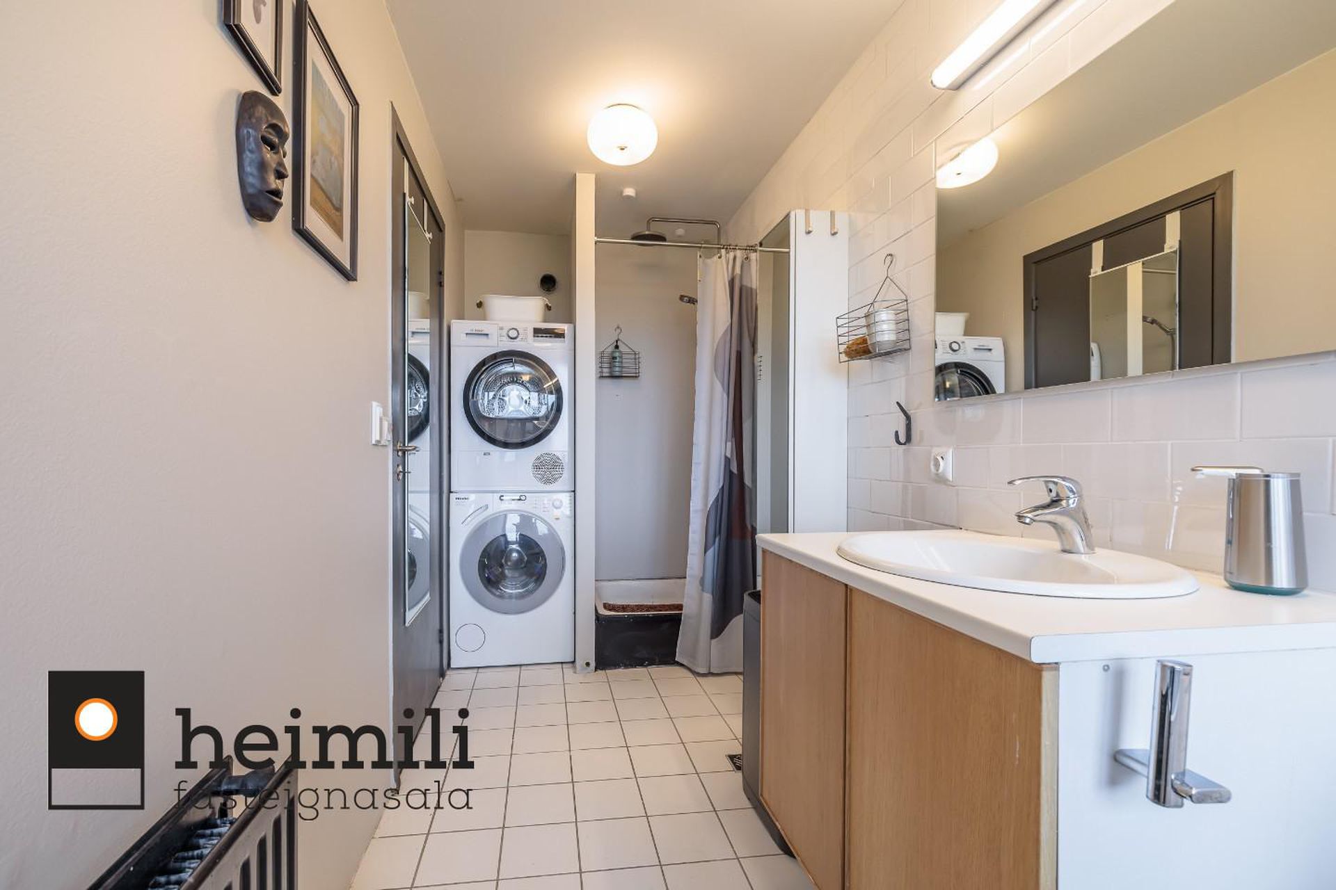 Baðherbergi með baðkari, sturtu og flís á gólfi og veggjum. Þvottaaðstaða í baðherbergi.