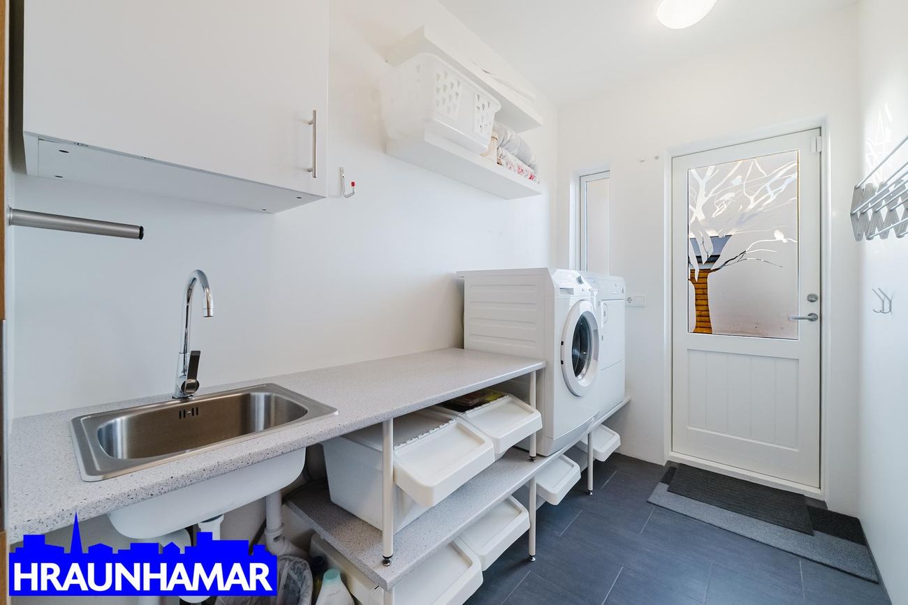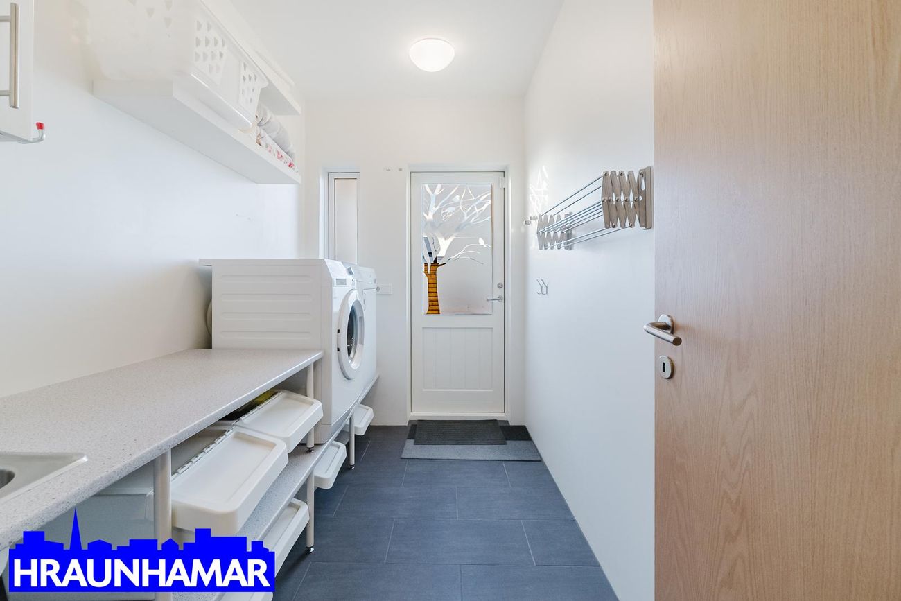 Þvottahús með innréttingu og þaðan er utangegnt út í garðinn.