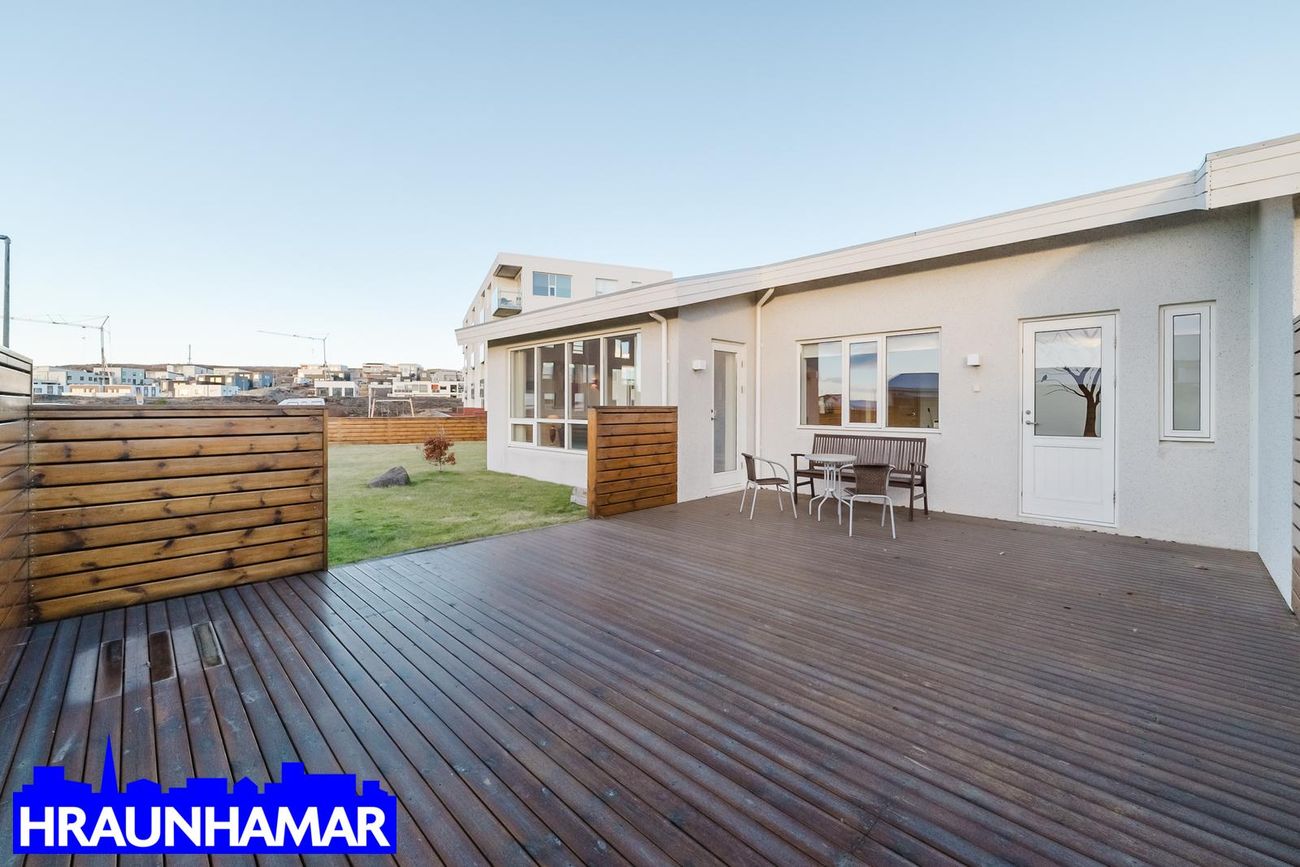 Ytra umhverfið: Lóðin er falleg með verönd með skjólgirðingu. Hiti í bílaplaninu. Lóðin er afgirt með timburgirðingu.