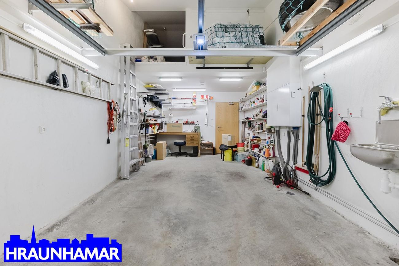 Fínn bílskúr með aðgengi heitu og köldu vatni, hátt til lofts. yfir bílskúrunum er gott geymsluloft yfir hluta skúrsins, rafdrifin opnari.