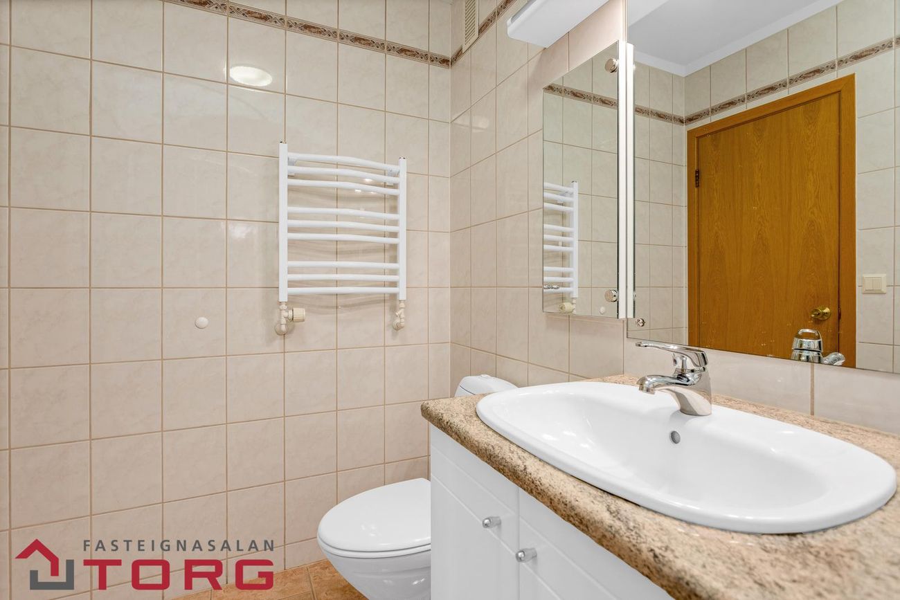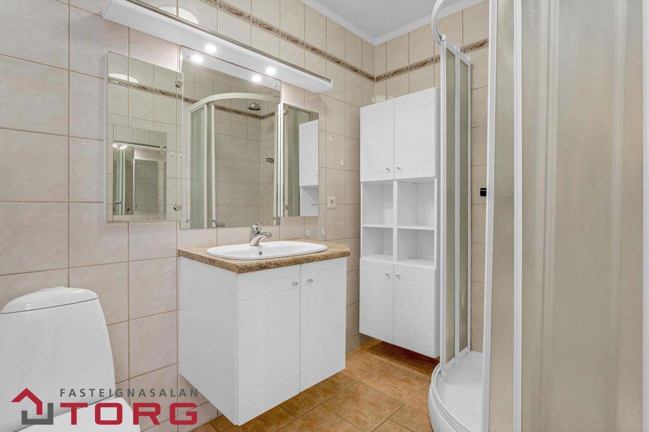 Baðherbergi: Flísalagt í hólf og gólf. Hvít innrétting með innbyggðum glerskáp fyrir ofan. Sturtuklefi, handklæðaofn og salerni á gólfi.