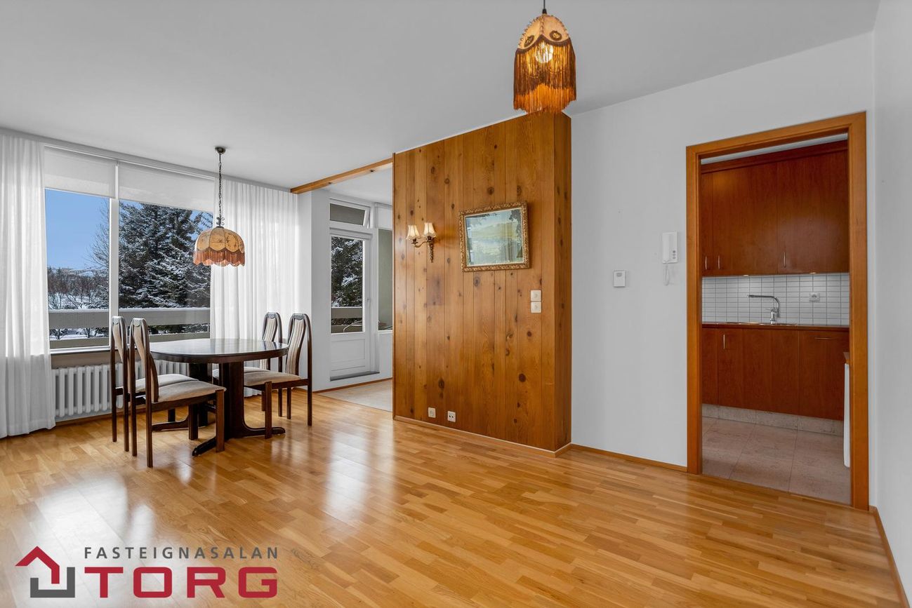 Stofa og borðstofa: Rúmgóð stofa og borðstofa með gluggum eftir heilum vegg. Útgengi er út á góðar svalir í suðaustur sem snúa inn í sameiginlegan garð með leiksvæði. Timburflísar eru á svalargólfi.
