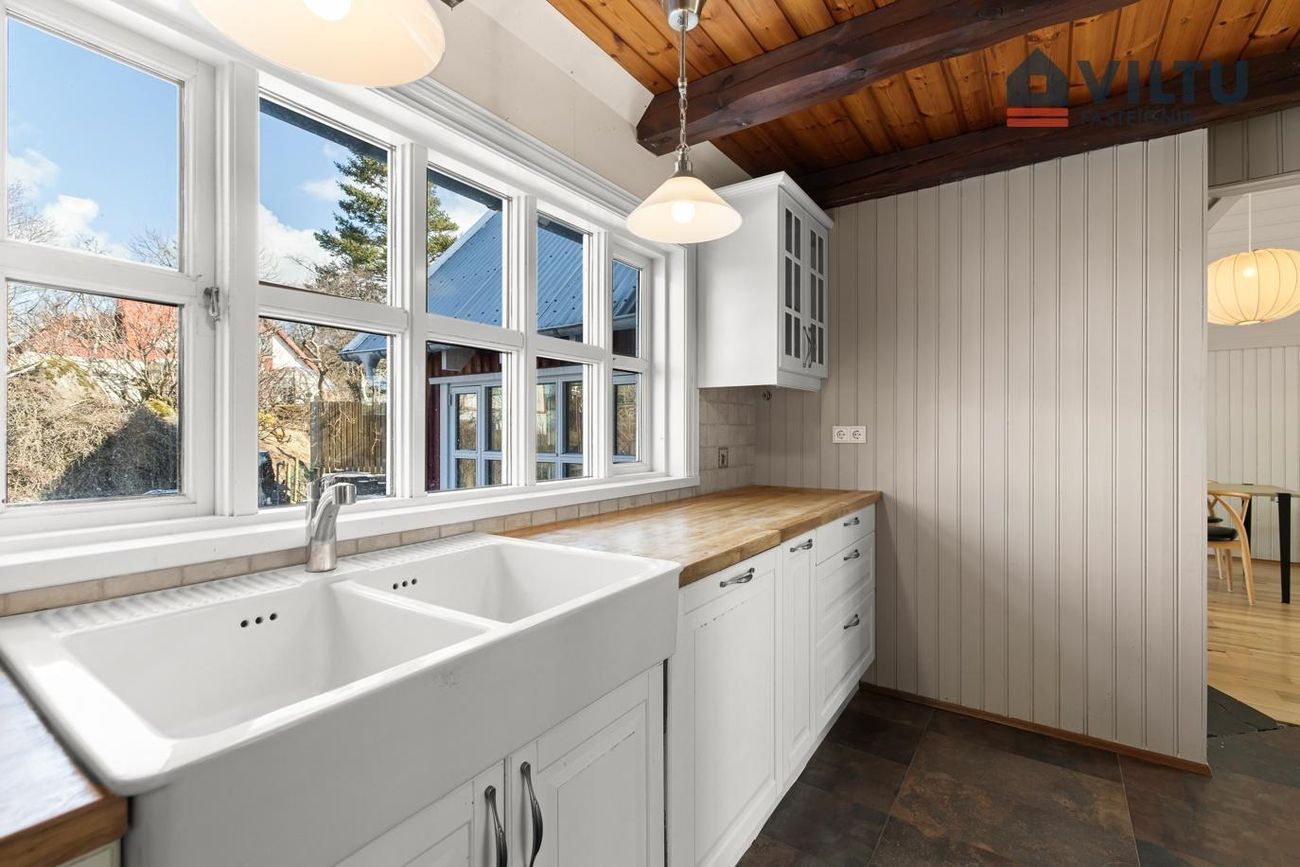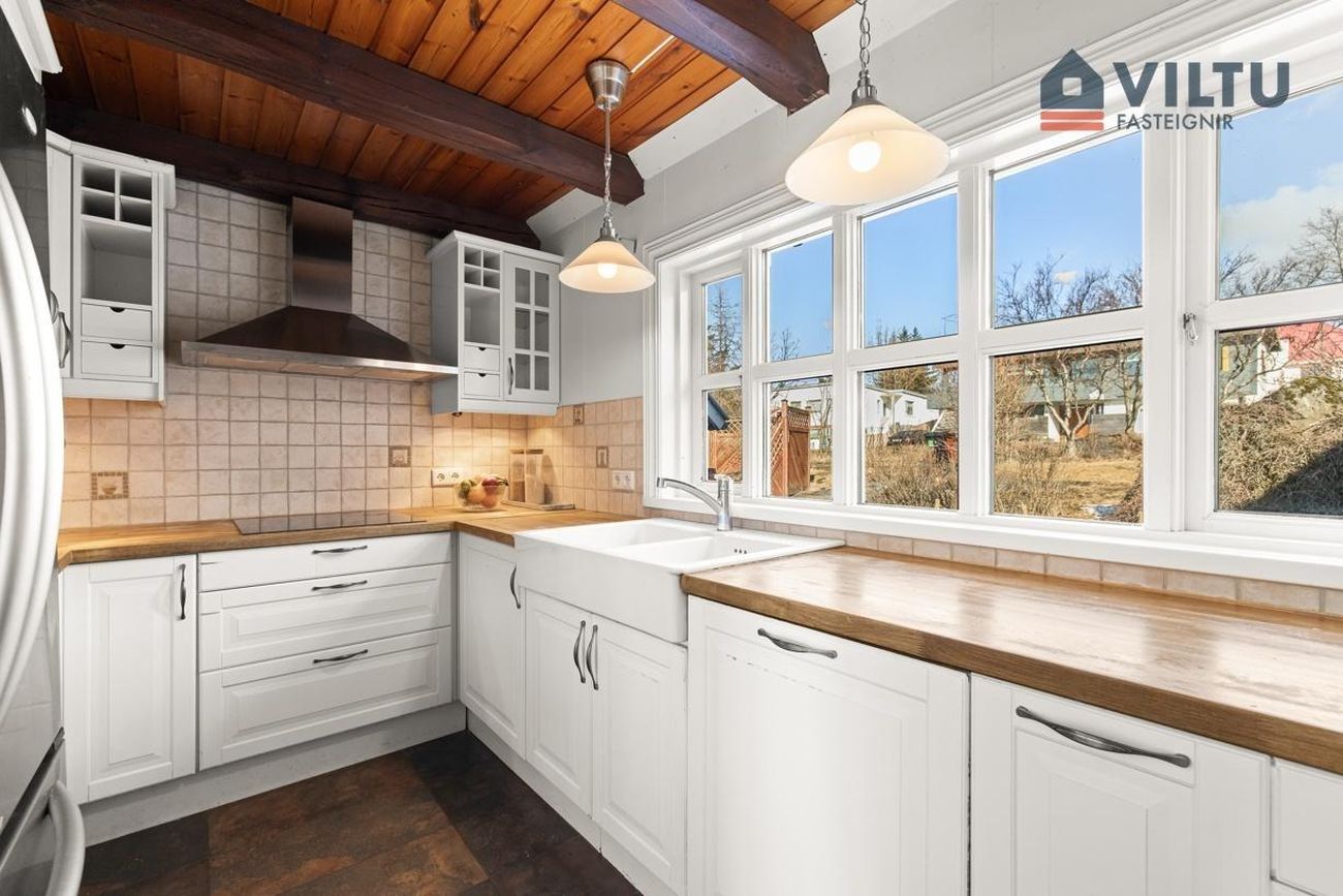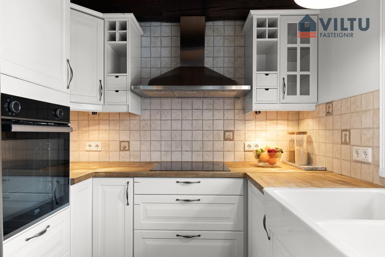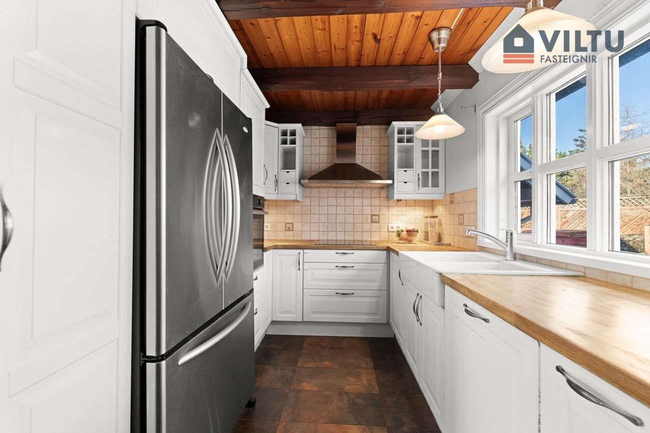 Eldhús Klassísk hvít innrétting með fulningahurðum og límtrésborðplötum. Ofn í vinnuhæð, innbyggða uppþvottavél og amerískan ísskáp. Heimilistæki hafa verið endurnýjuð að hluta.