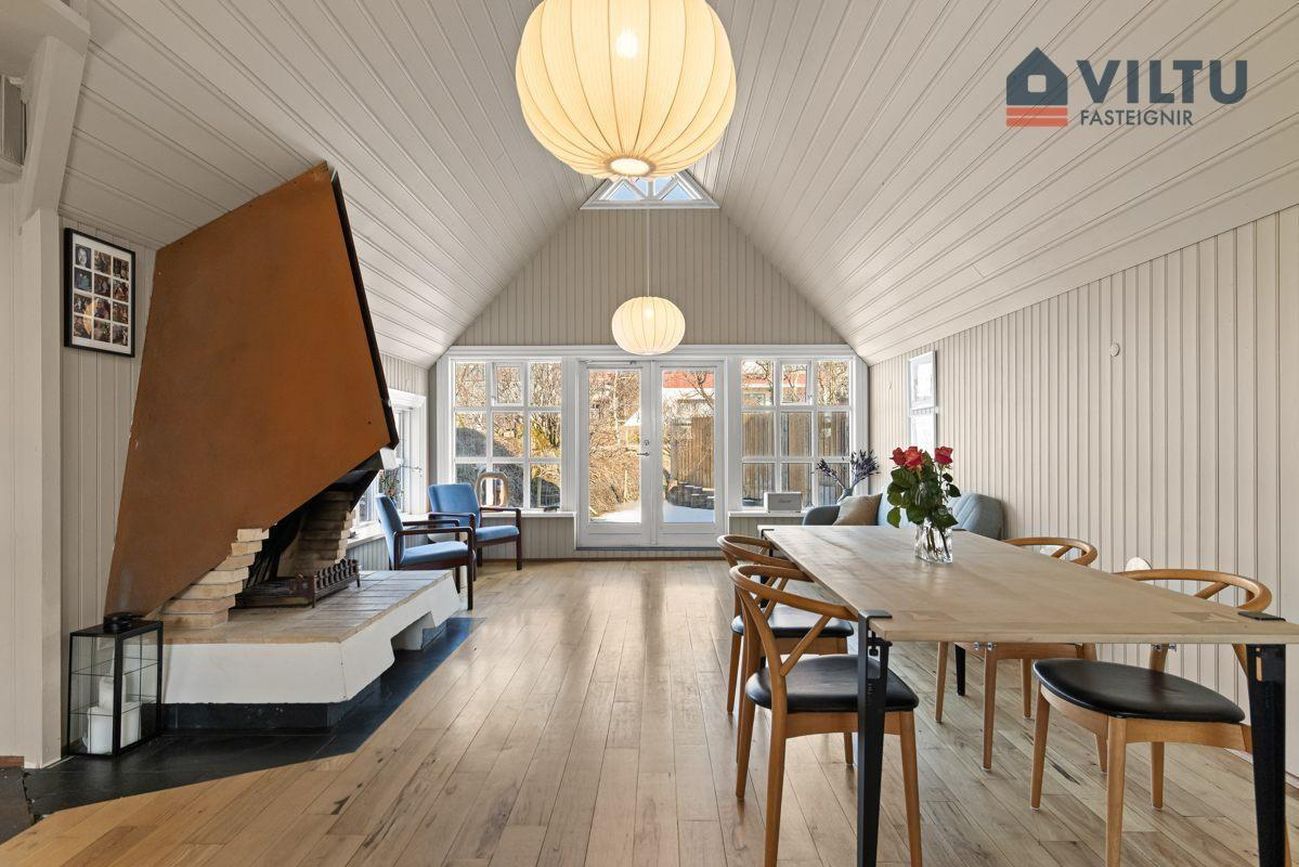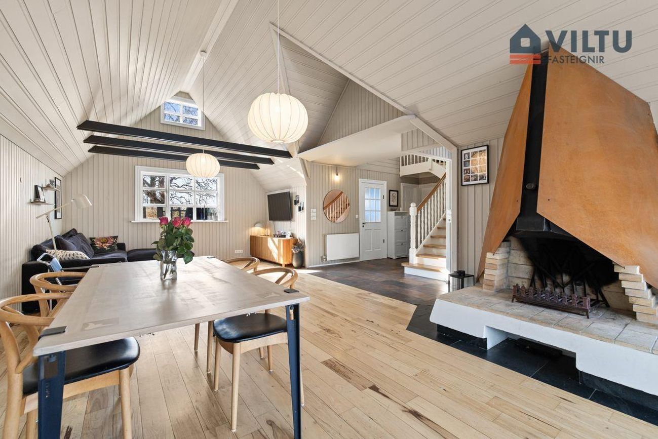 Stofa/Borðstofa: Samliggjandi í mjög stóru og björtu rými. Aukin lofthæð í öllu rýminu og fallegur arinn setur mikinn svip á það. Þaðan er hægt að gang út í garðinn.