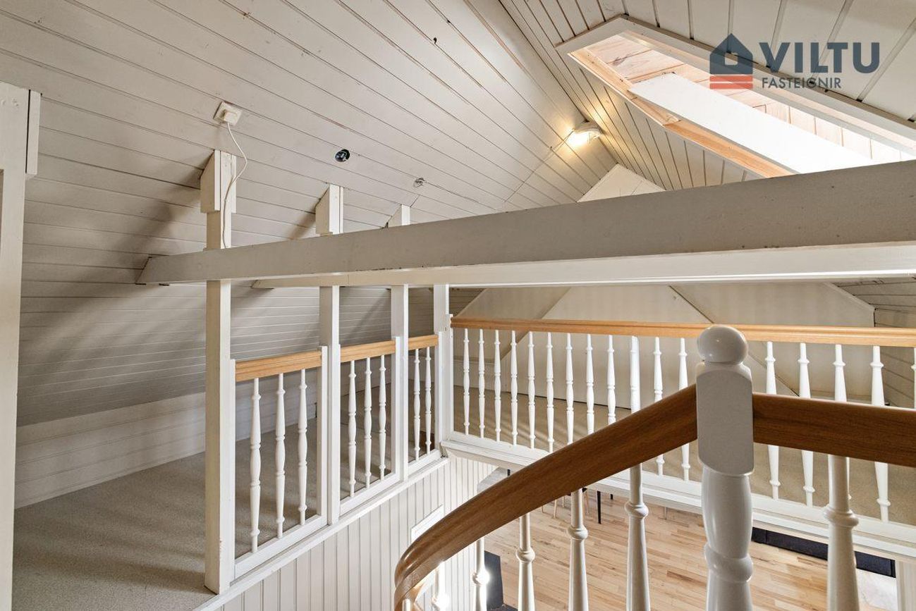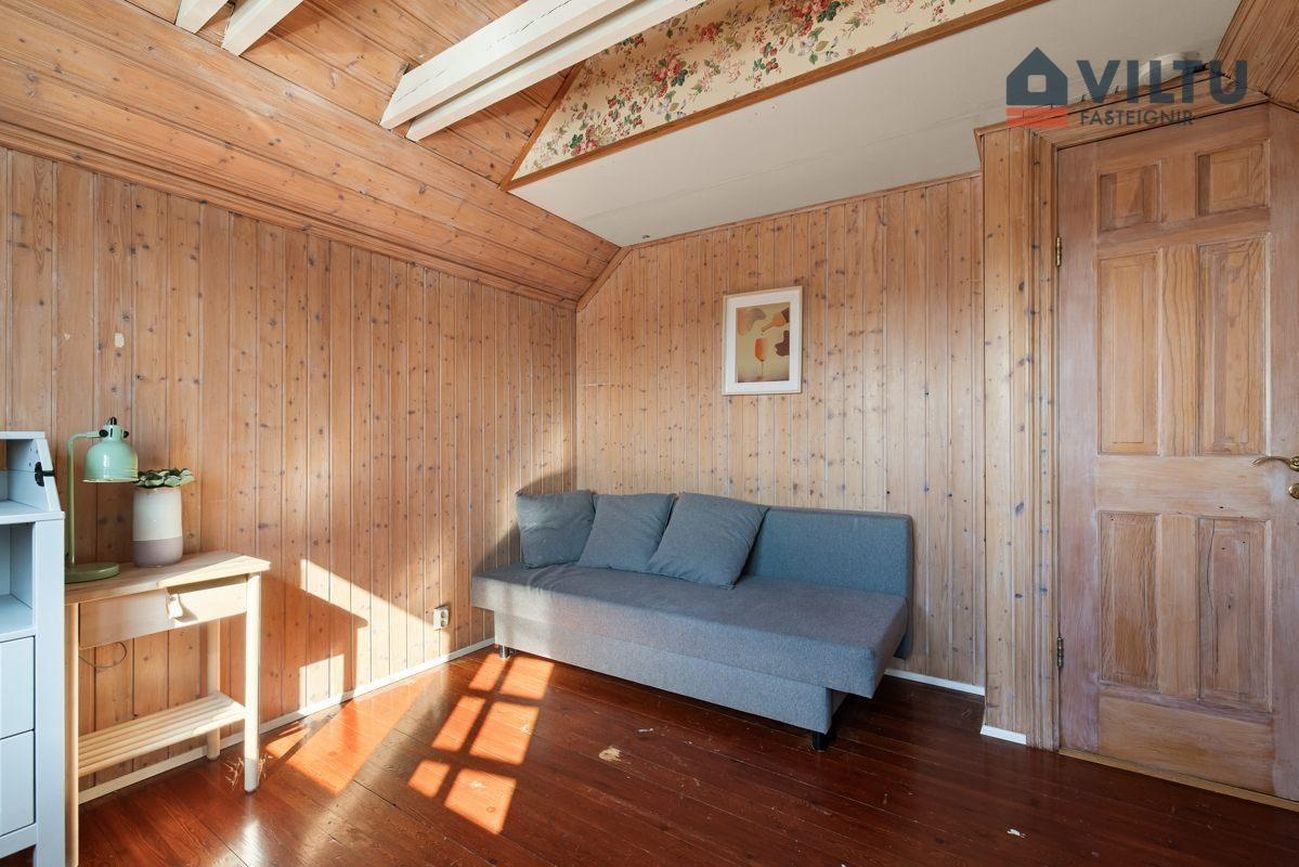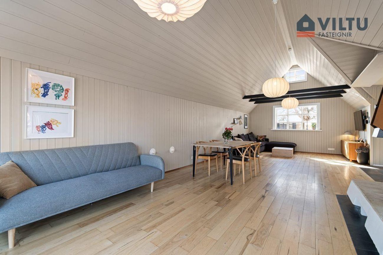 Loft: Meðfram súð er hægt að komast á lítið milliloft sem nýta mætti sem leiksvæði fyrir börn eða fyrir gæludýr