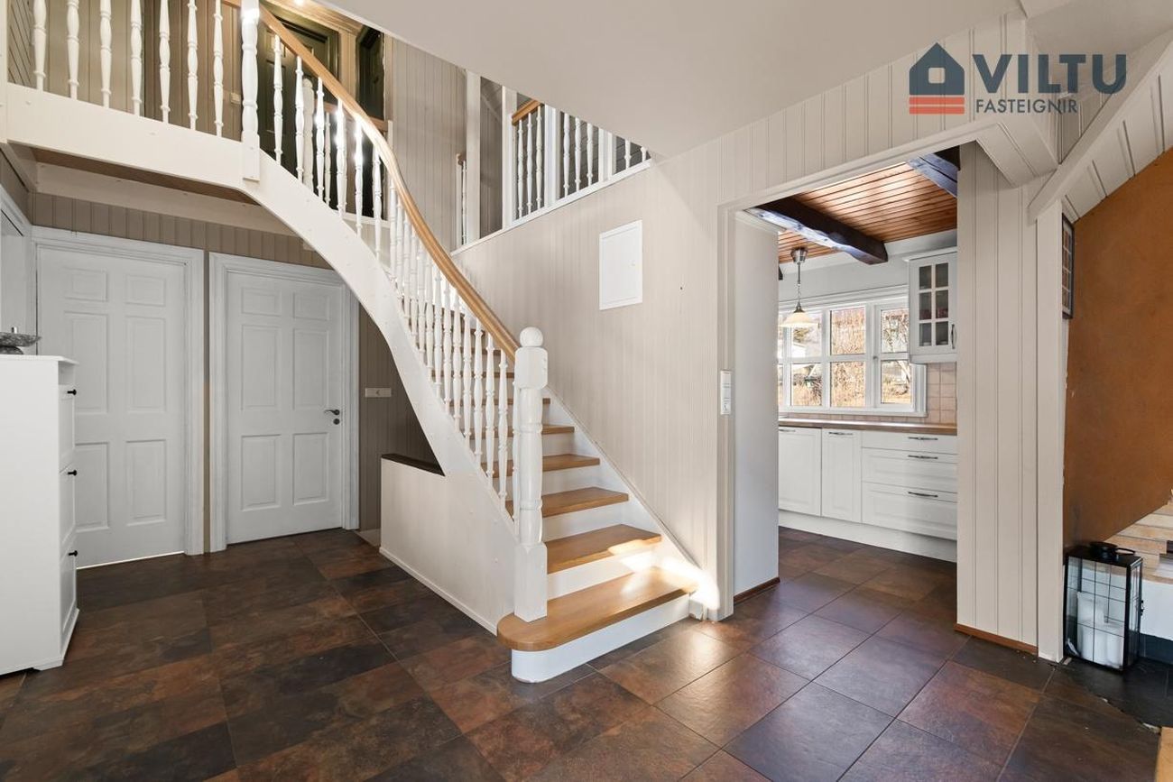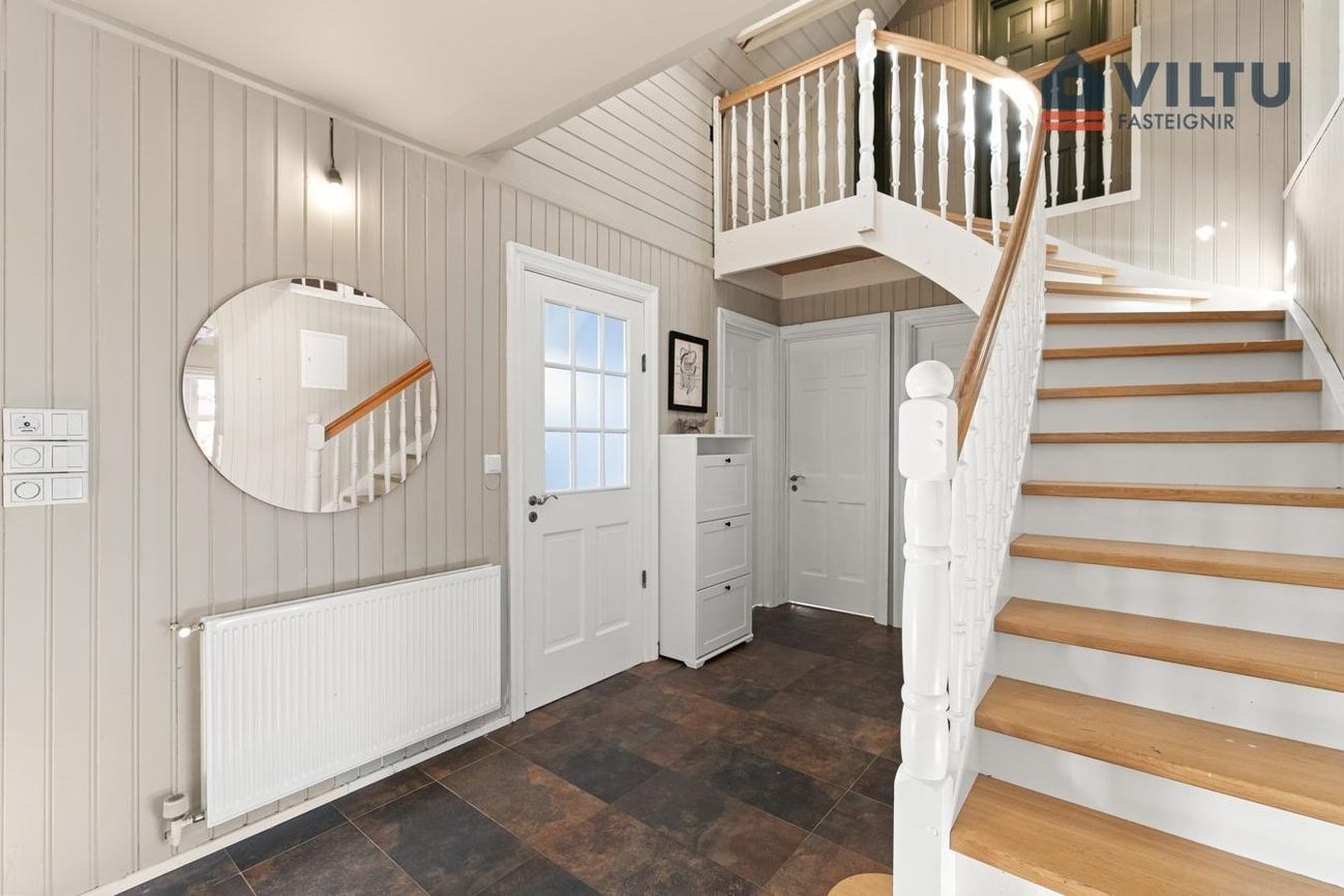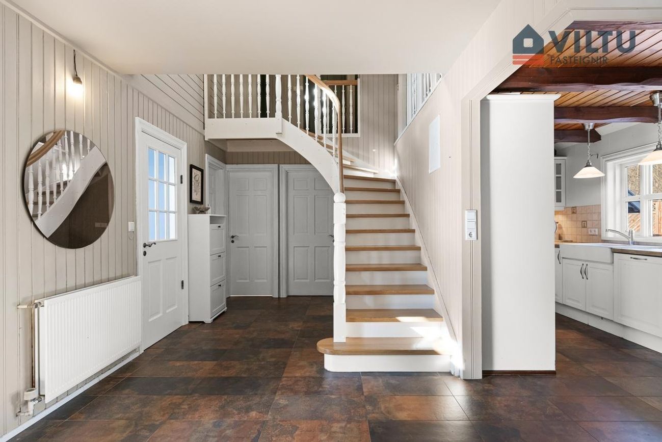 Frá holi er gengið upp á 2. hæð um fallegan parketlagðan stiga. .