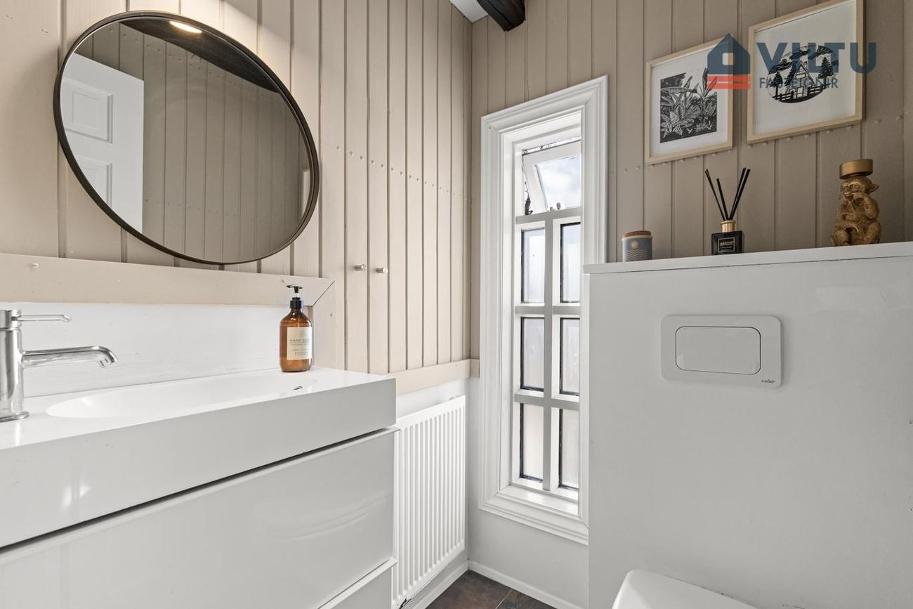 Gestasnyrting: Flísalagt gólf og fallegur panill al veggjum. Upphengt salerni og nýleg nett innrétting.