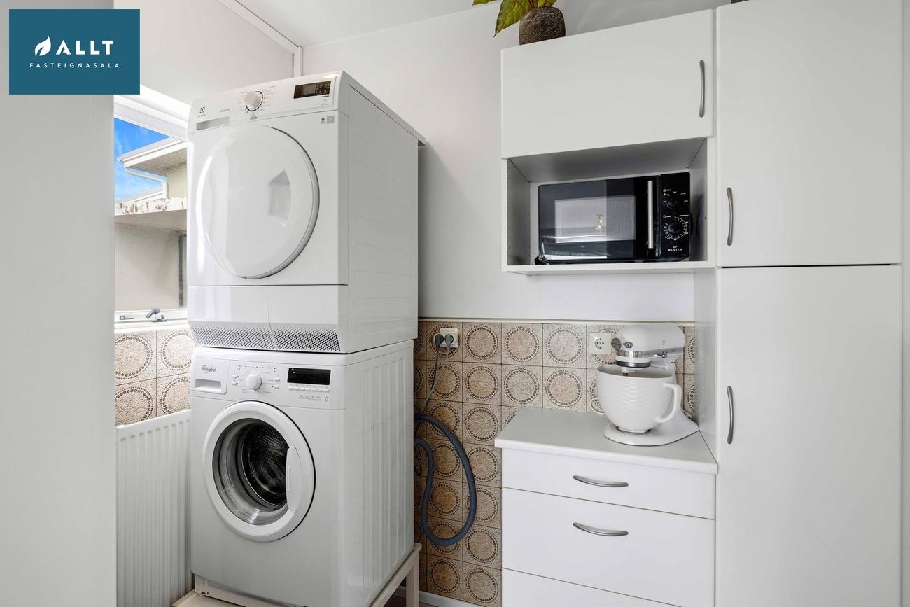 Þvottahús er innaf eldhúsi með glugga, hefur nýlegar flísar á gólfi, aðstaða fyrir þvottavél og þurrkara.