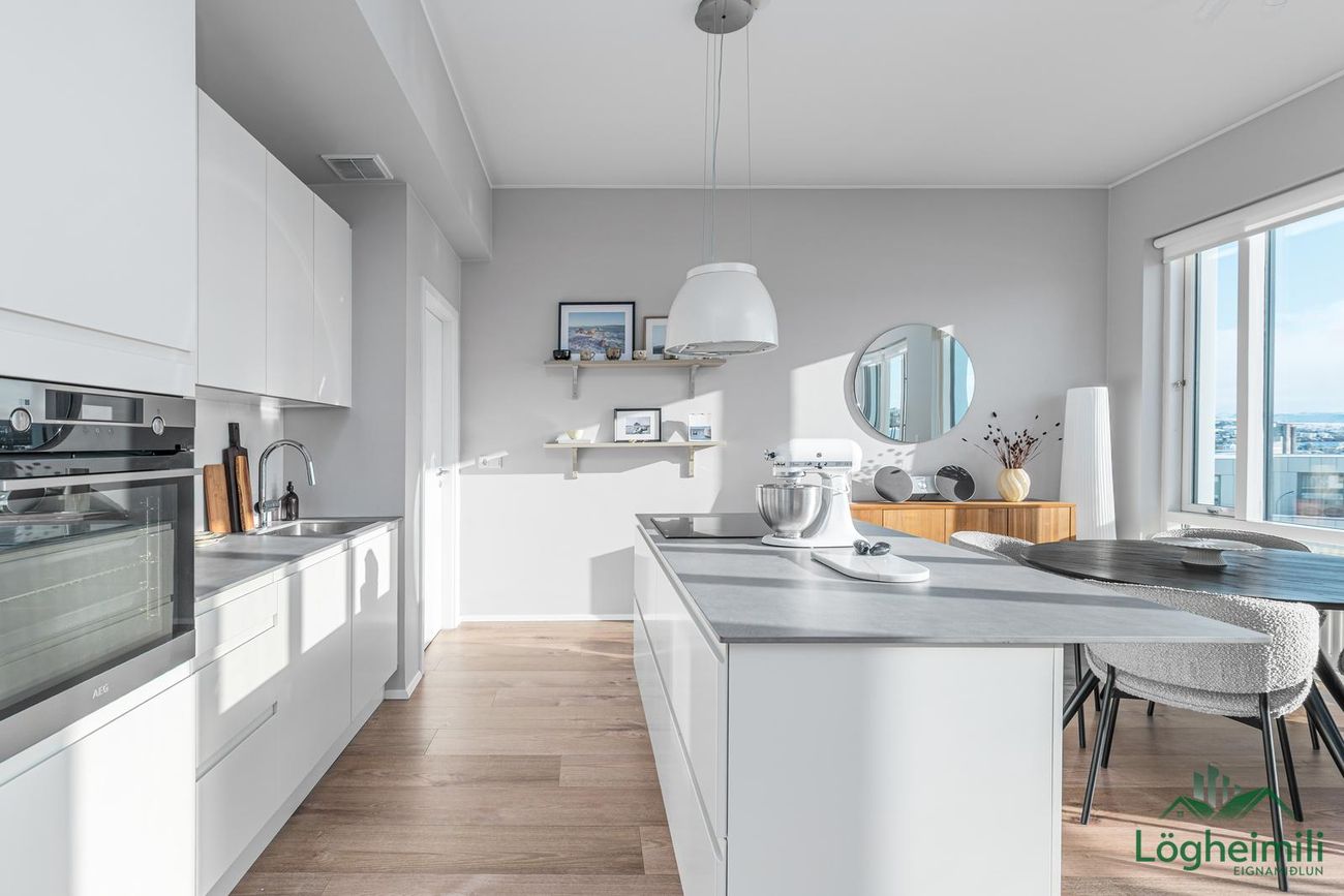 ***EFSTA HÆÐ***STÓRAR SVALIR MEÐ ÚTSÝNI***BÍLASTÆÐI Í BÍLAKJALLARA***Falleg þriggja herbergja íbúð með 3ja metra lofthæð, stórum svölum með miklu útsýni. Íbúðin er miðjuíbúð á efstu hæð í lyftuhúsi með stæði AEG í vinnuhæð, granítflís er á eldhúsbekk. Á móti er eyja með skúffum í, span helluborði frá AEG ásamt gufugleypi, granítflís er á borði á eyjunni, sem rúmar fjóra barstóla.