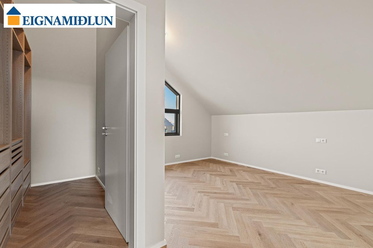 Neðri hæð: Svefnherbergi I (11 fm) með opnanlegum glugga og fataskáp. Svefnherbergi II (10,8 fm) með opnanlegum glugga og fataskáp. Efri hæð: Svefnherbergi III (11,7 fm) með opnanlegum glugga, fataskáp og frábært útsýni til suðurs. Hjónaherbergi (15,4 fm) með fataherbergi og opnanlegum glugga.