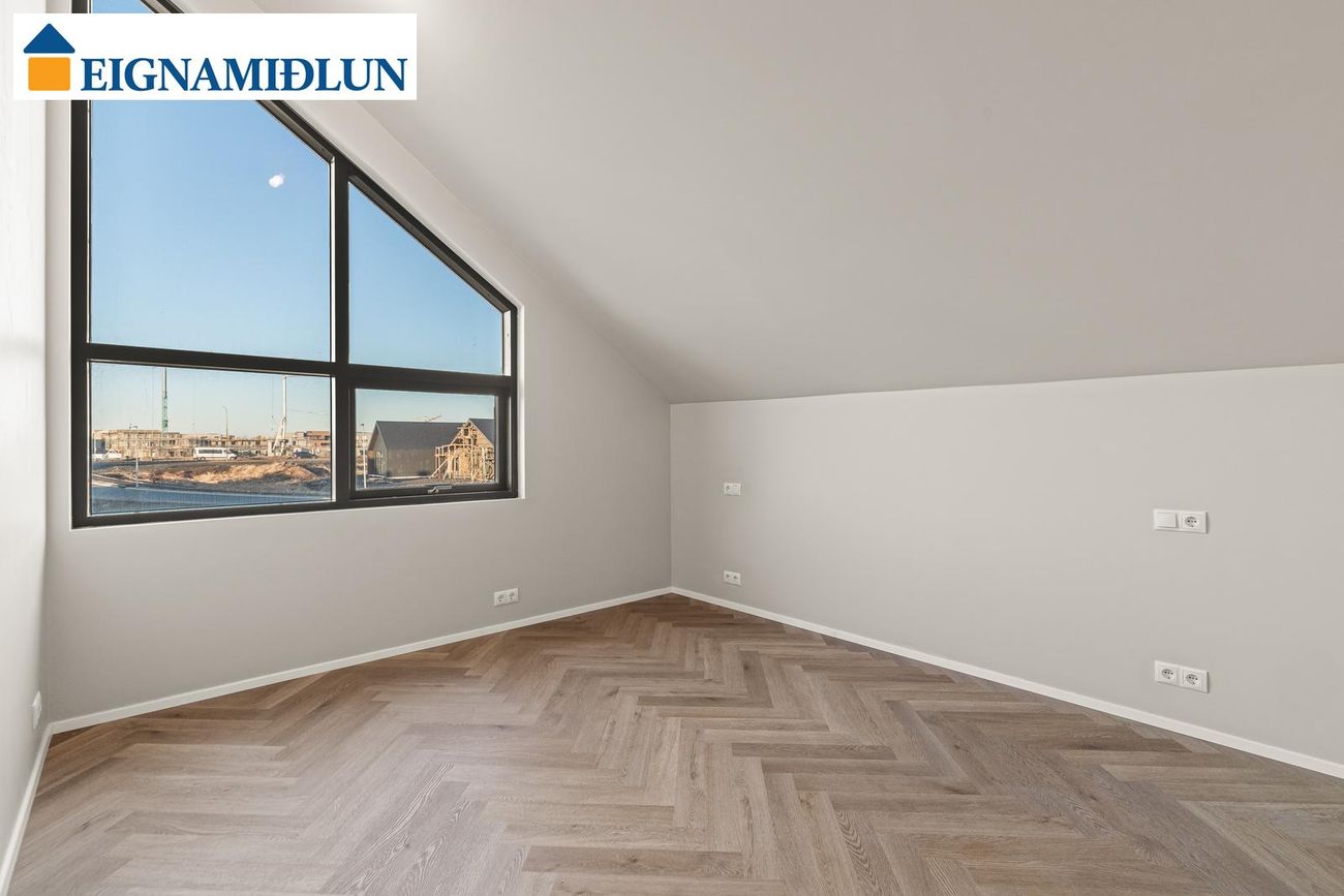 Parhús á tveimur hæðum, staðsteypt. Neðri hæð: forstofa með fataskápum, innbyggður geymsluskúr með bílskúrshurð, þvottahús, baðherbergi, tvö svefnherbergi, stofa og eldhús í björtu alrými. Efri hæð: hjónaherbergi með útgengi á svalir, svefnherbergi, baðherbergi og alrými með svalum til suðurs. Teppalagður stigi upp á efri hæð.