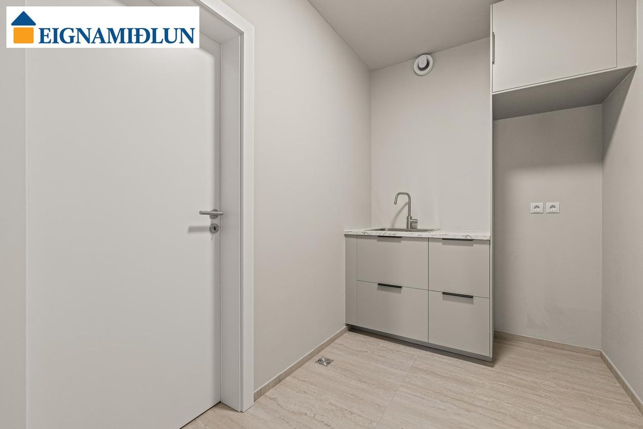 Þvottahús með skolvask innréttingu og tengi fyrir þvottavél og þurrkara.