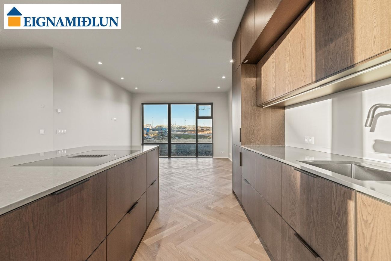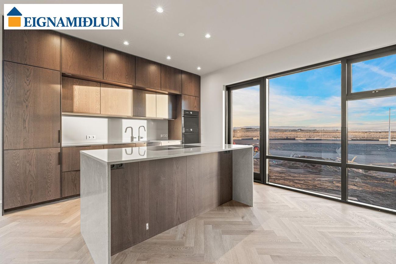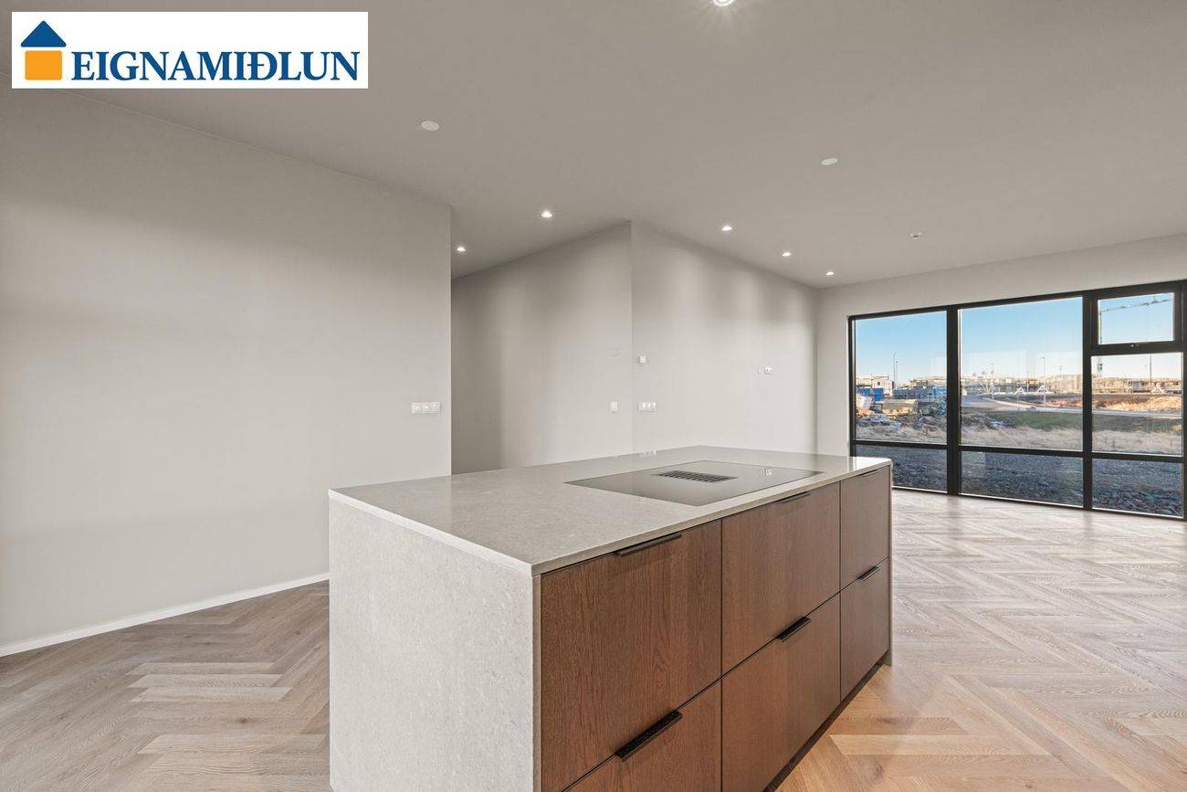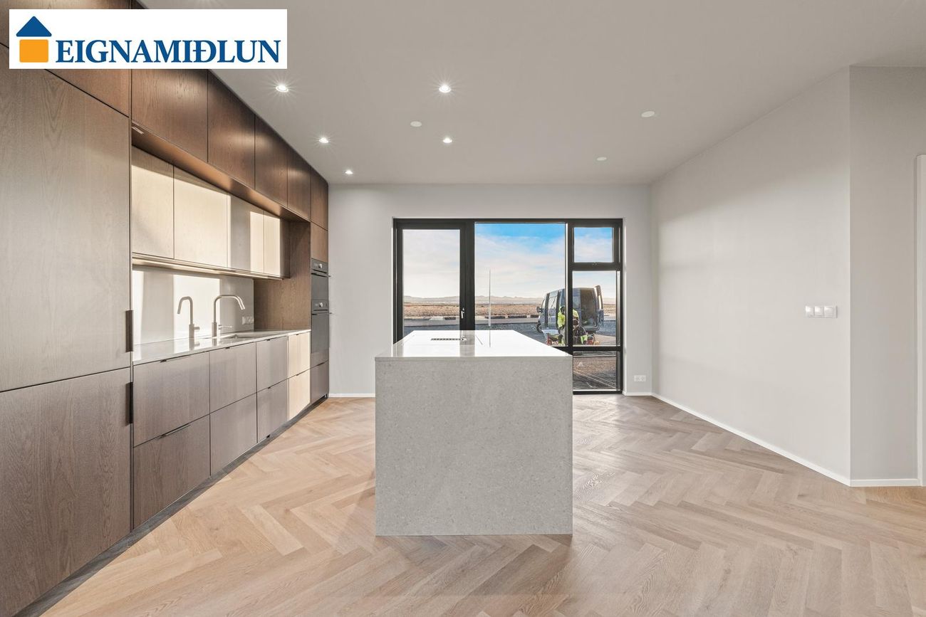 Fullbúið eldhús með eyju og stein á borði. Samliggjandi stofu í björtu alrými. Útgengt út á pall.