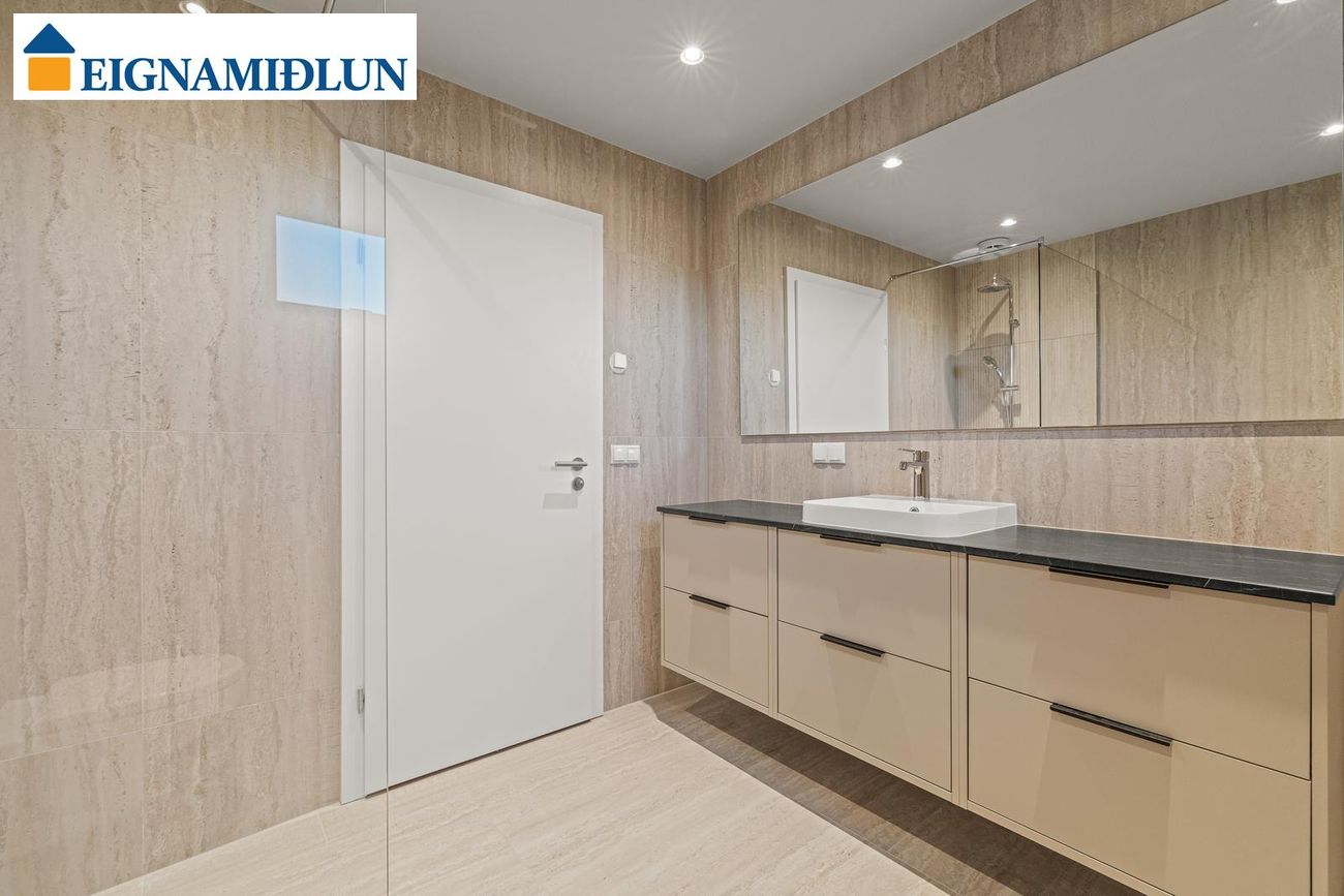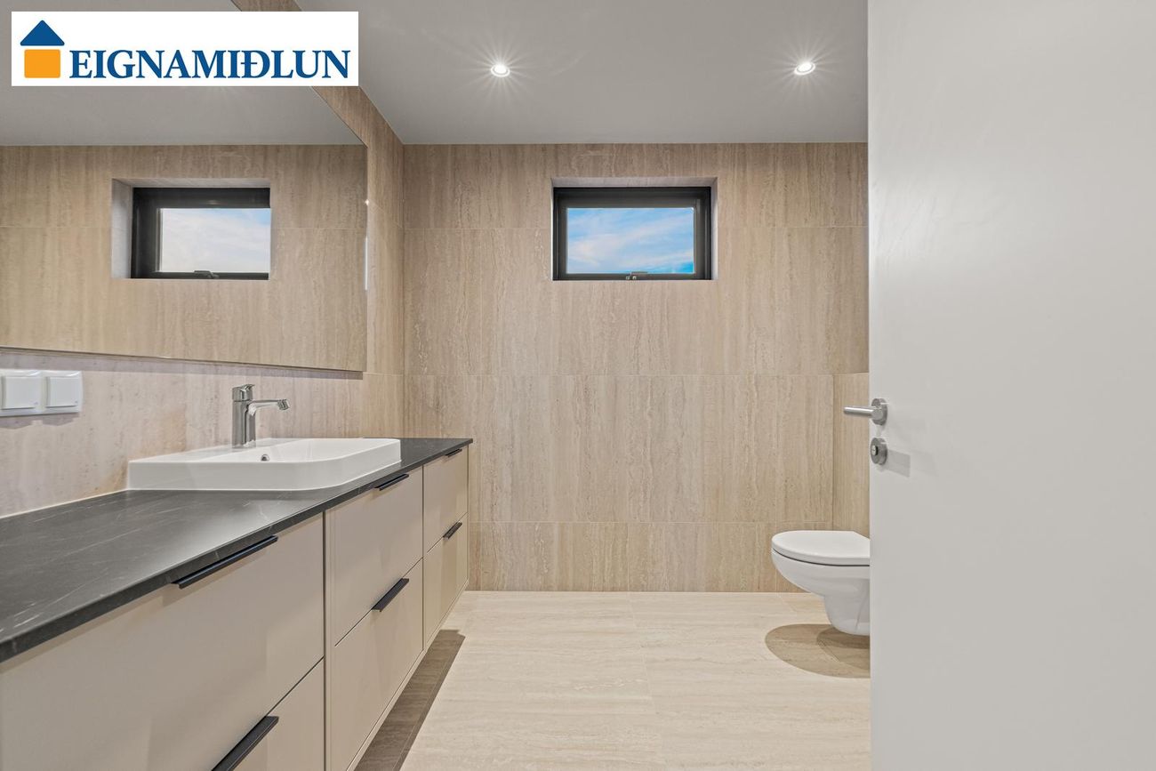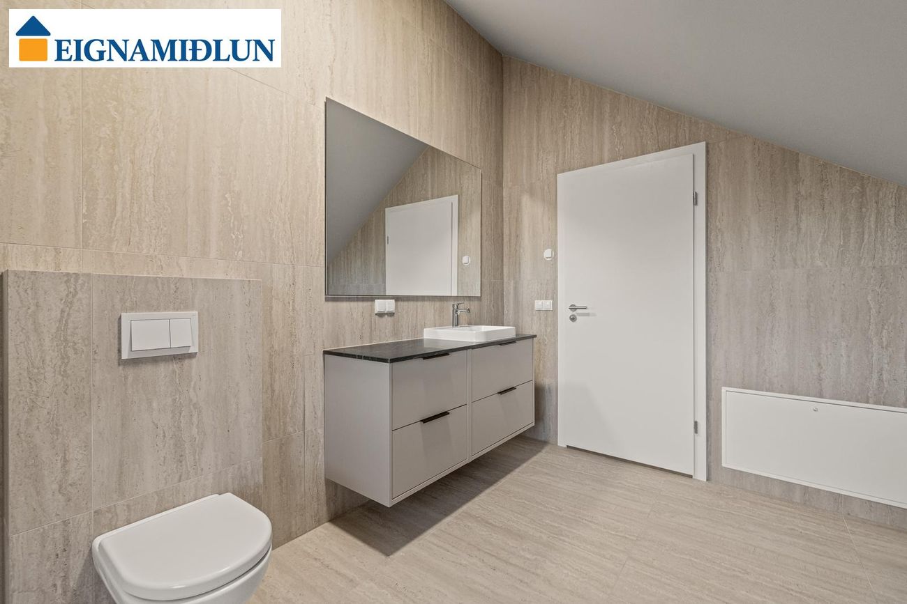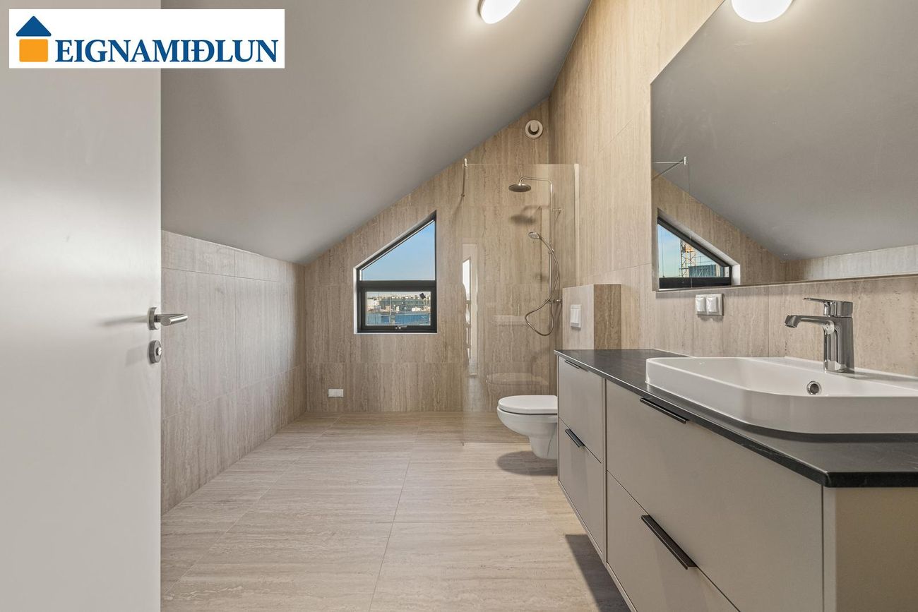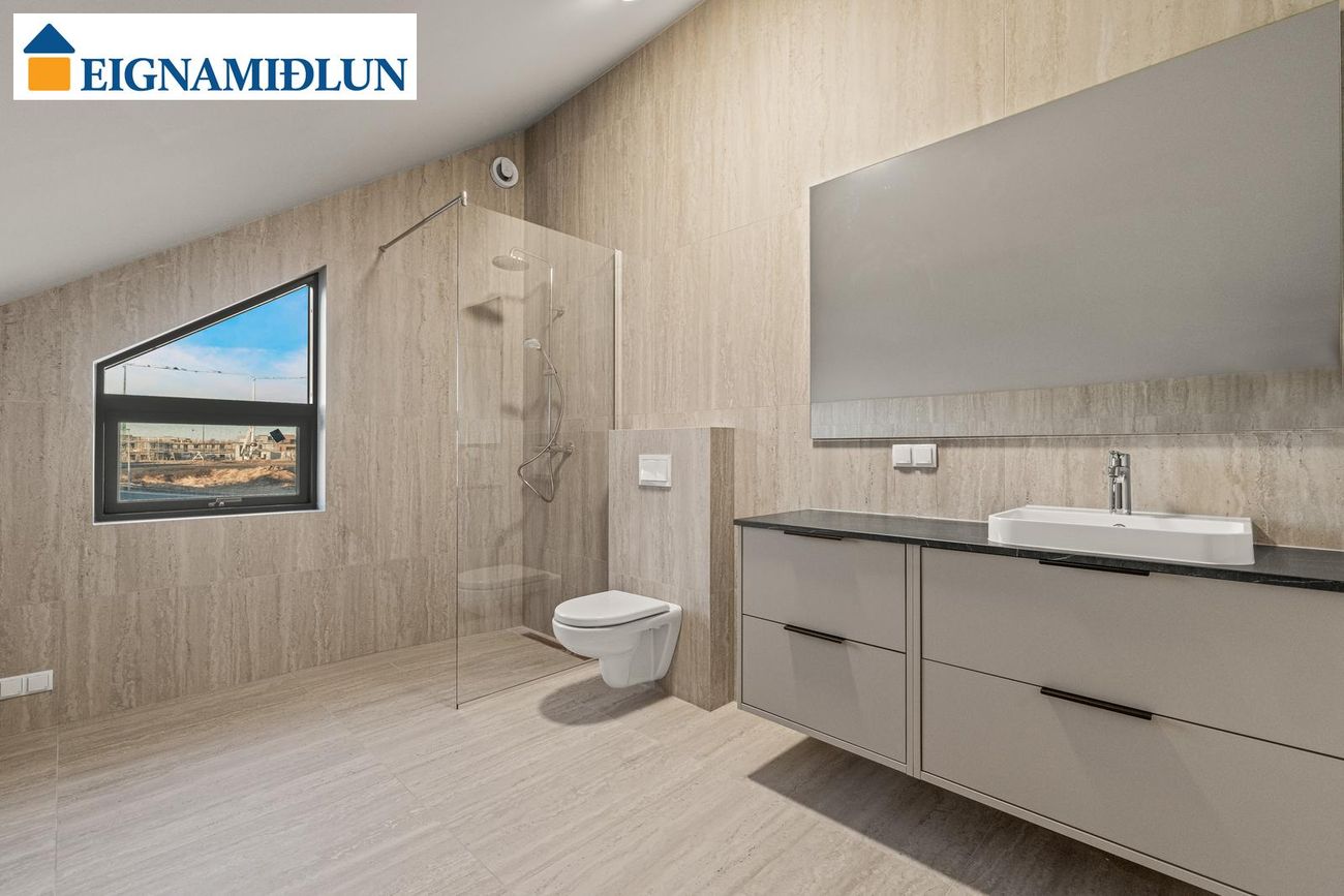 Baðherbergi I (neðri hæð): Með opnanlegum glugga, rúmgóðri innréttingu og walk-in sturtu. Baðherbergi II (efri hæð): Með opnanlegum glugga, rúmgóðri innréttingu og walk-in sturtu.