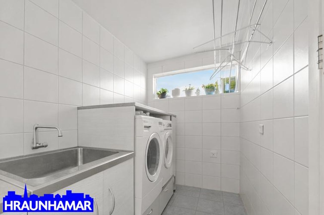 þvottaherbergi, innrétting með skolvaski, flísar í hólf og gólf, hurð út á inngangspallinn/svalir. Innaf holi eru