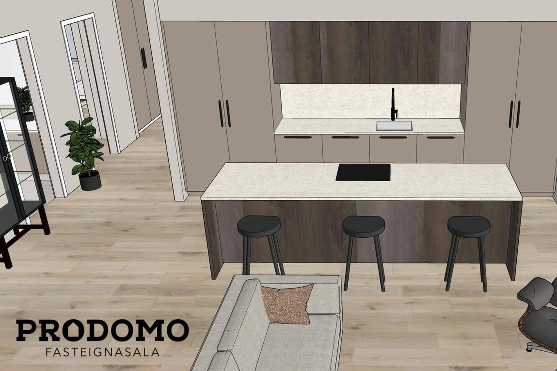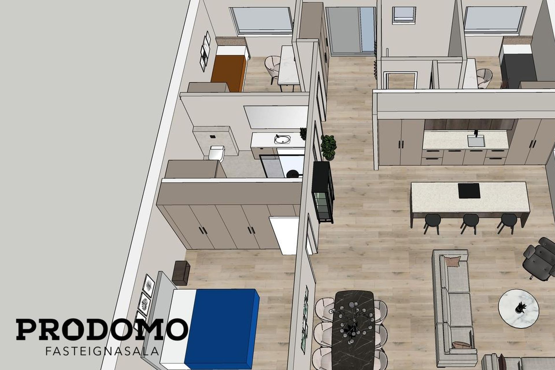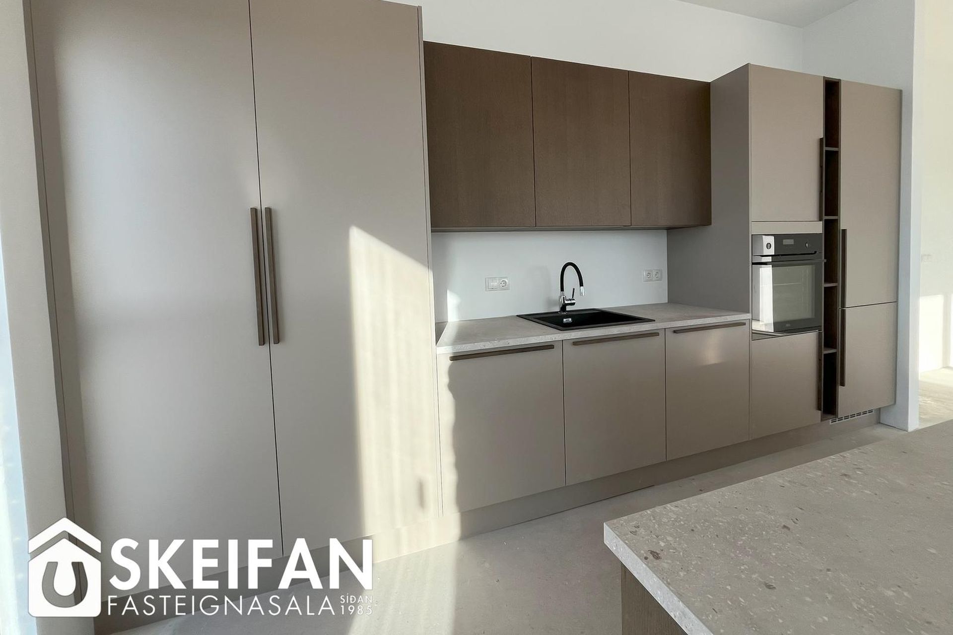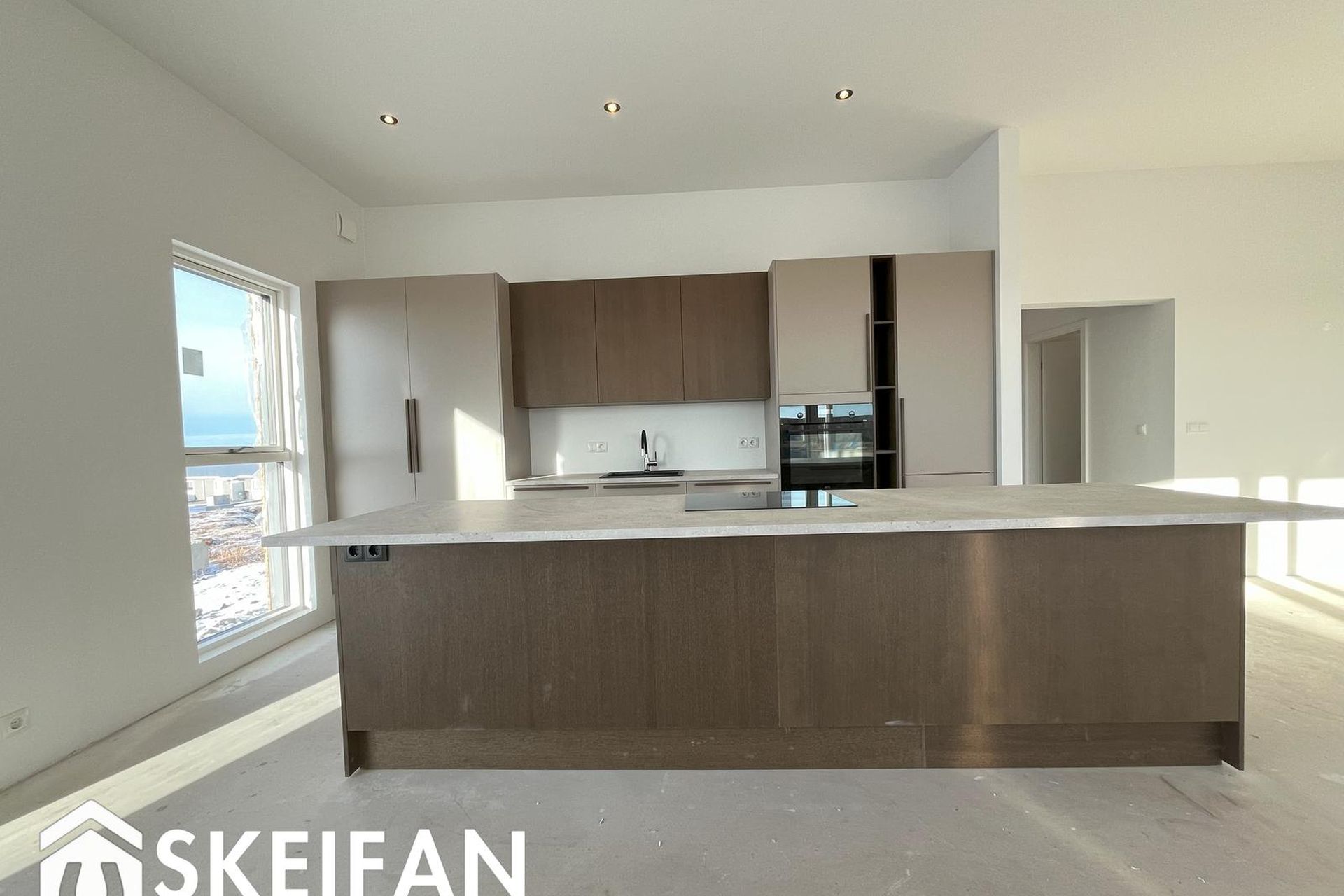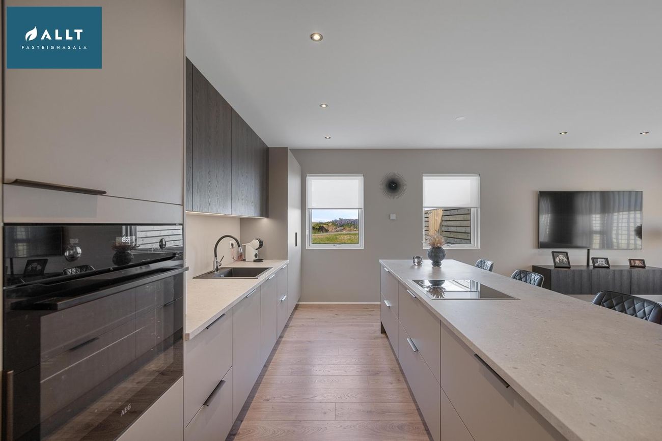Eldhús: Vönduð innrétting frá HTH. Stór eldhúseyja (306 cm) með skúffum, hægt er að sitja við eyjuna. Tveir búrskápar með útdraganlegum skúffum og hillum, annar með tveim tenglum. Innbyggður ísskápur, uppþvottavél, helluborð og bakaraofn fylgja.