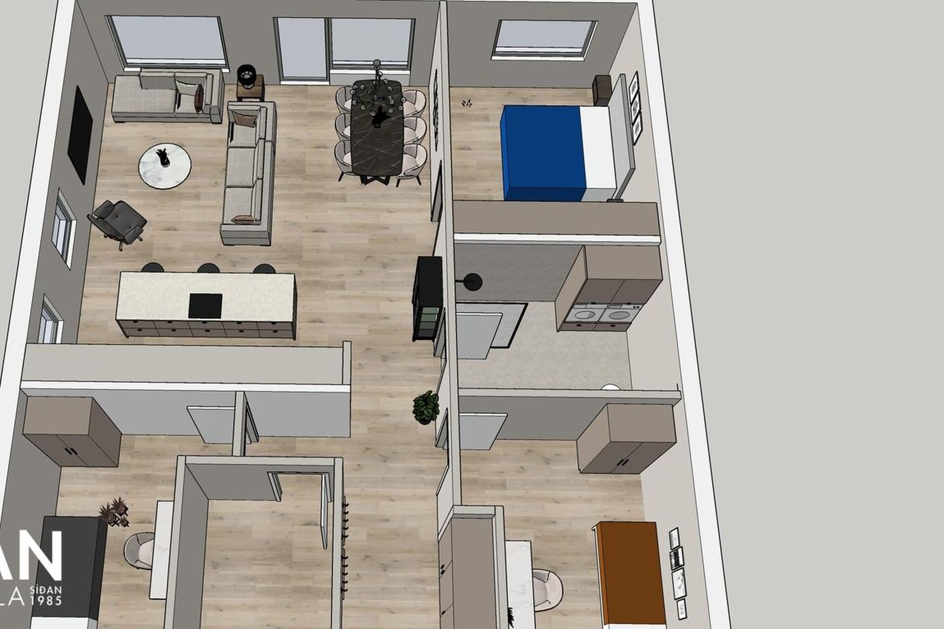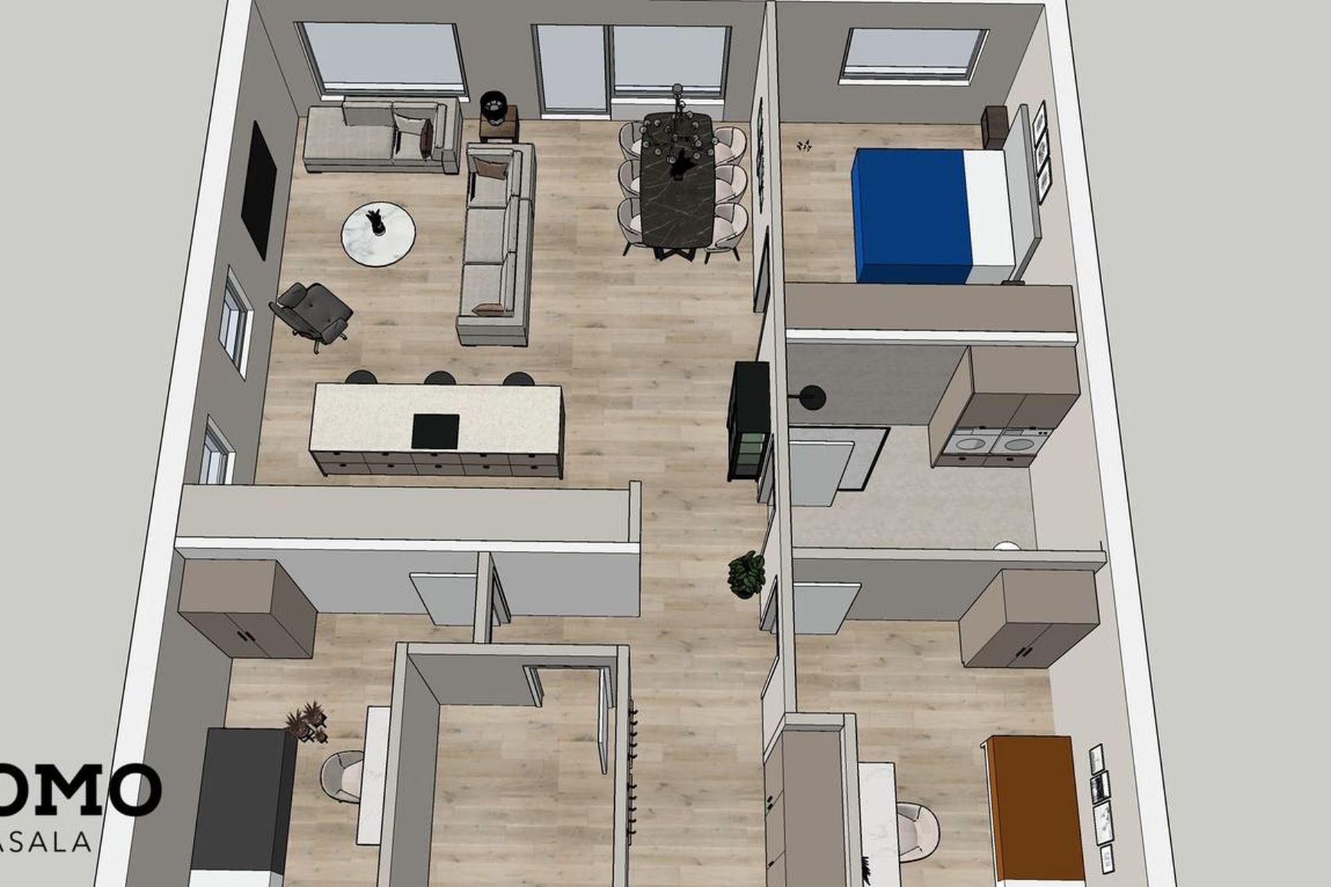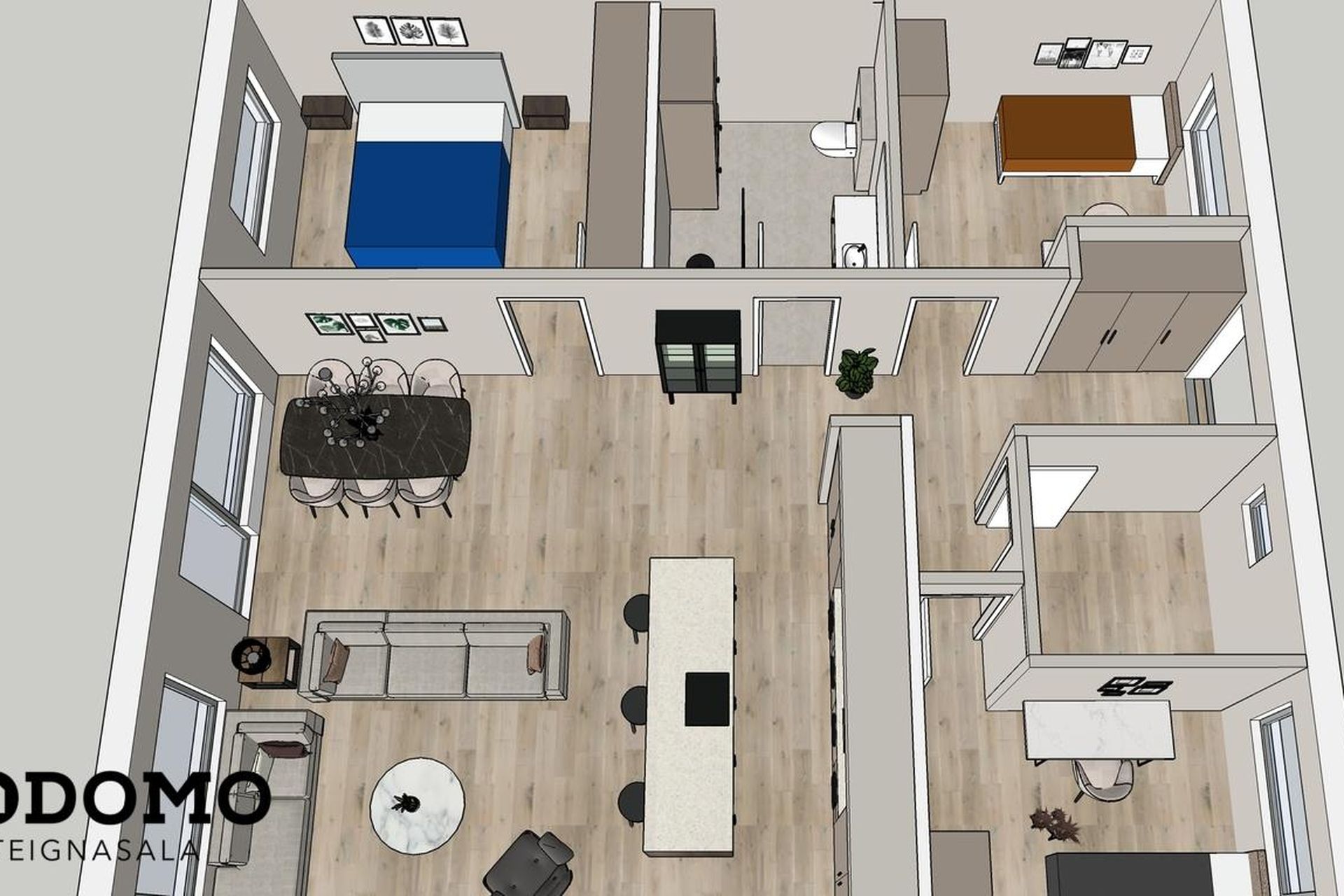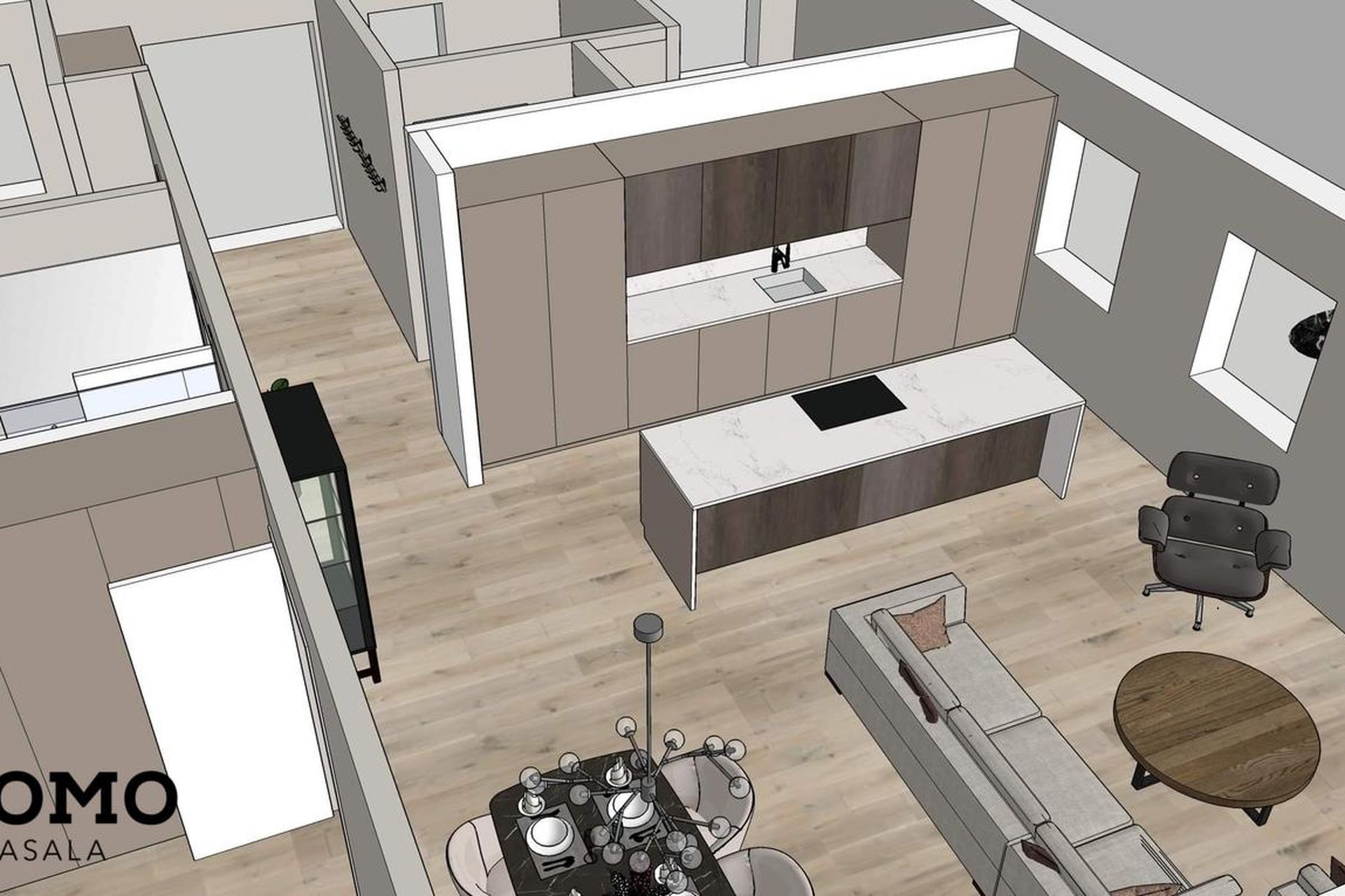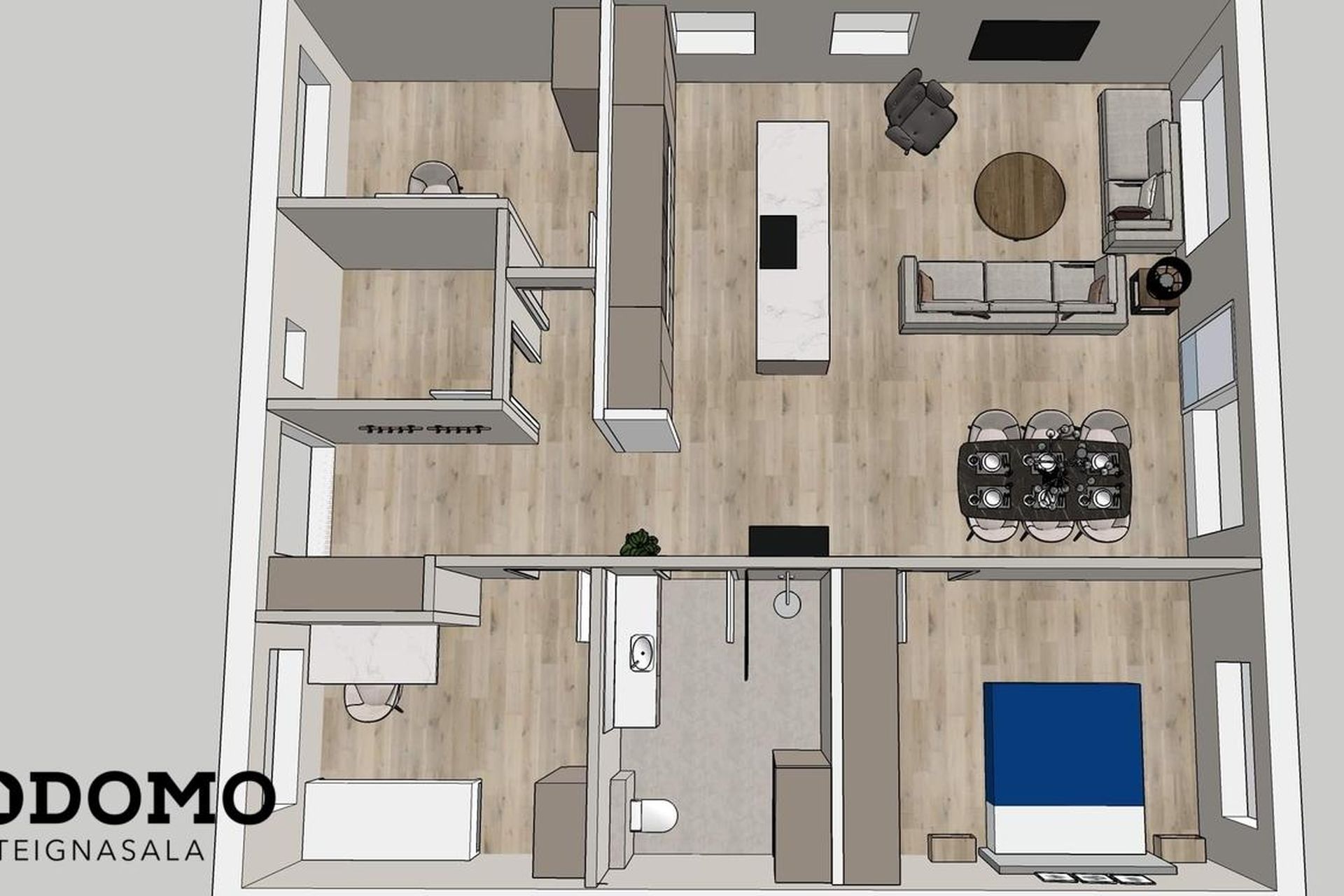 Eldhús: Vönduð innrétting frá HTH. Stór eldhúseyja (306 cm) með skúffum, hægt er að sitja við eyjuna. Tveir búrskápar með útdraganlegum skúffum og hillum, annar með tveim tenglum. Innbyggður ísskápur, uppþvottavél, helluborð og bakaraofn fylgja.