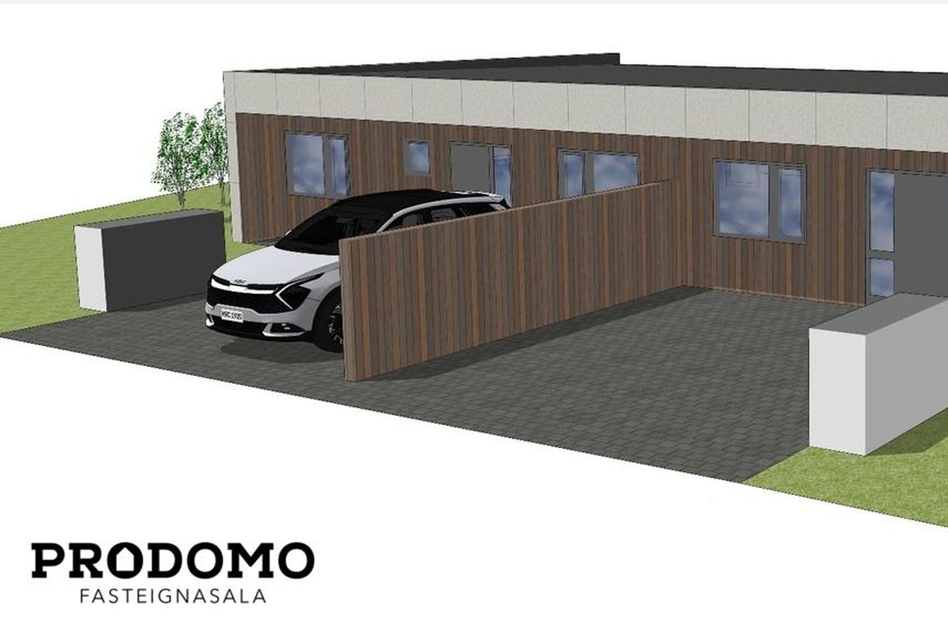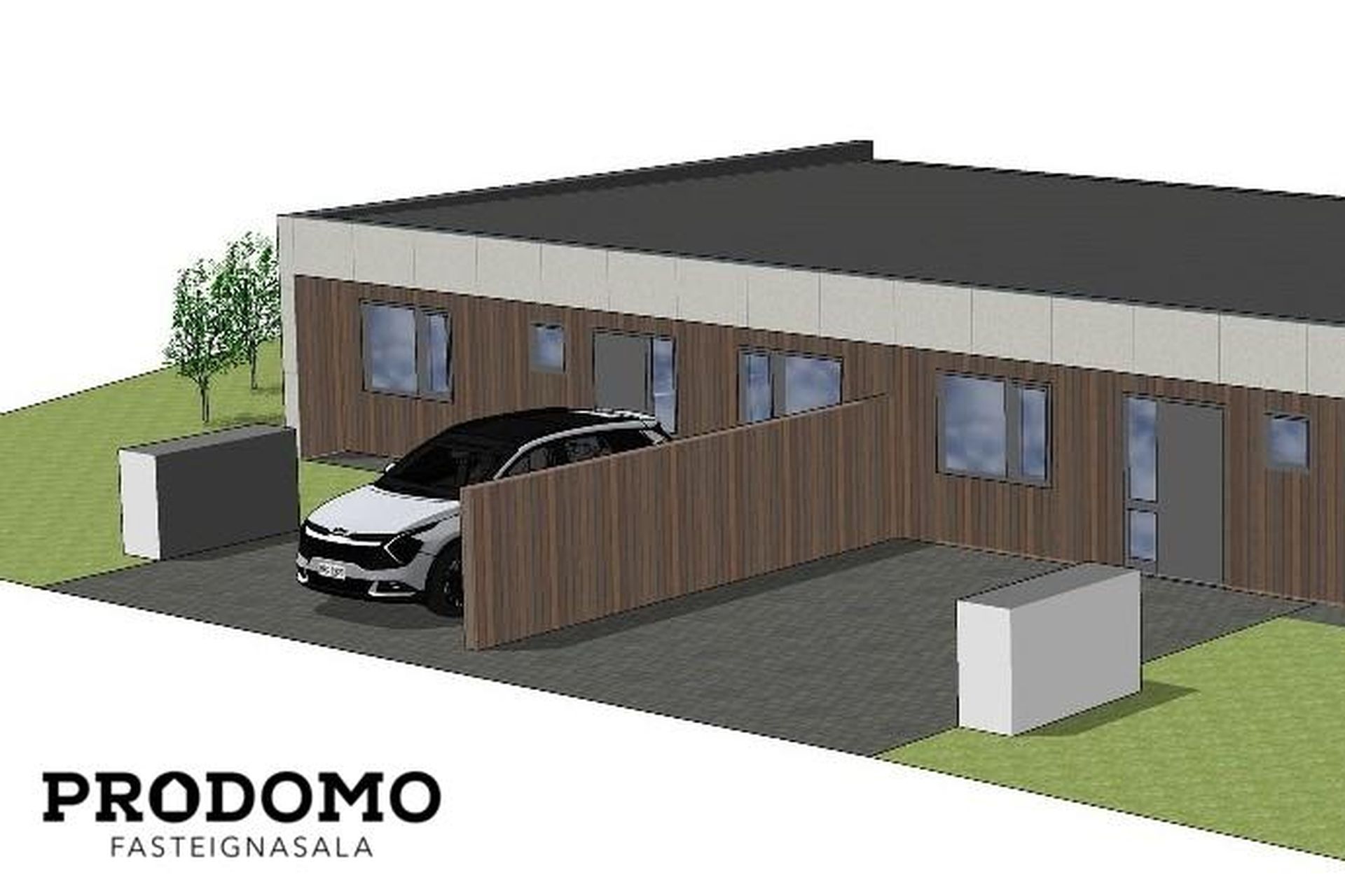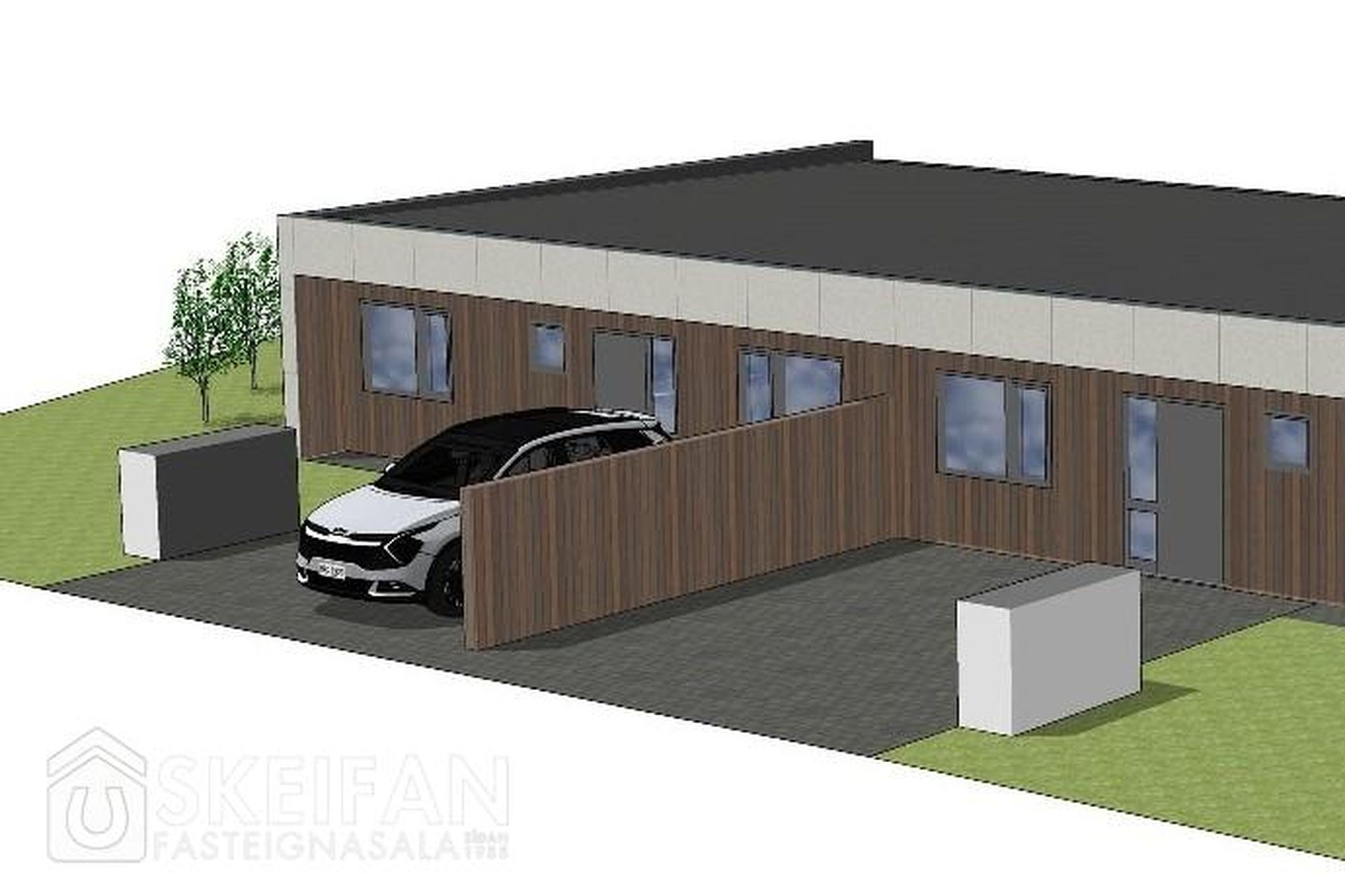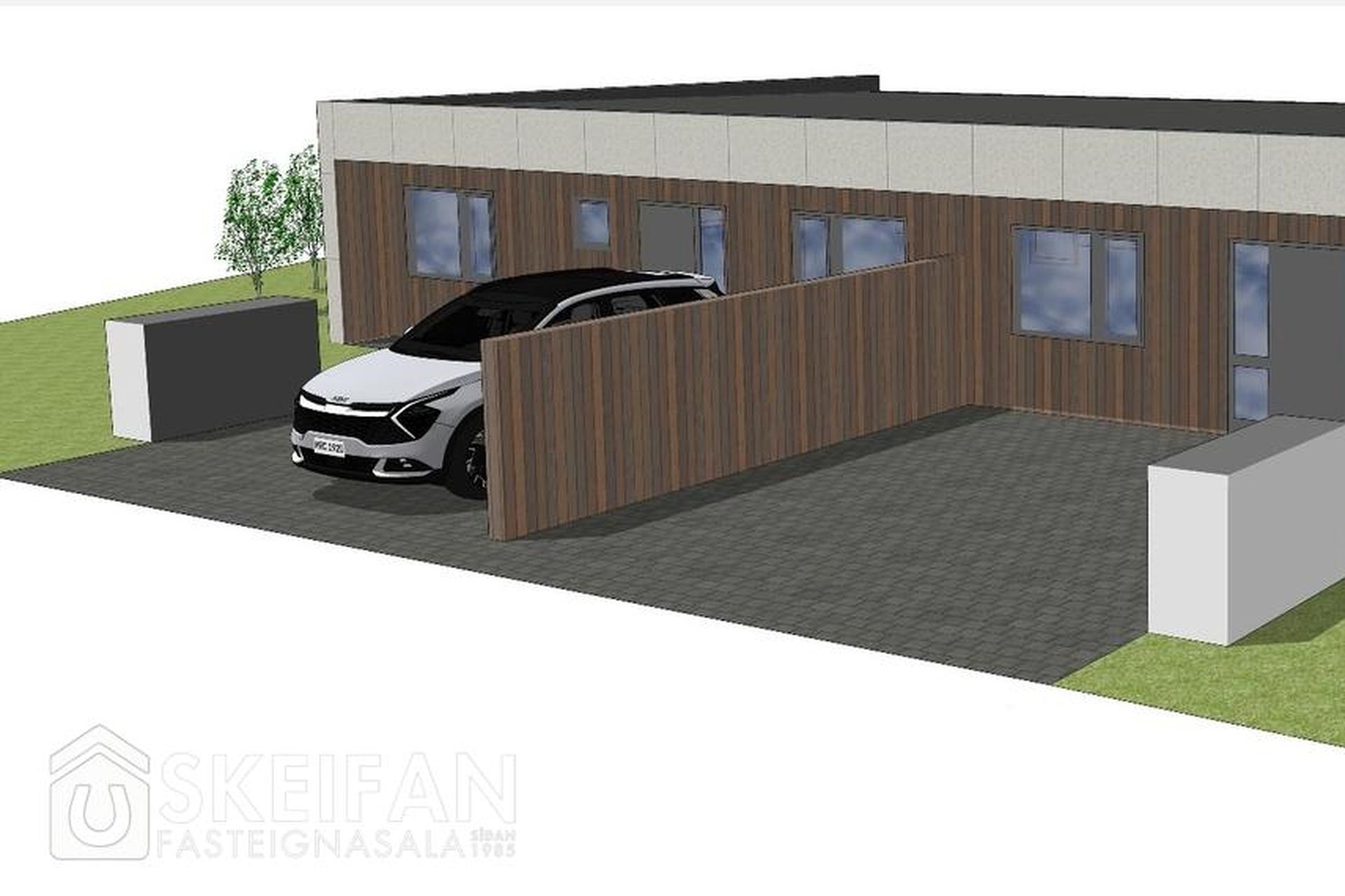 Tvö steypt bílastæði með snjóbræðslukerfi fyrir framan húsið með rafbílahleðslu.