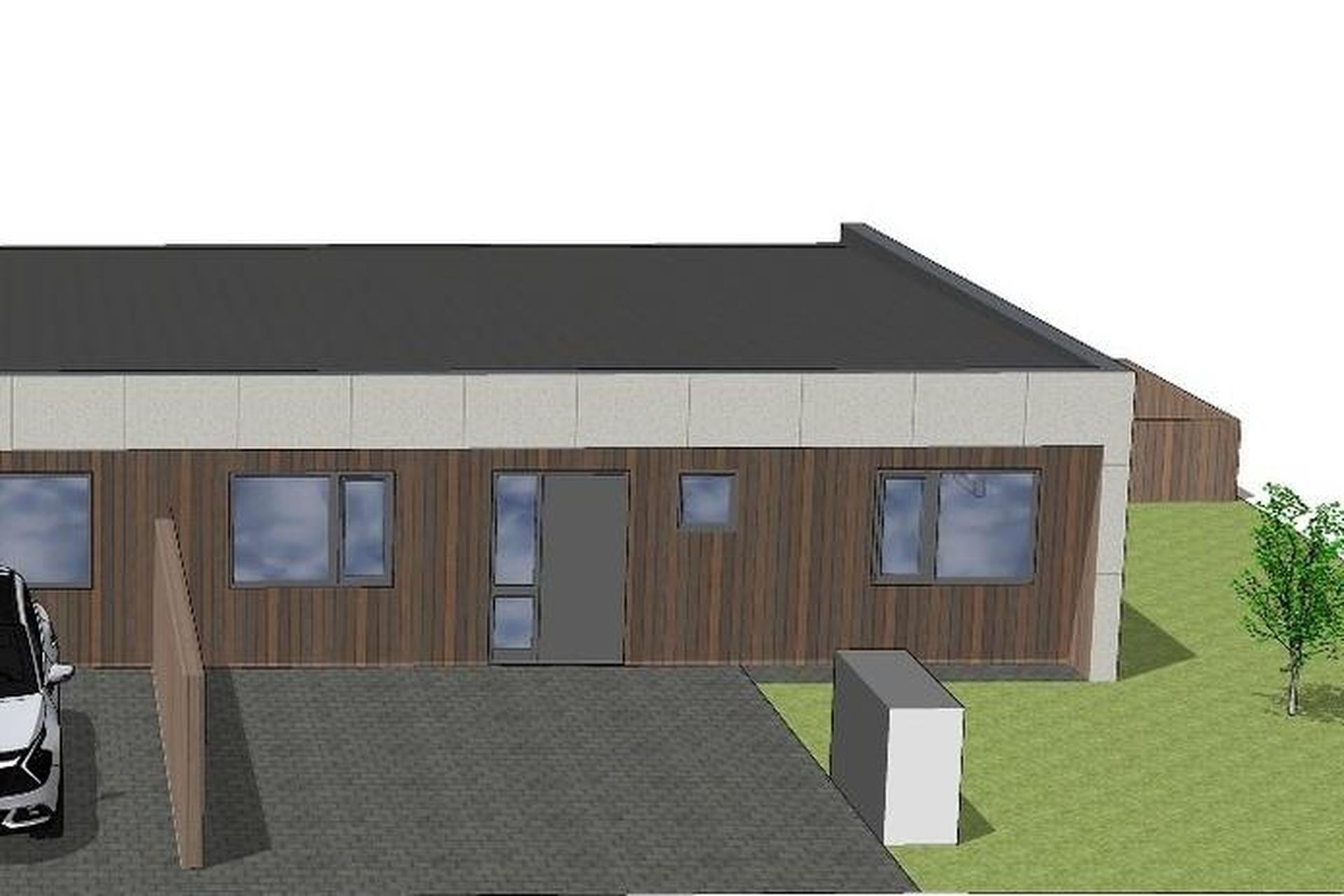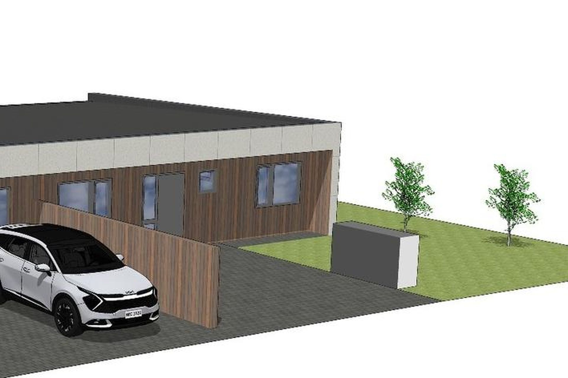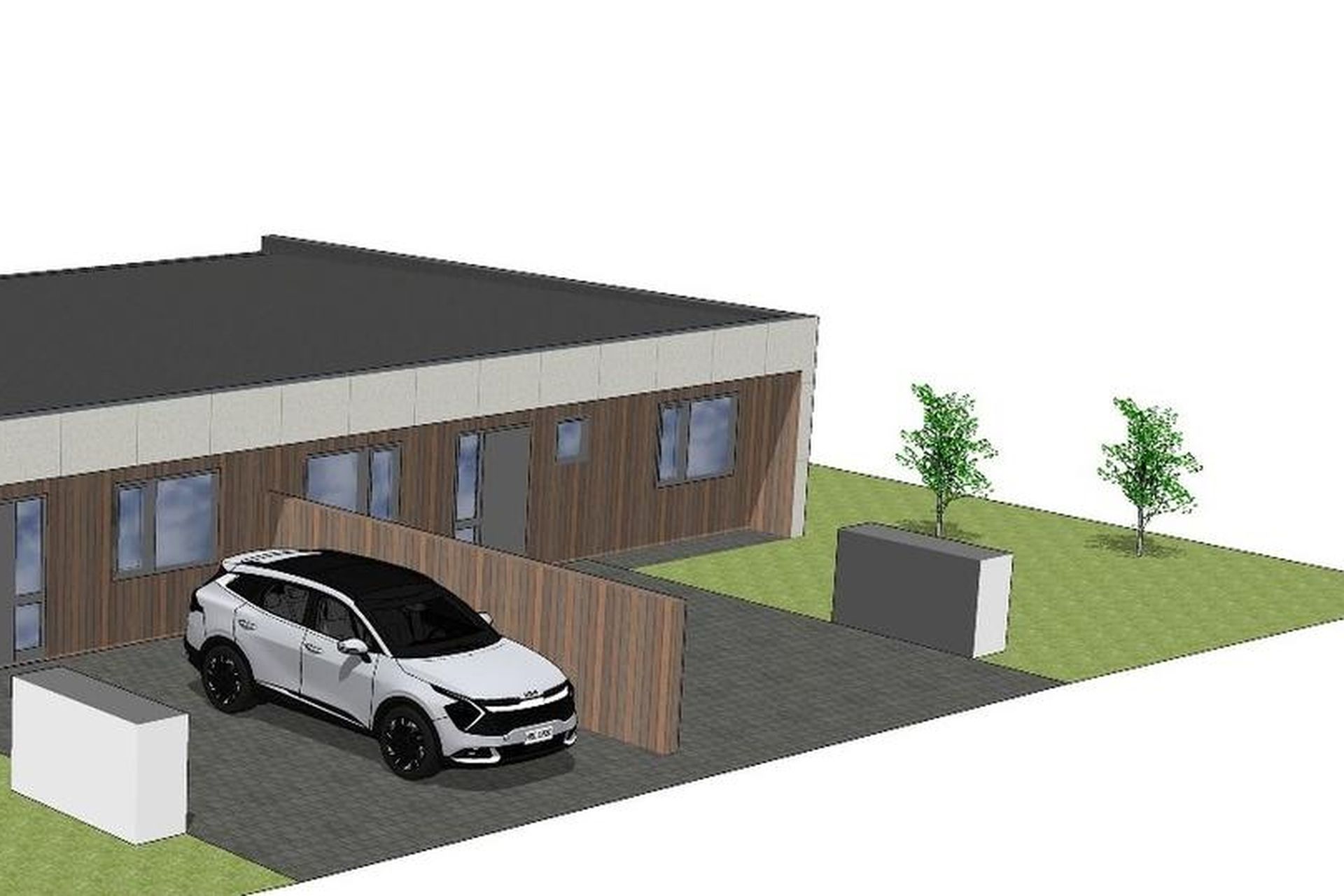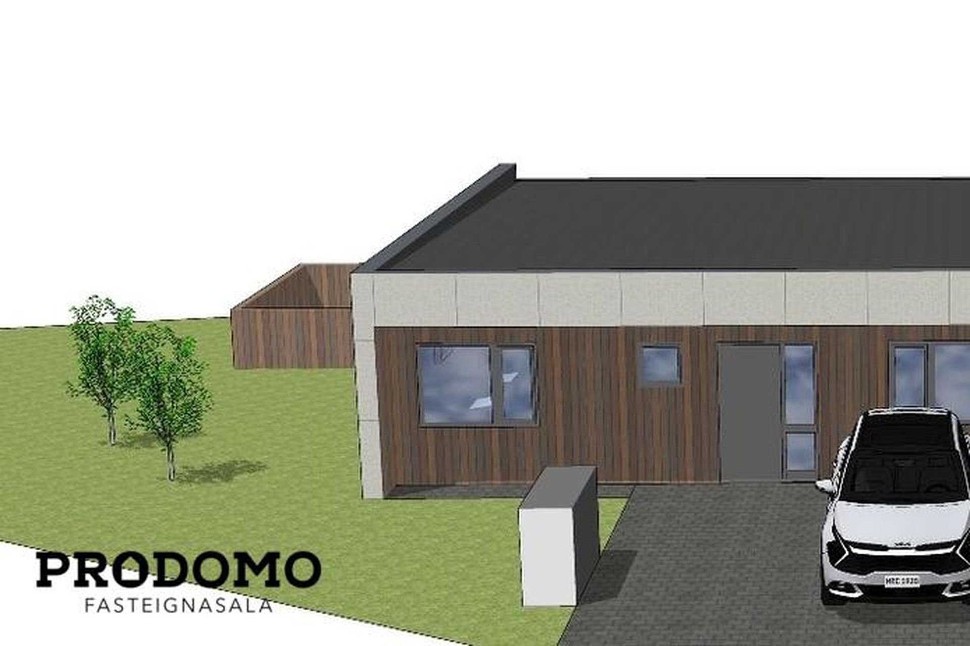Tvö steypt bílastæði með snjóbræðslukerfi fyrir framan húsið með rafbílahleðslu.