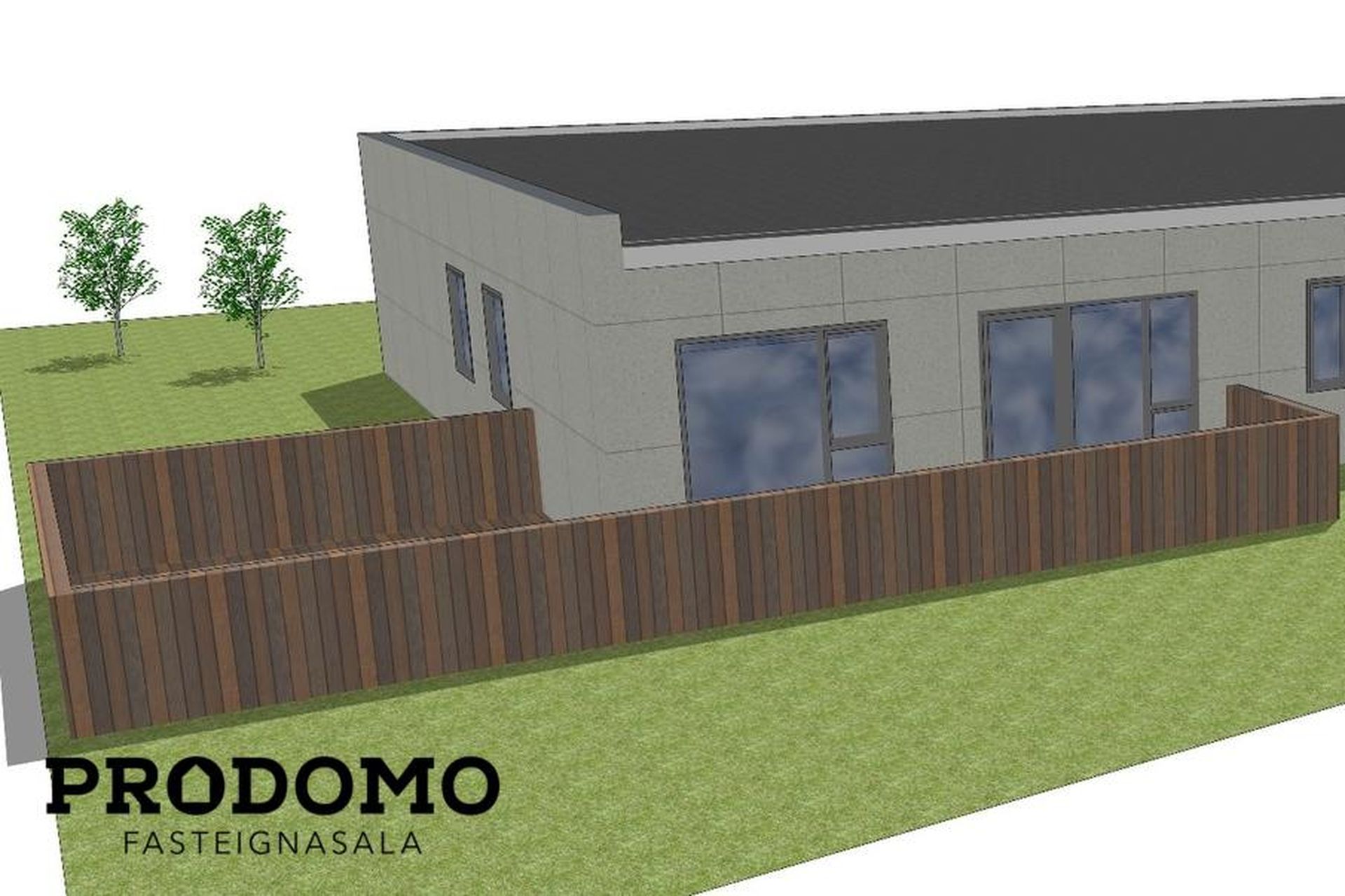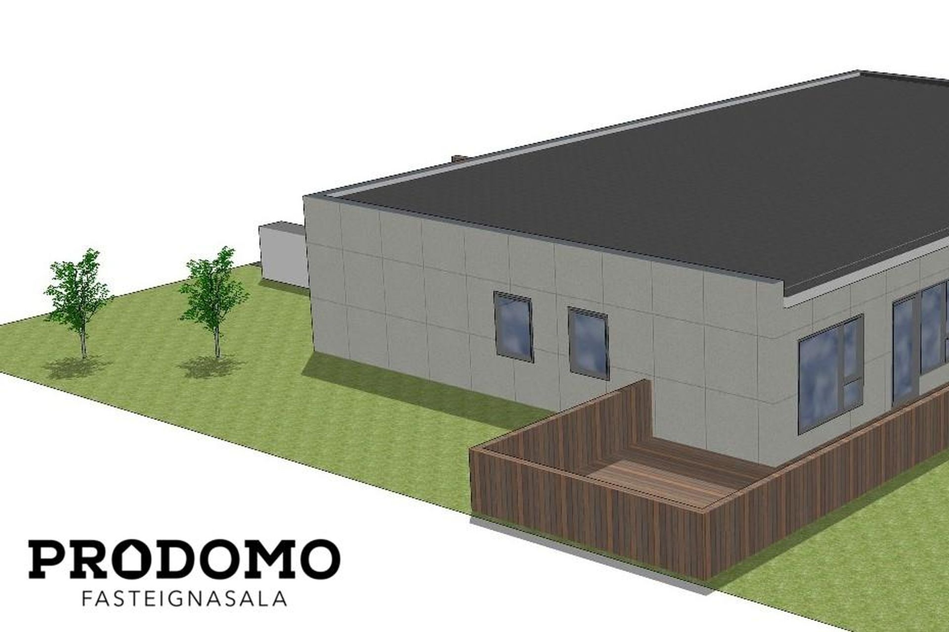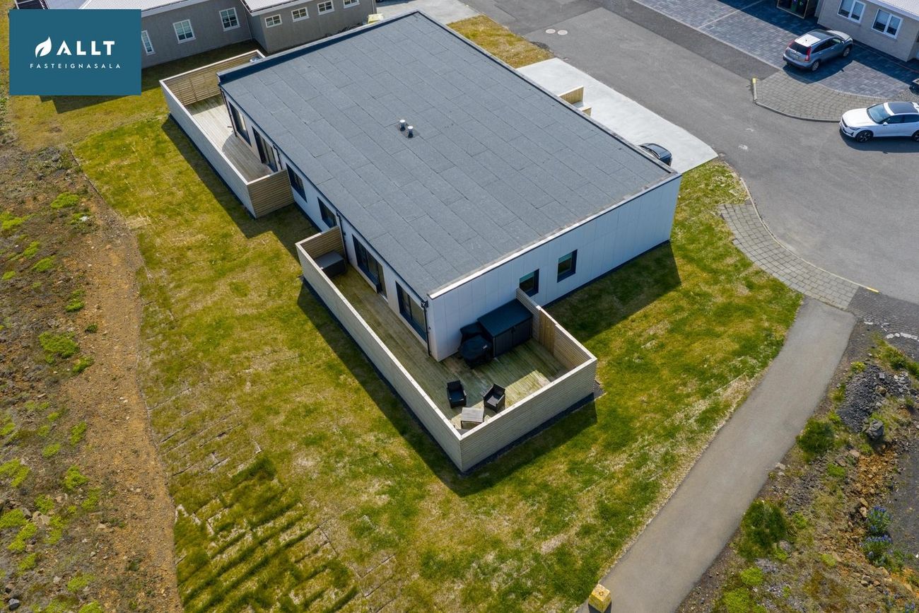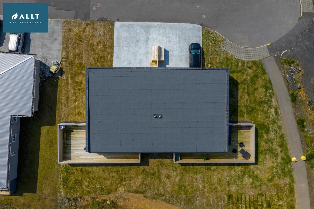 Lóðin er tyrfð og með pall á bakvið og norðanmegin.