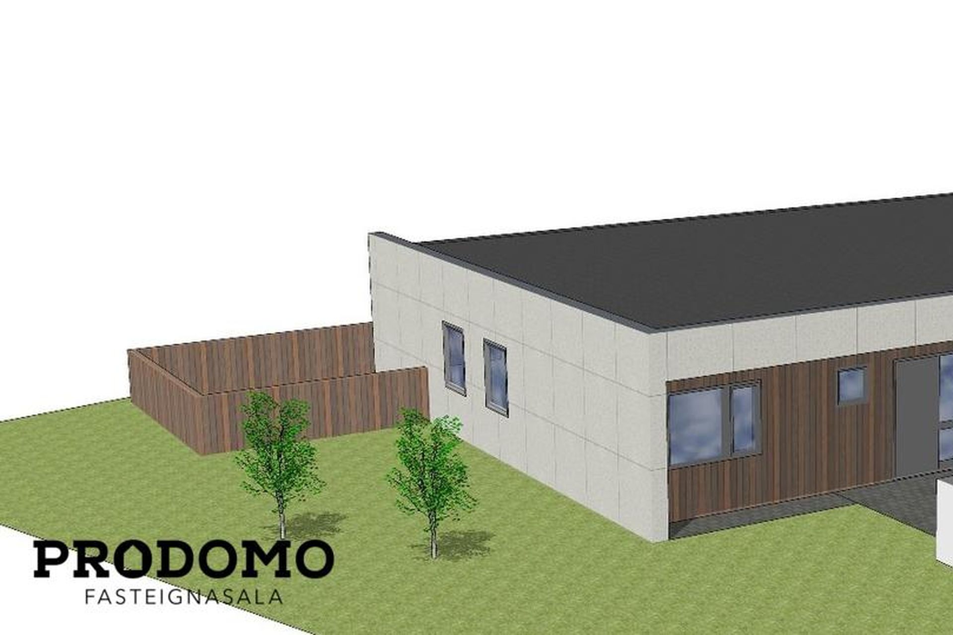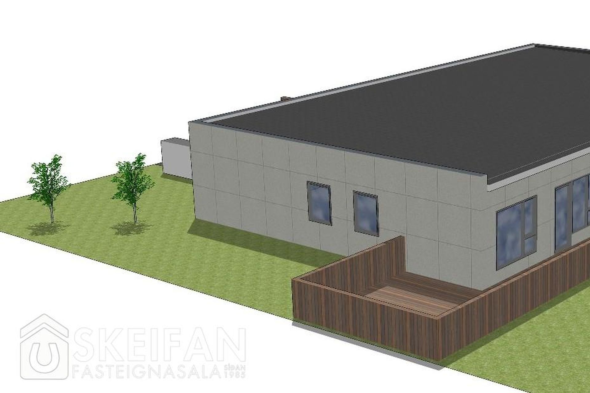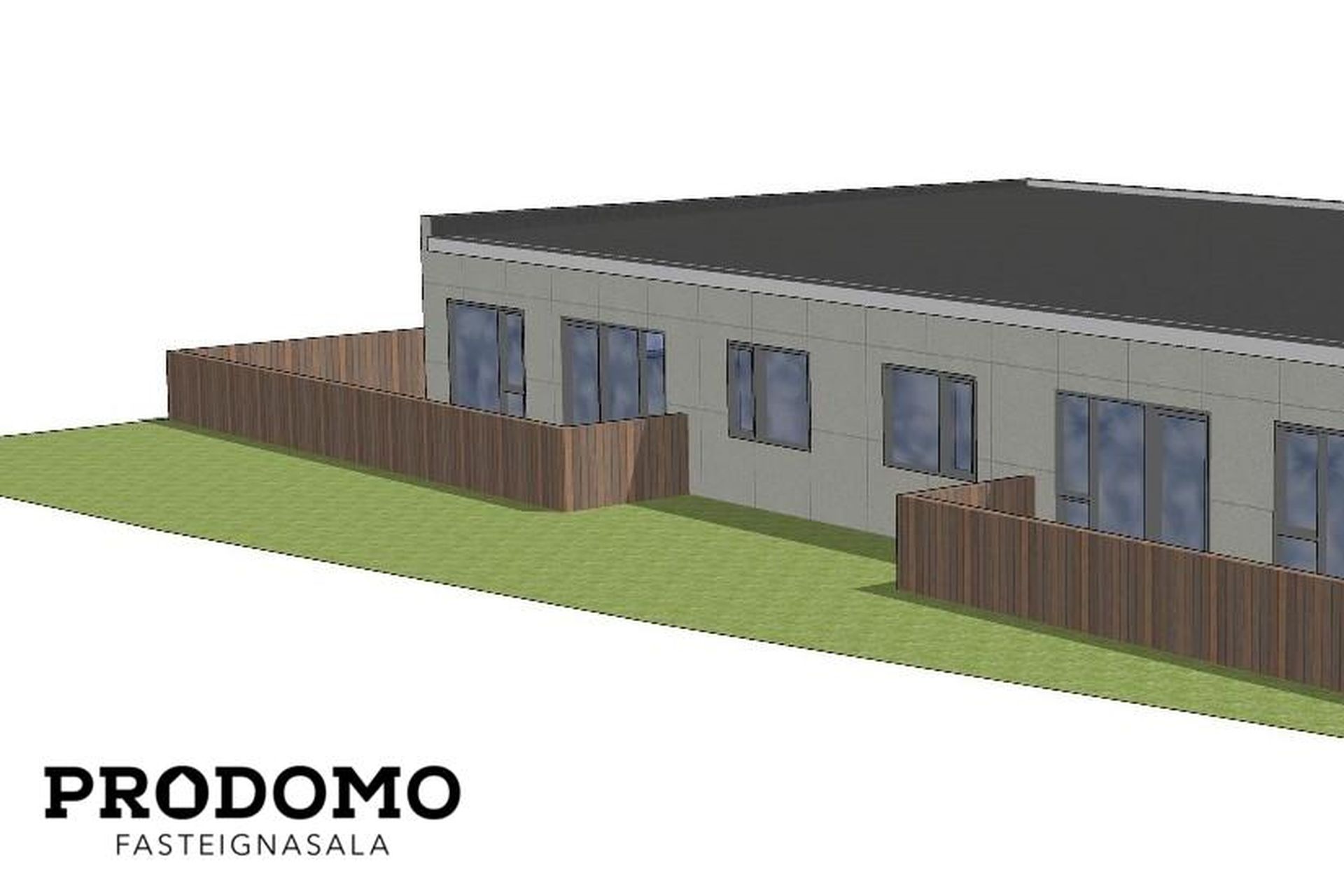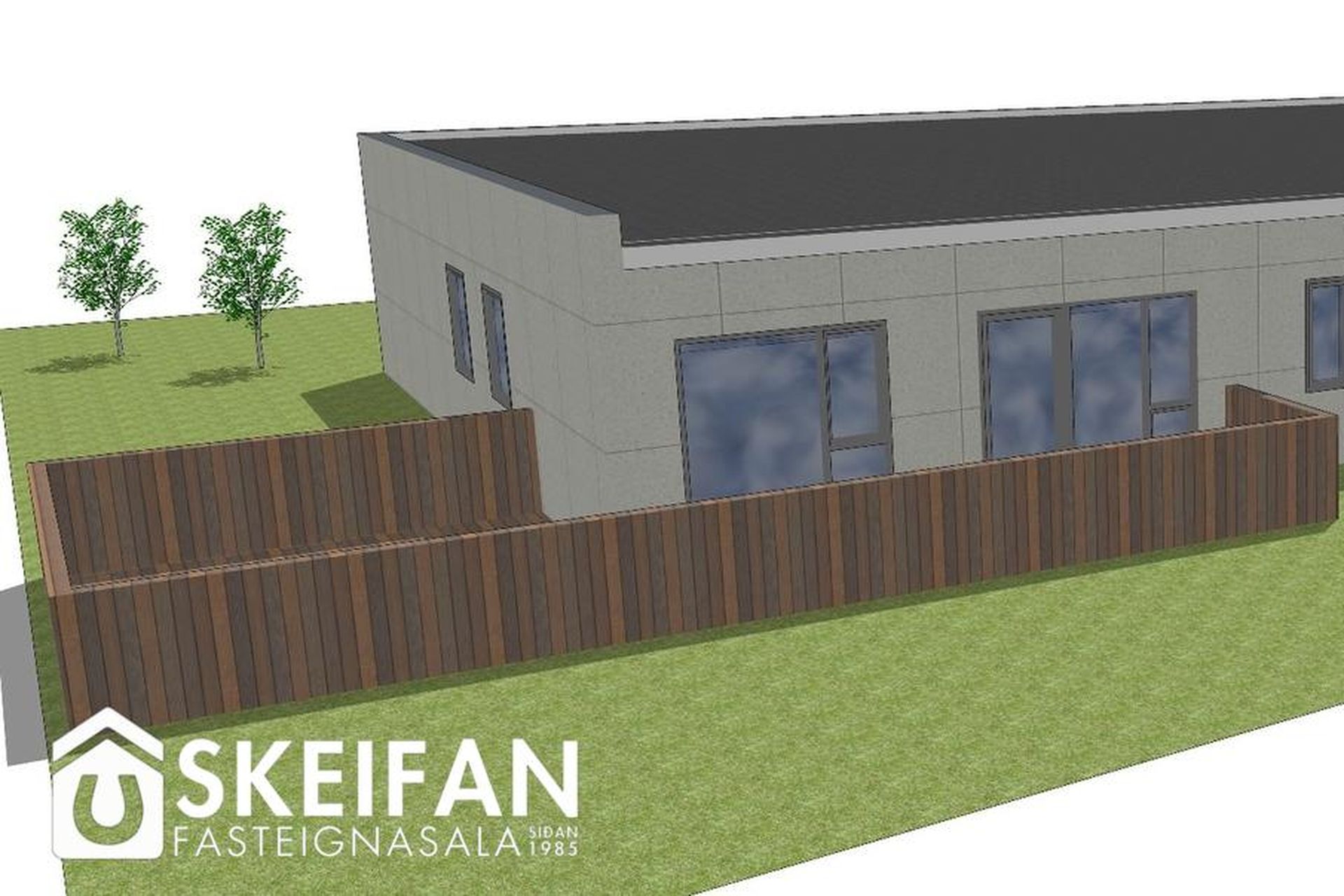 Lóðin er tyrfð og með pall á bakvið og norðanmegin.