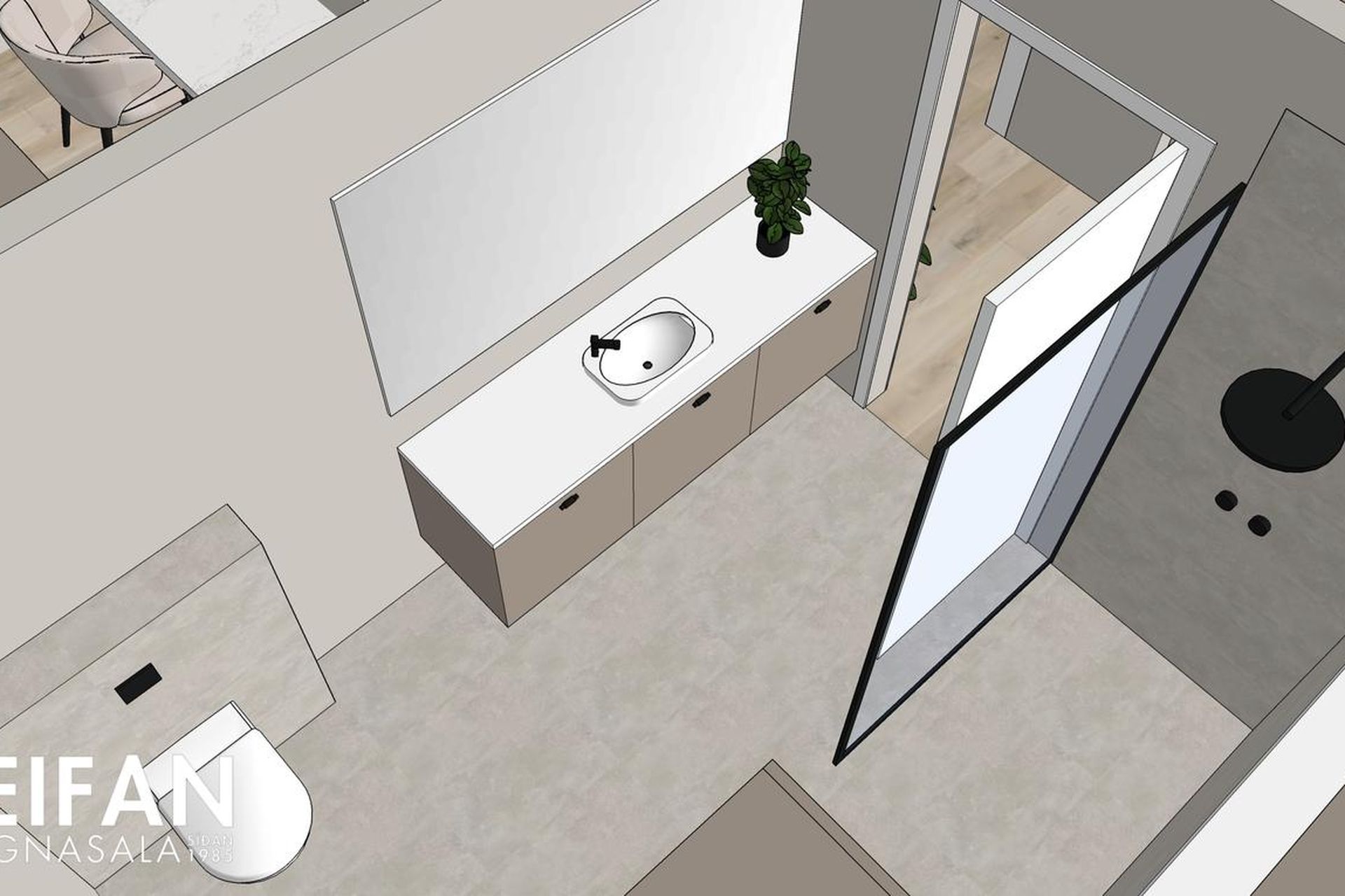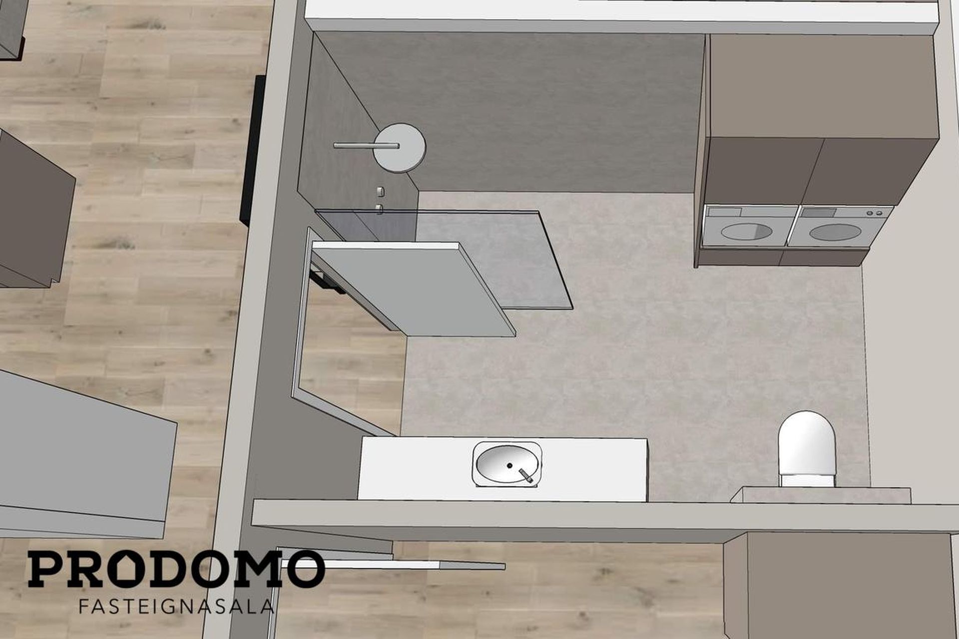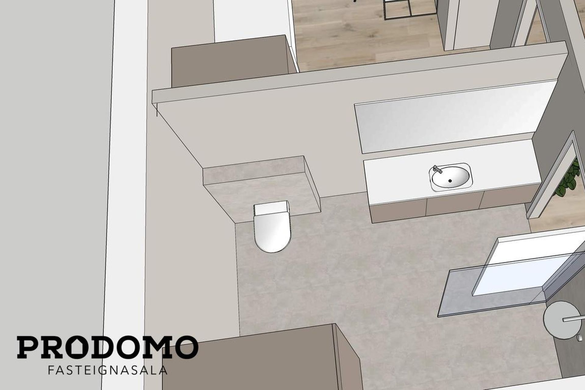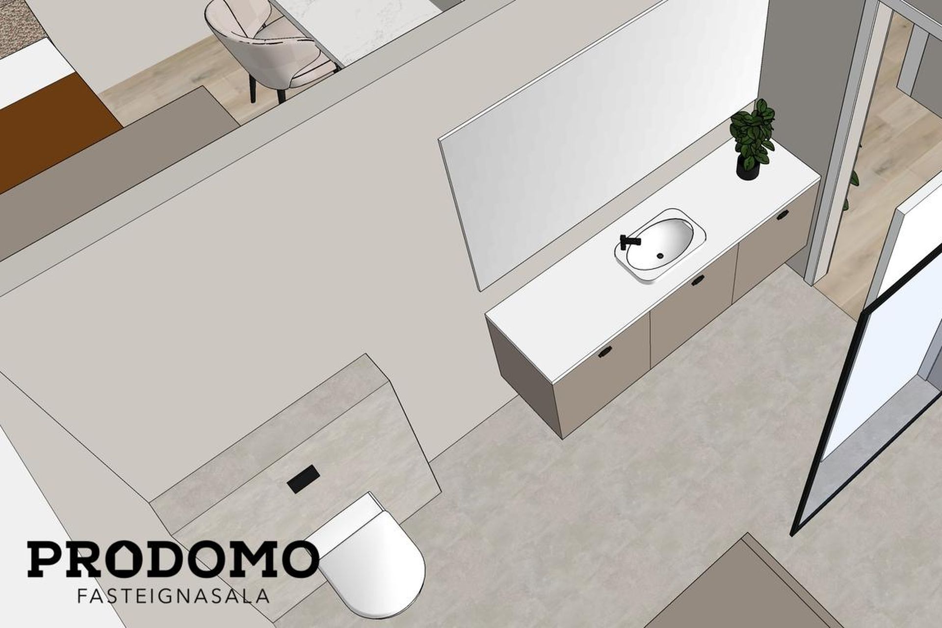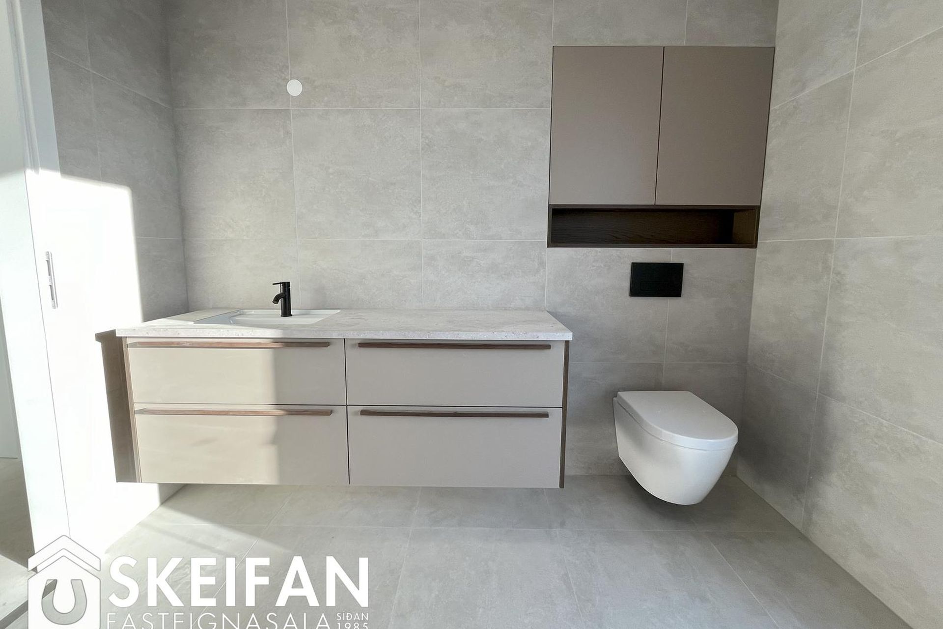 Baðherbergi: Flísalagt gólf og hluta af veggjum. Innrétting frá HTH með undirlímdum vaski, og spegli. Innangeng sturta. Þvottaaðstaða með innréttingu fyrir þvottavél og þurrkara staðsett inni á baðherbergi.