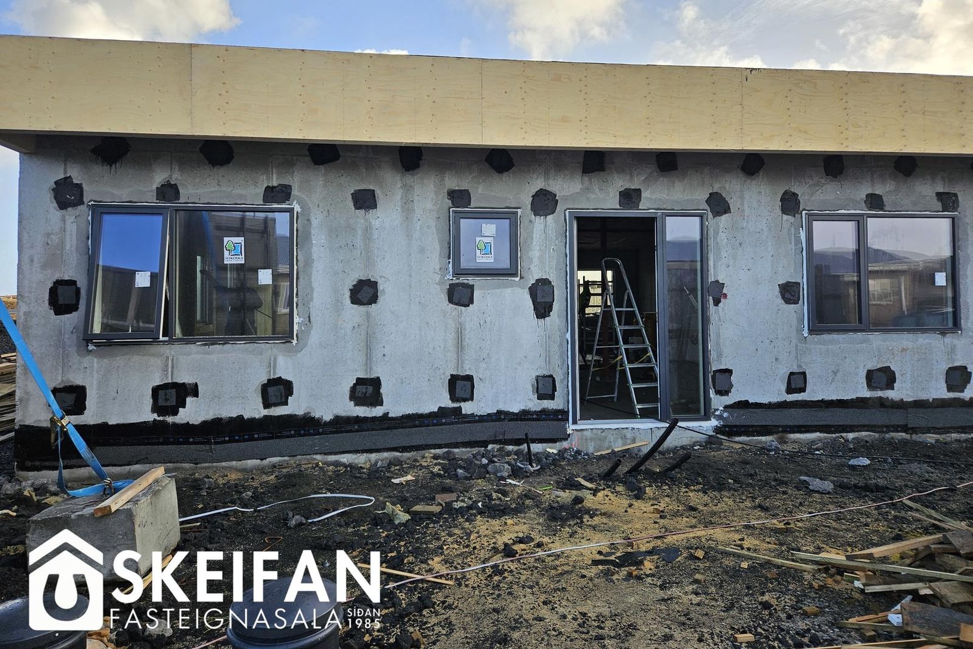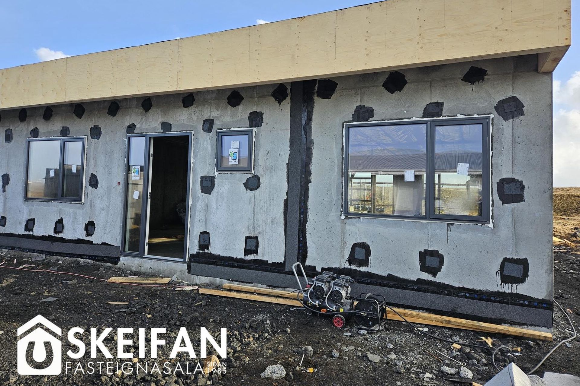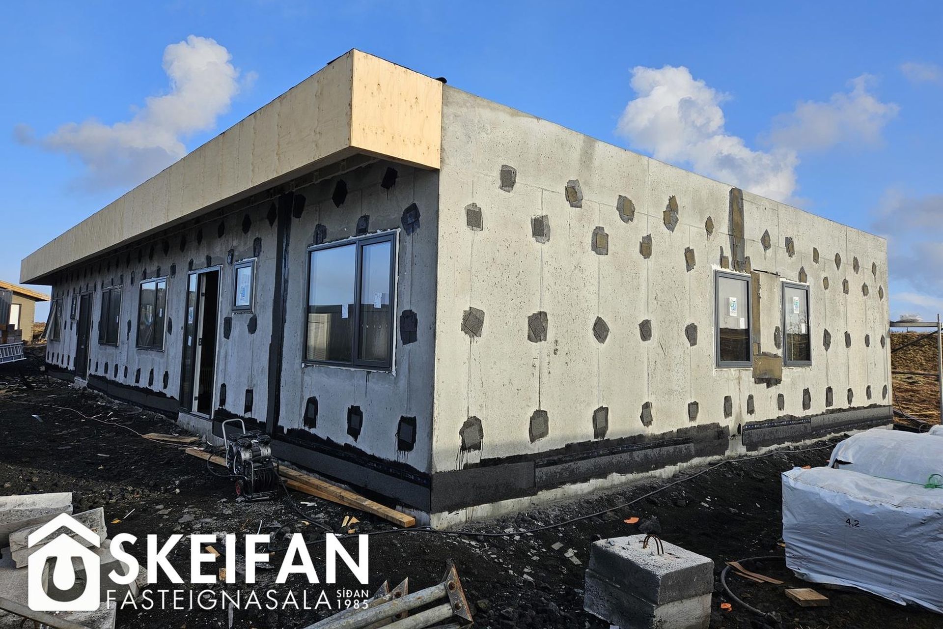 Ytra byrði og lóð:Húsið er einangrað að utan með 100 mm steinull og klætt með blöndu af steinfíberplötum og panelvið.
