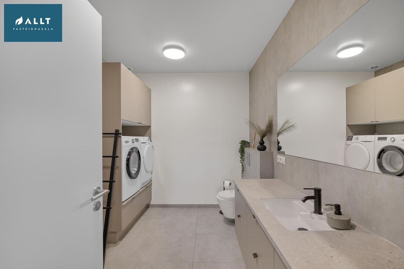 Baðherbergi: Flísalagt gólf og hluta af veggjum. Innrétting frá HTH með undirlímdum vaski, og spegli. Innangeng sturta. Þvottaaðstaða með innréttingu fyrir þvottavél og þurrkara staðsett inni á baðherbergi.