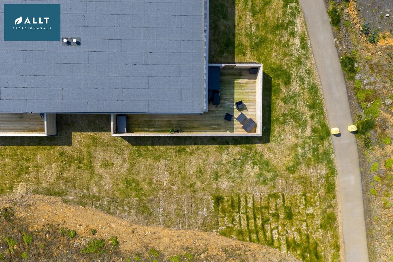 Lóðin er tyrfð og með pall á bakvið og norðanmegin.