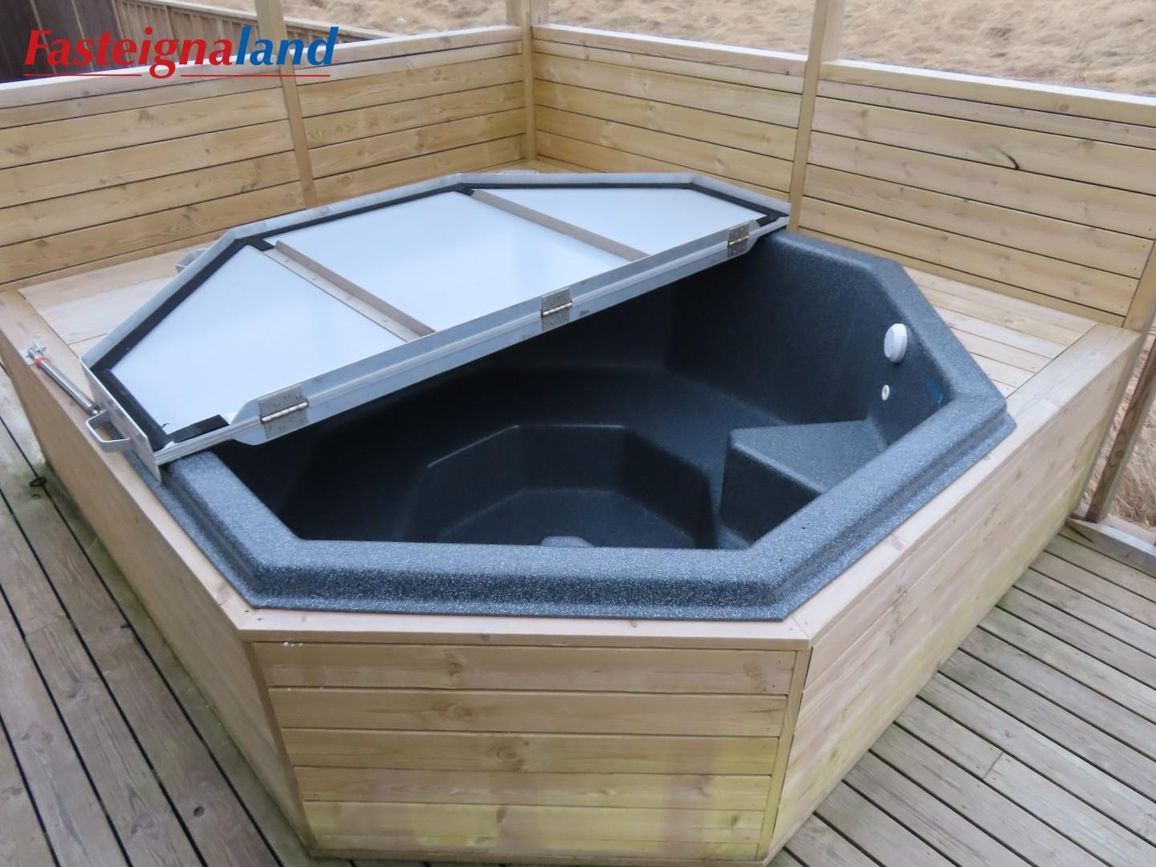 Stór sólpallur með girðingu og skjólgirðingu. Heitur pottur.
