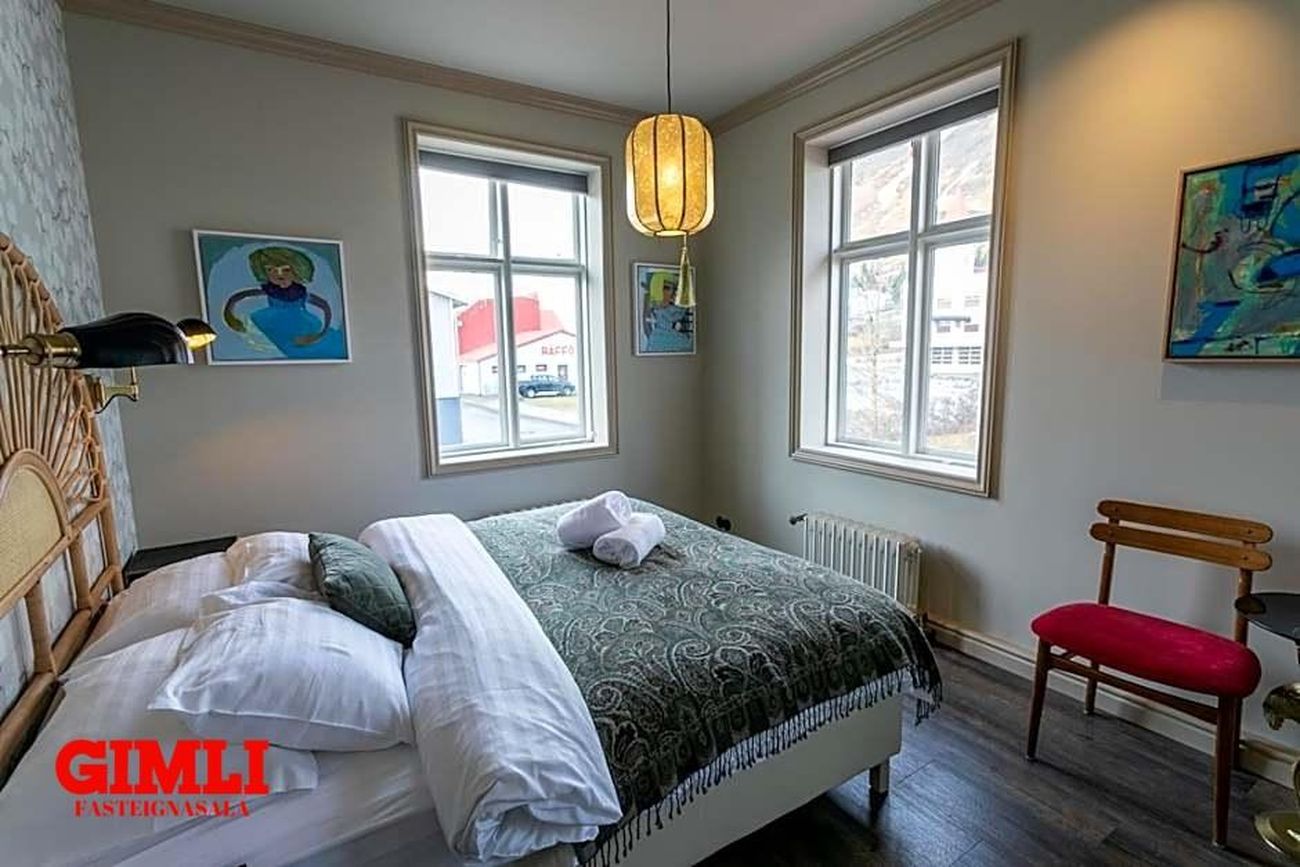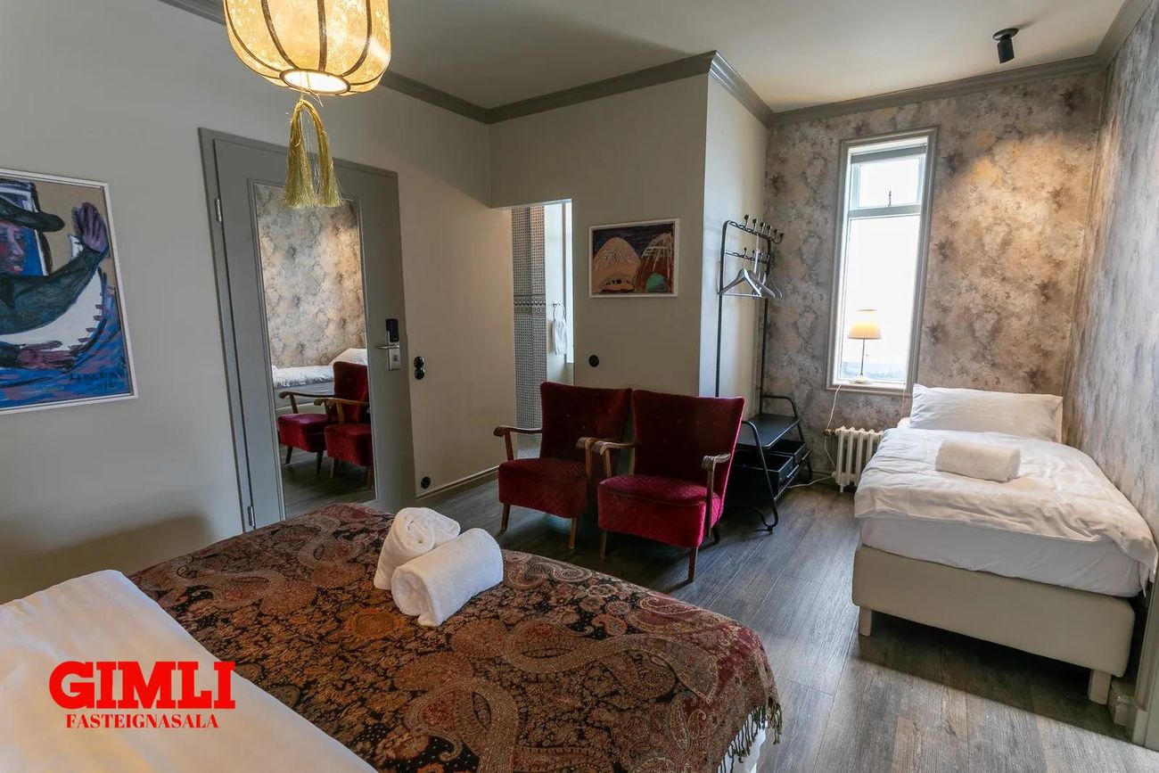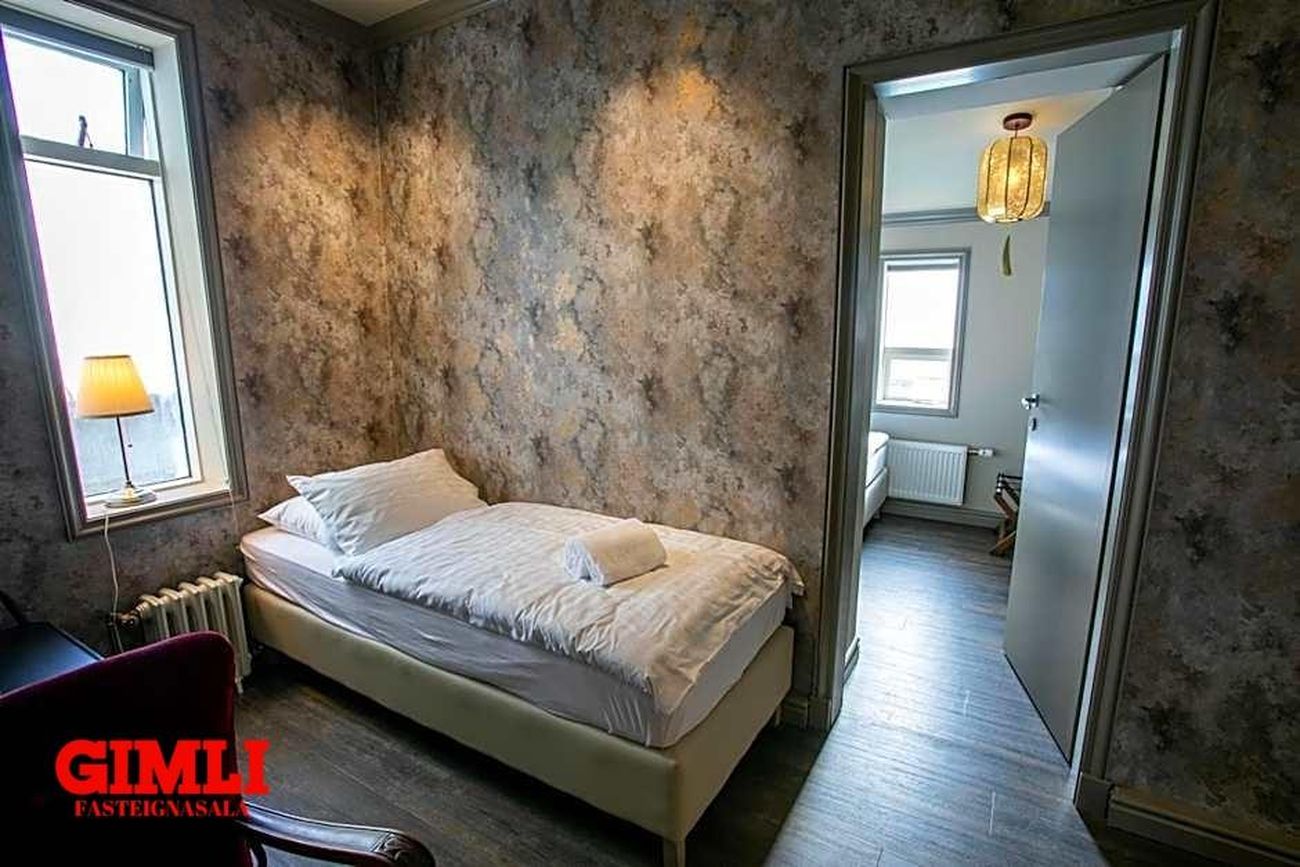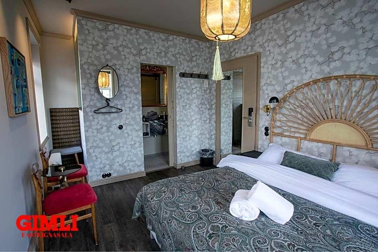 NÁNARI LÝSING:Í hótelinu eru 17 herbergi, fyrir samtals 38 manns. Einnig eru 2 starfsmannaíbúðir fyrir alls 5 starfsmenn og 70 fm rými sem hægt er að nýta sem geymslu/skrifstofu. Einstök lúxusíbúð hefur verið innréttuð í hluta hótelhúsnæðisins, stórt alrými með eldhúsi, setu- og borðstofu. Tvö svefnherbergi, bæði með baðherbergi m.m. Margir nýtingarmöguleikar.