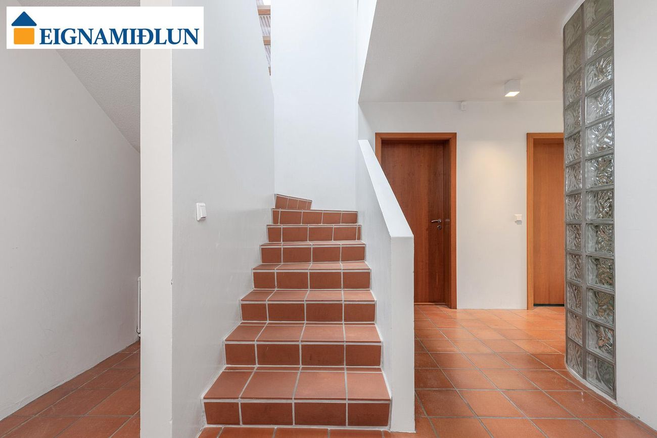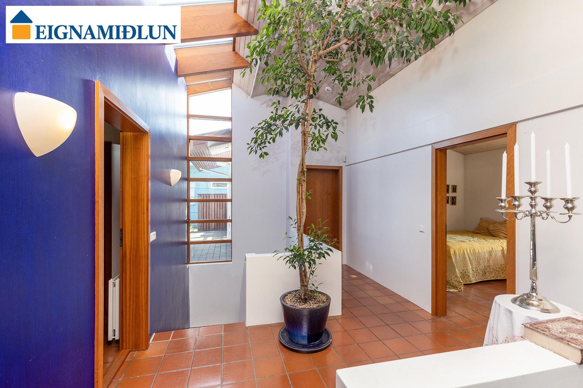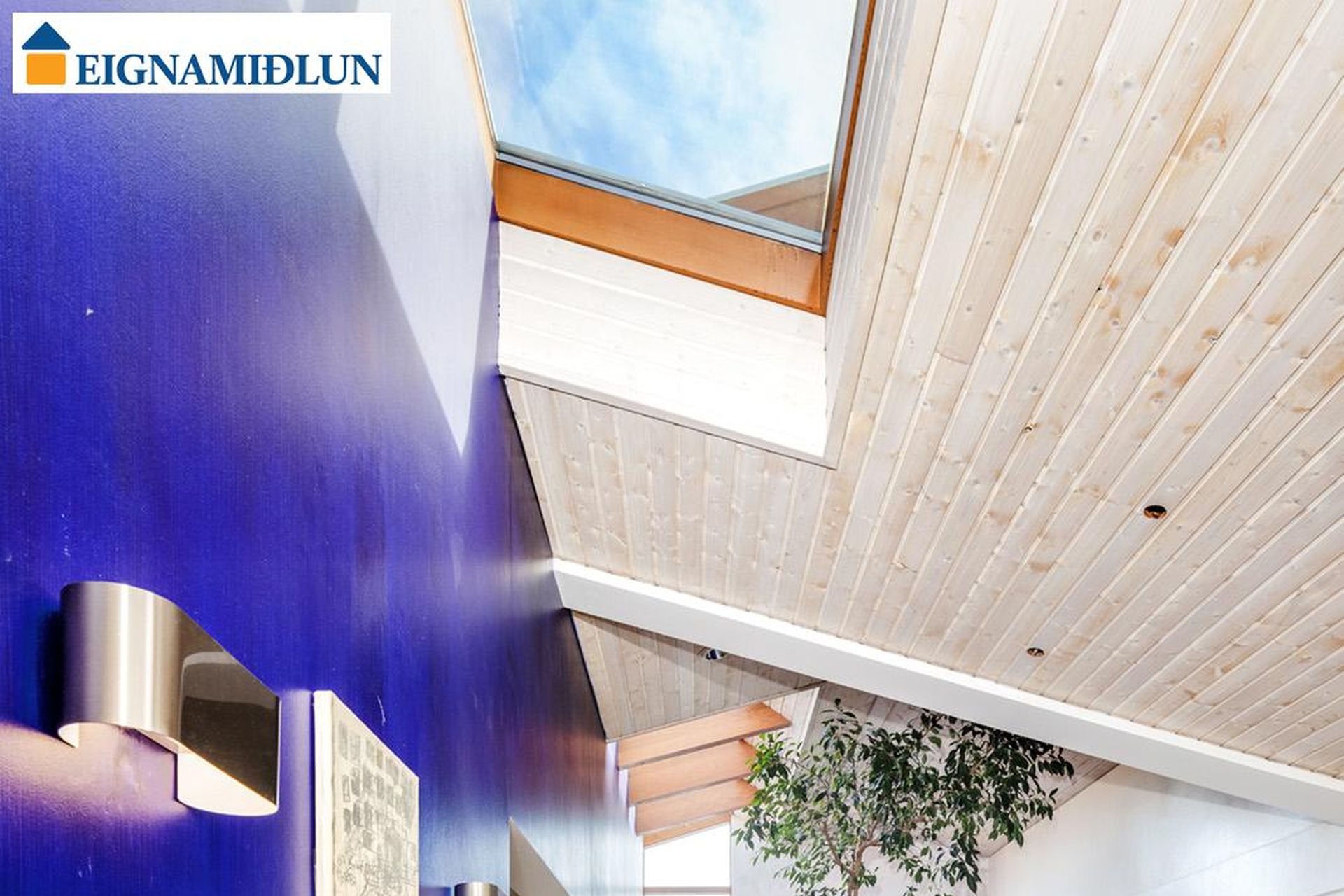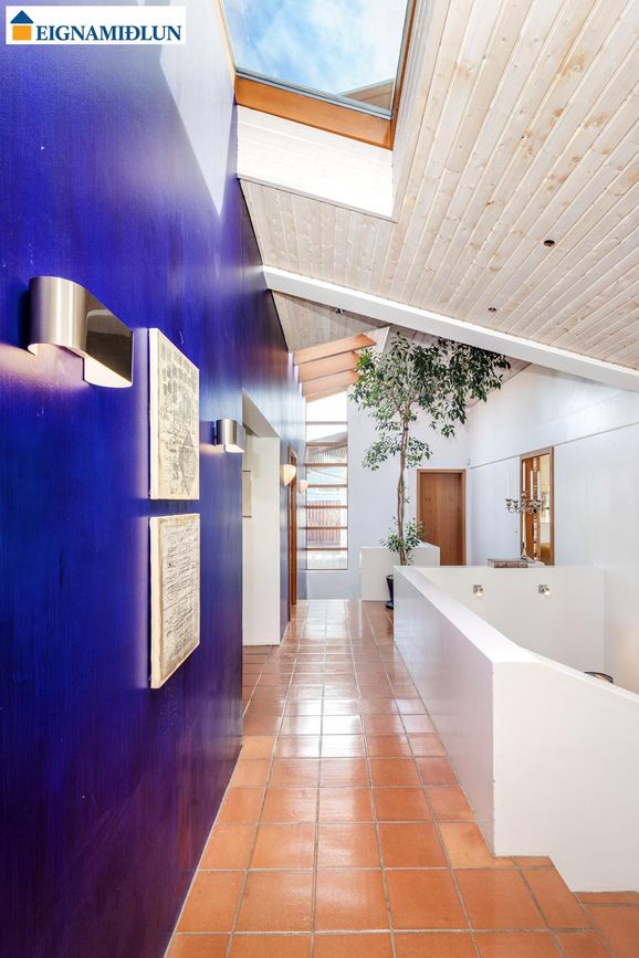 Gangur: Frá forstofu er komið inn á gang. Gólf er flísalagt. Mjög mikil lofthæð er á gangi og þakgluggar.