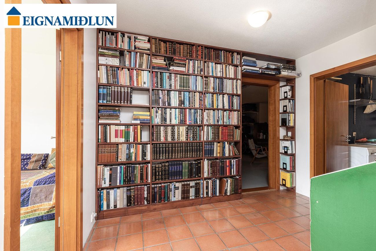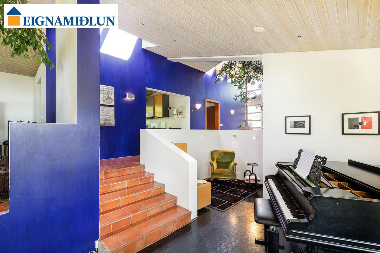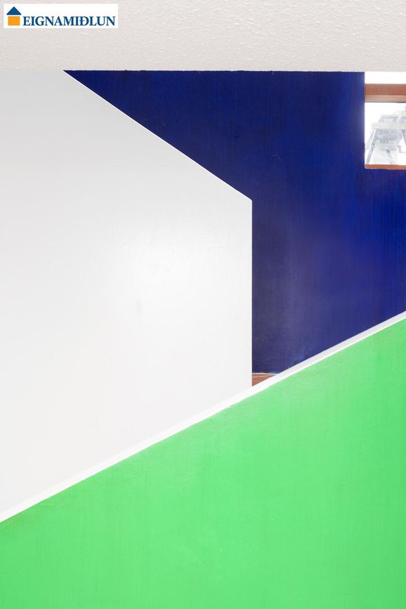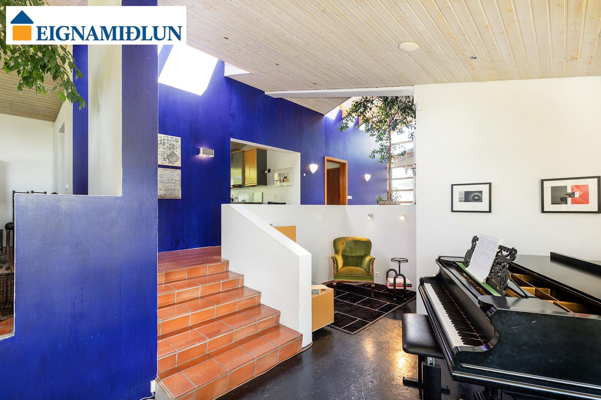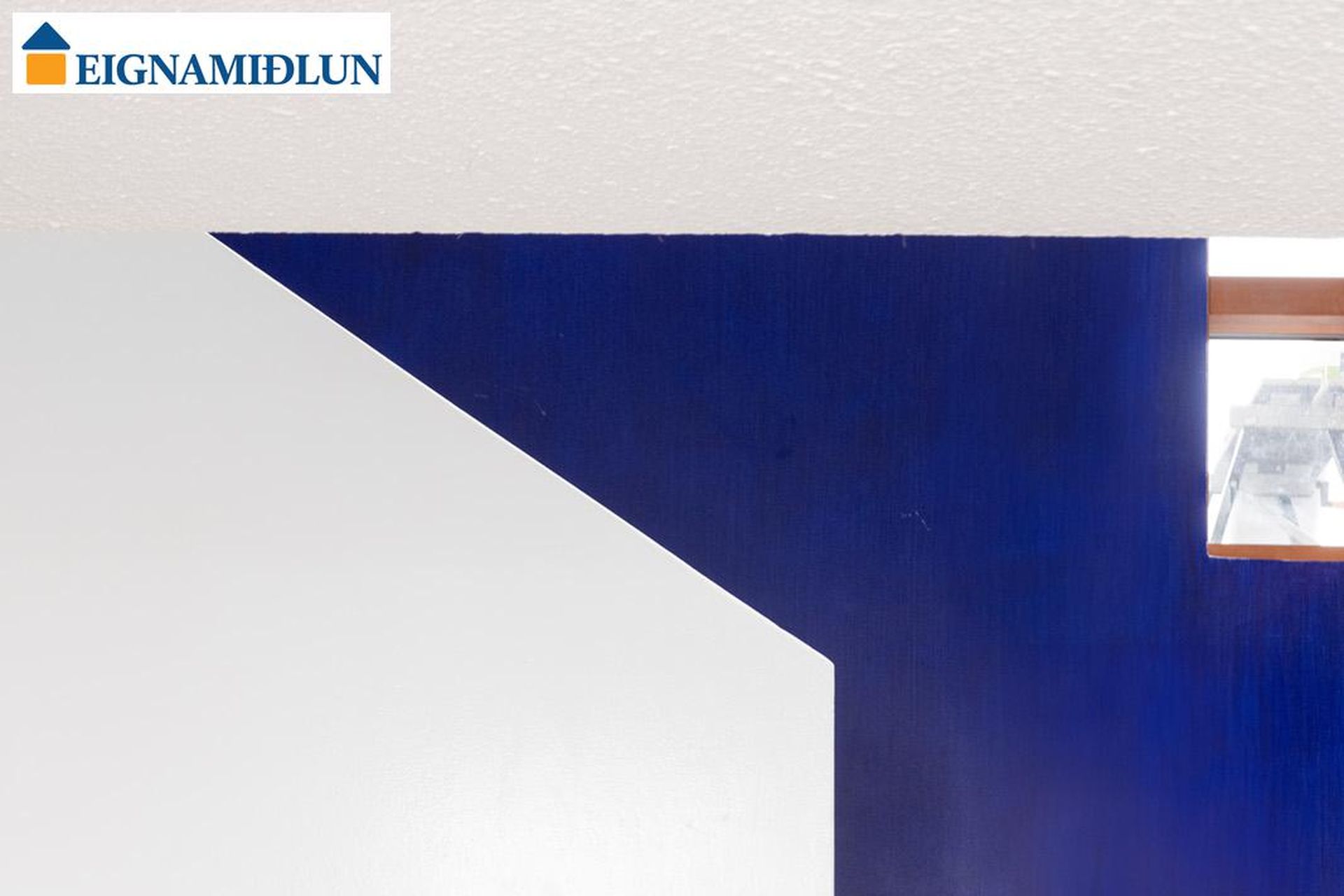 Gangur: Frá forstofu er komið inn á gang. Gólf er flísalagt. Mjög mikil lofthæð er á gangi og þakgluggar.