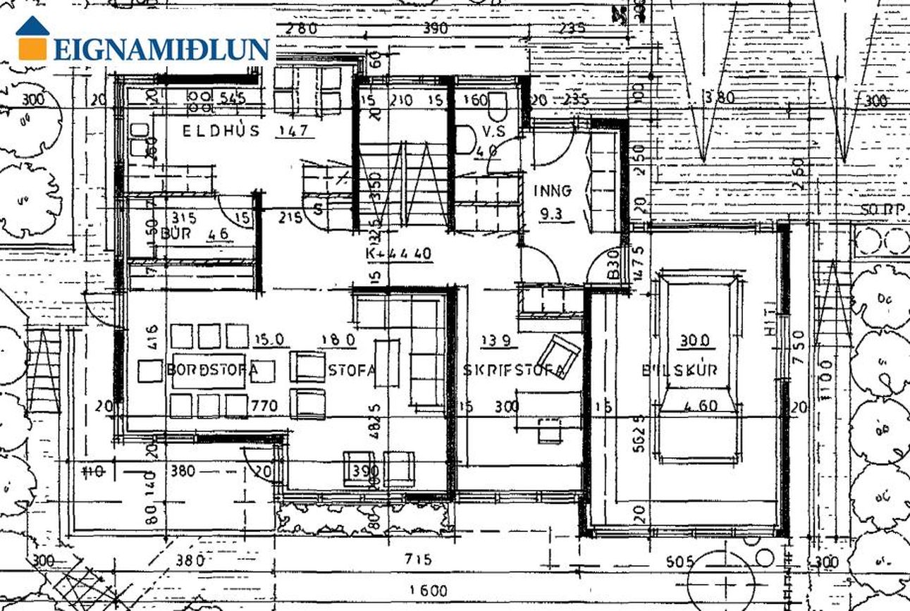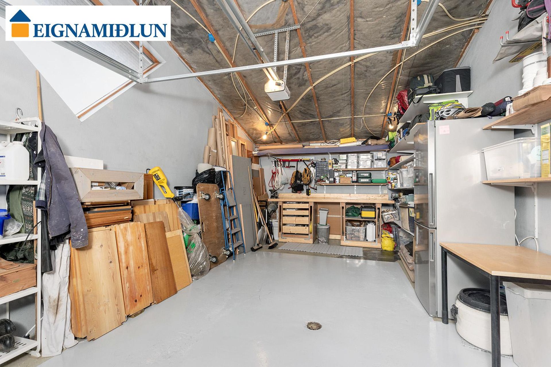 Bílskúr: 28,1 fm rúmgóður bílskúr með góðri lofthæð. Innangengt er í bílskúrinn frá gangi á efri hæð hússins. Sjálfvirkur hurðaopnari. Hiti er í hluta af bílaplani.