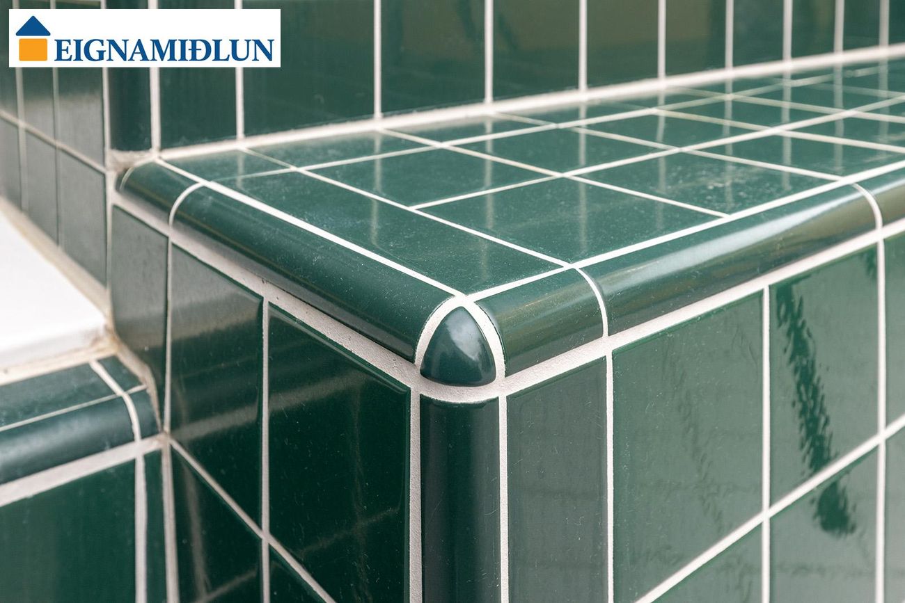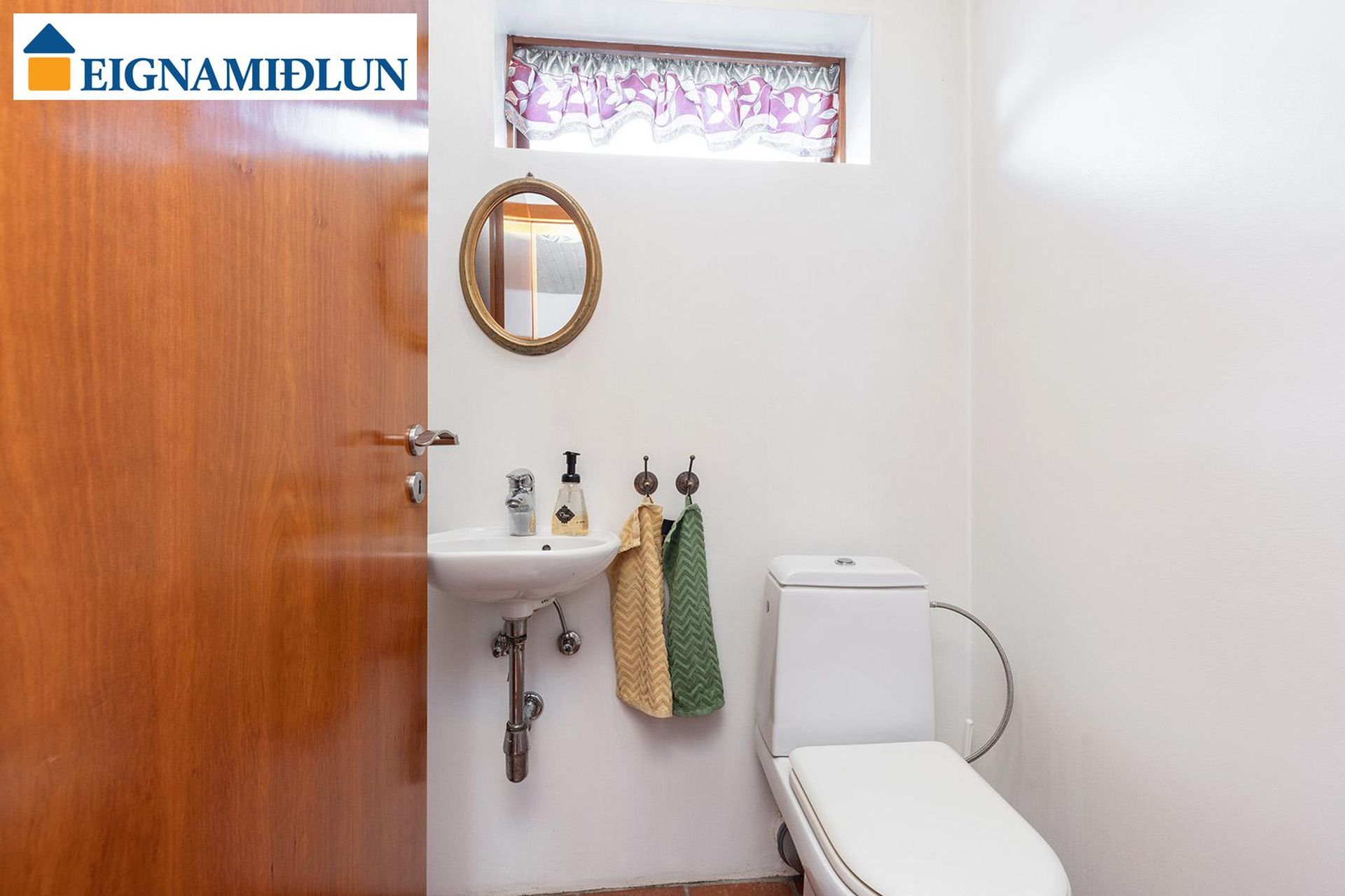 Snyrting: Innaf forstofu er flísalögð snyrting með glugga.