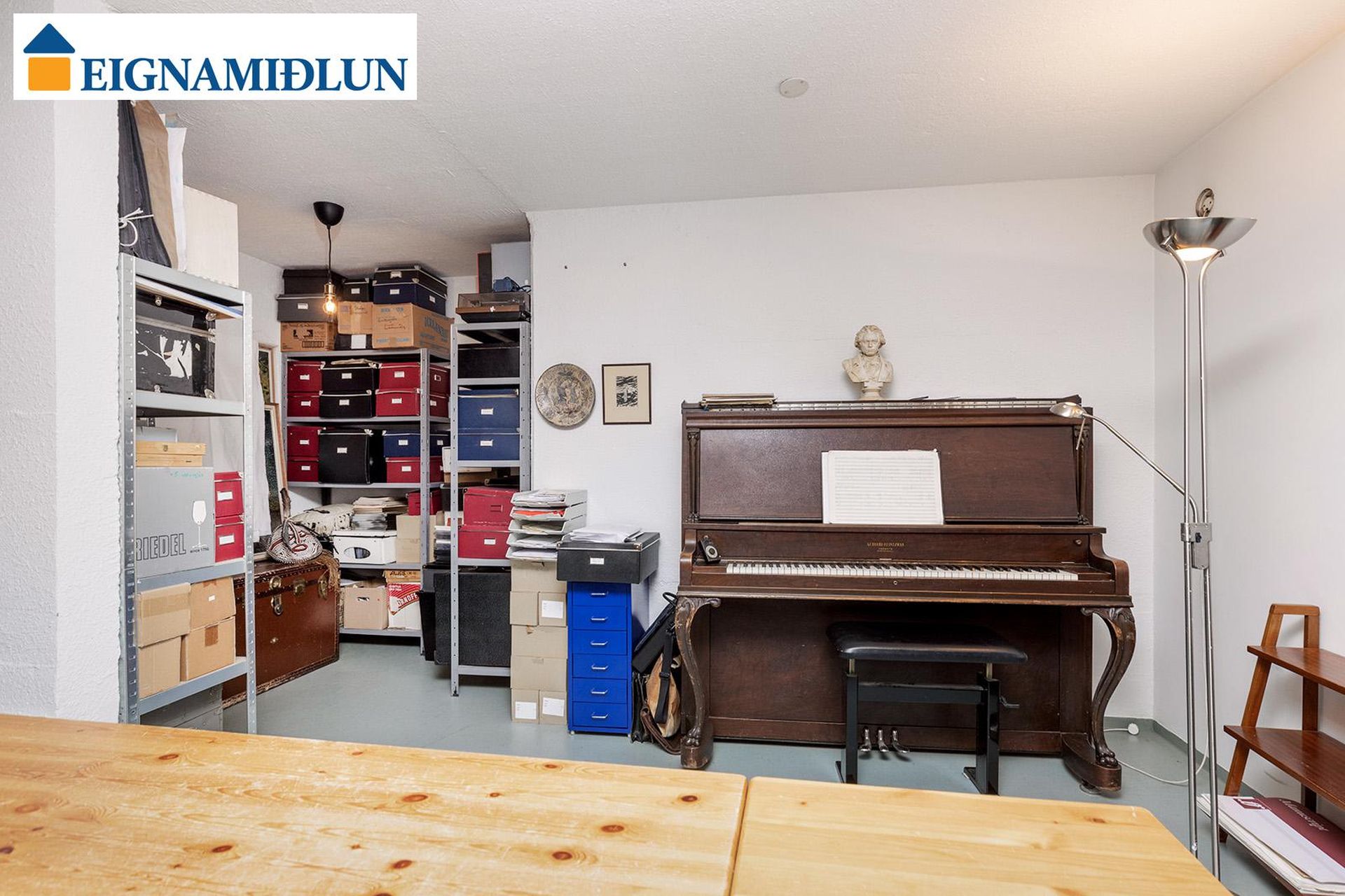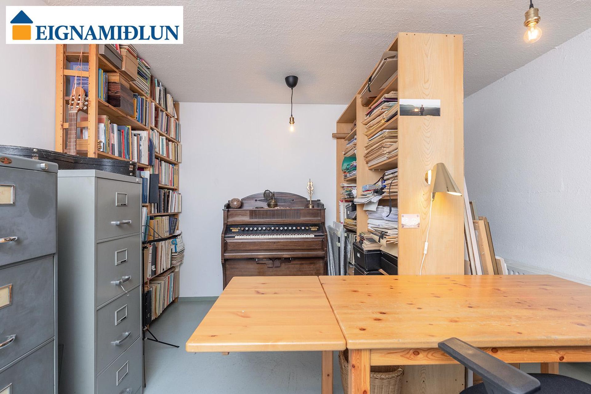 Vinnustúdíó: Rúmgott rými sem er nýtt sem vinnustúdíó listamanns í dag. Gengið er niður nokkur þrep í rýmið en það er undir stofu á efri hæð. Rýmið er gluggalaust en á samþykktri teikningu er gert ráð fyrir gluggum og hurð út í garðinn. Linoleum dúkur á gólfi.