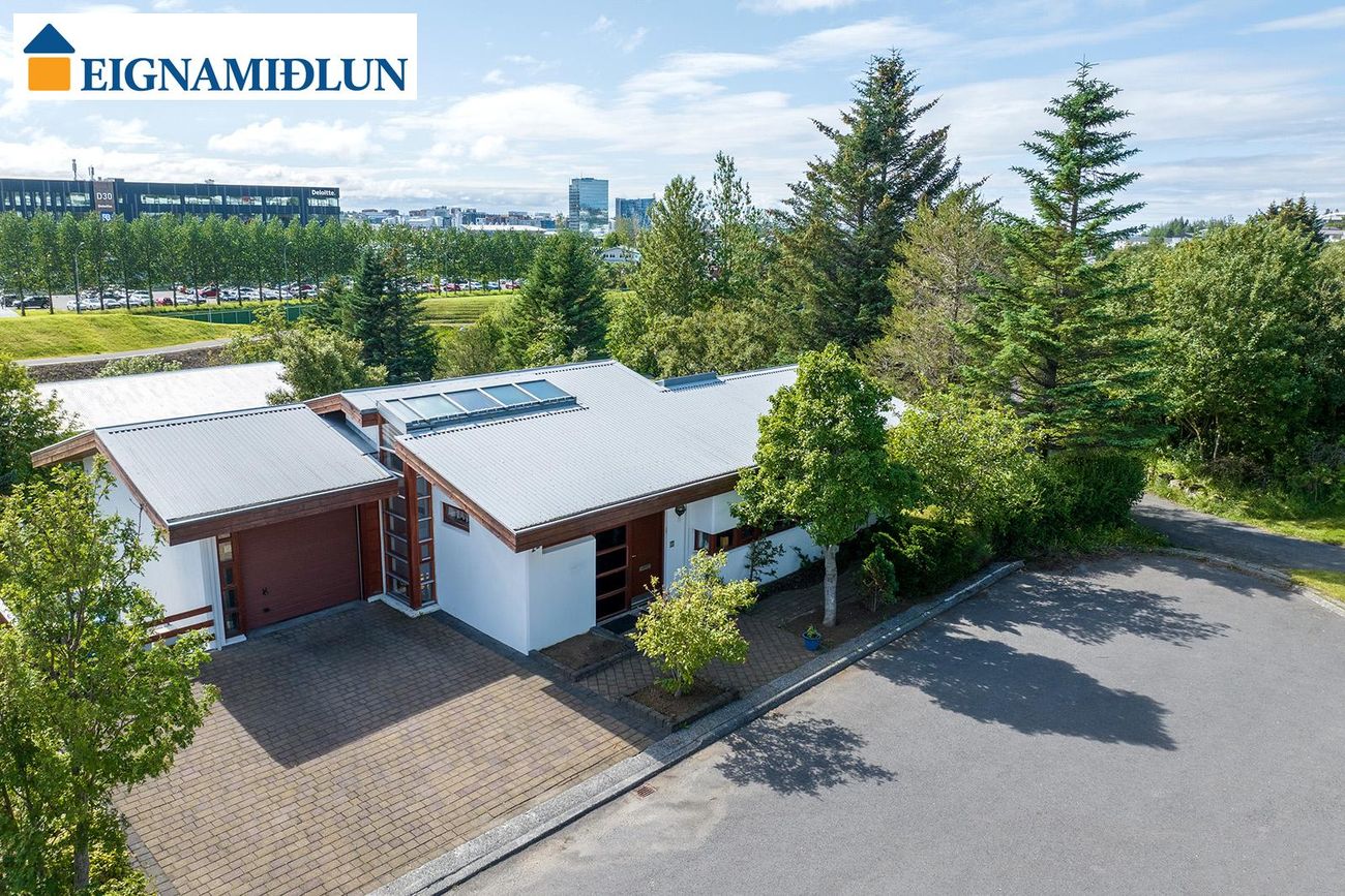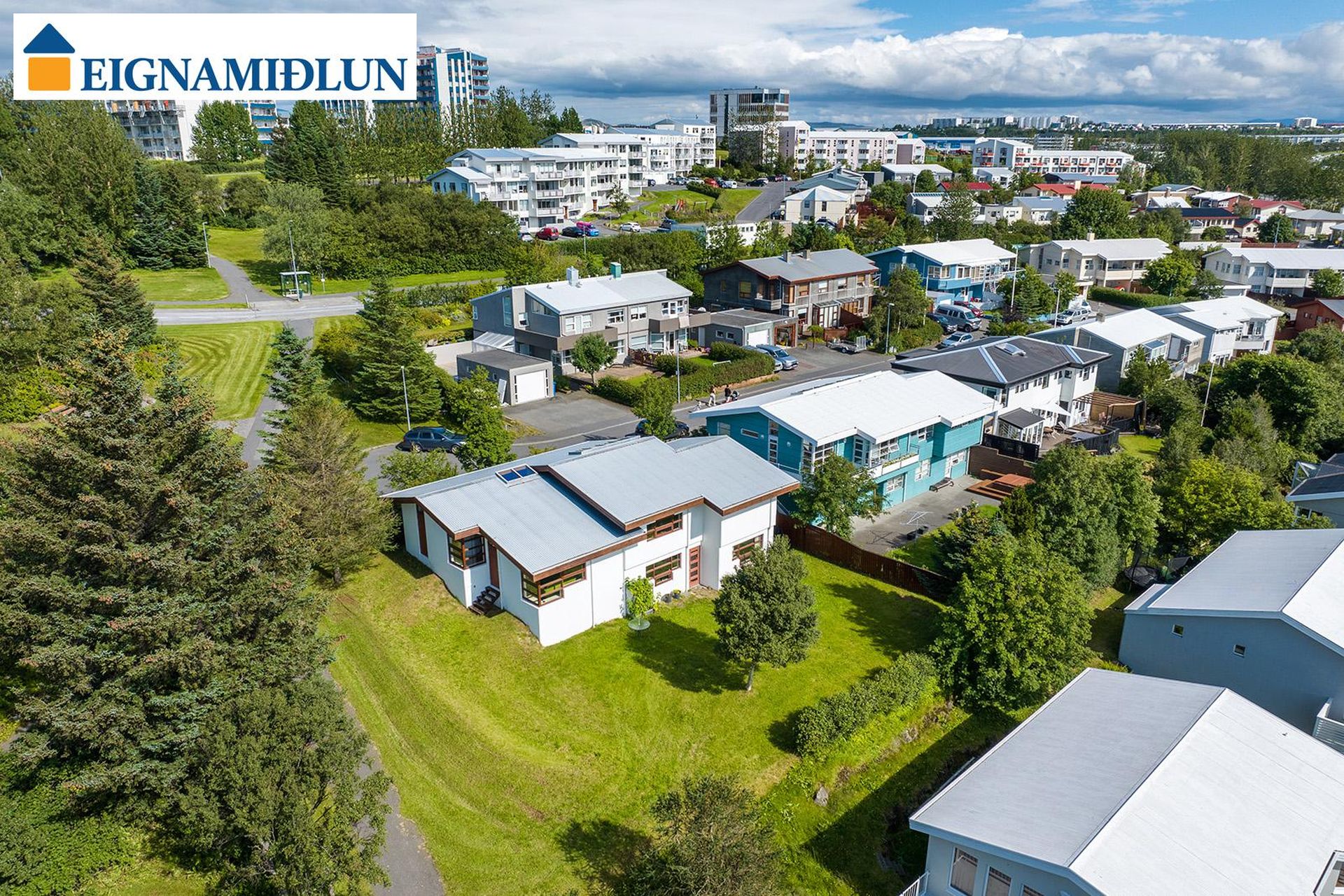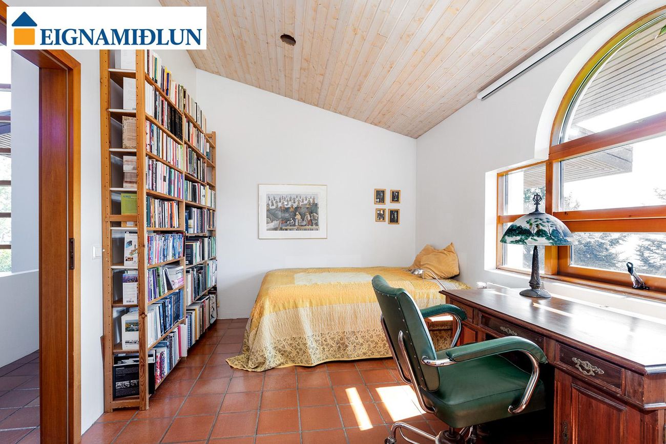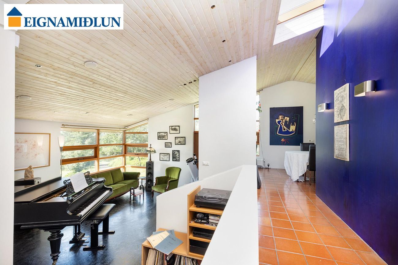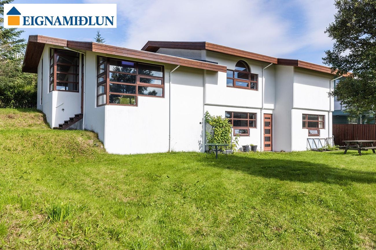 Mjög fallegt og vandað 277,1 fm einbýlishús með bílskúr við Lækjarhjalla 22 í suðurhlíðum Kópavogs. Húsið sem er á tveimur hæðum er einstaklega vel staðsett en það er innst í botnlangagötu og vestan við húsið er opið svæði. Stór skjólsæll gróinn garður til suðurs. Arkitekt hússins er Benjamín Magnússon. Mjög mikil lofthæð er á efri hæð hússins og þakgluggar. Samkvæmt Fasteignayfirliti er húsið skráð 277,1 fm en þar af er bílskúrinn skráður 28,2 fm. Hluti af rými á neðri hæð hússins er gluggalaus. Til eru teikningar frá árinu 2003 frá sama arkitekt sem gera ráð fyrir að settir séu gluggar og dyr á rýmið.*