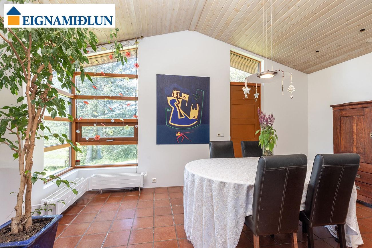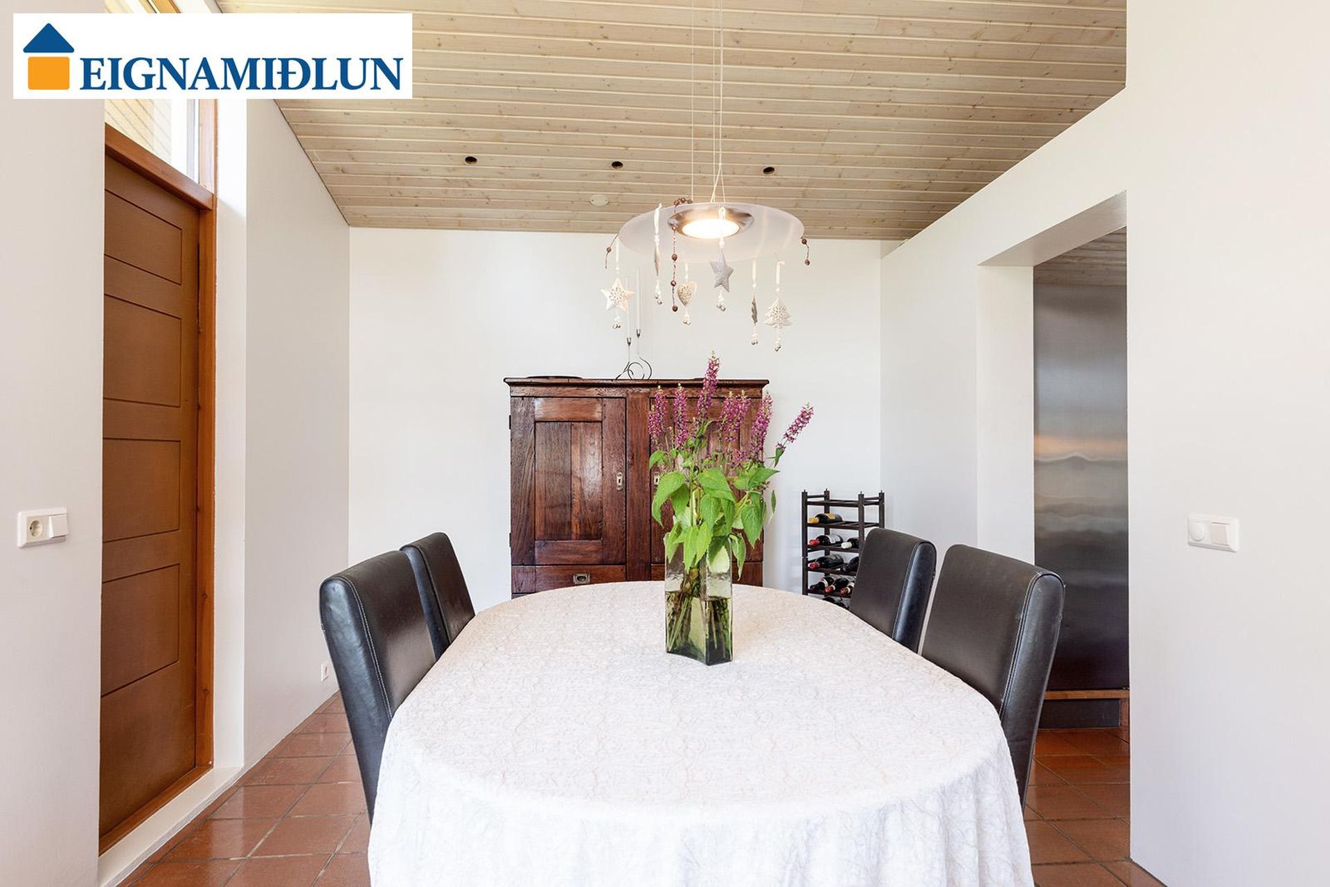 Borðstofa: Gengið er í borðstofu frá gangi og eldhúsi. Gólf er flísalagt. Hægt er að ganga út í garð úr borðstofu.