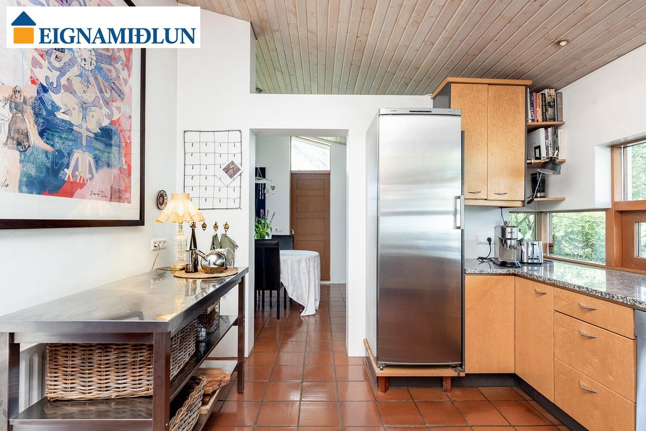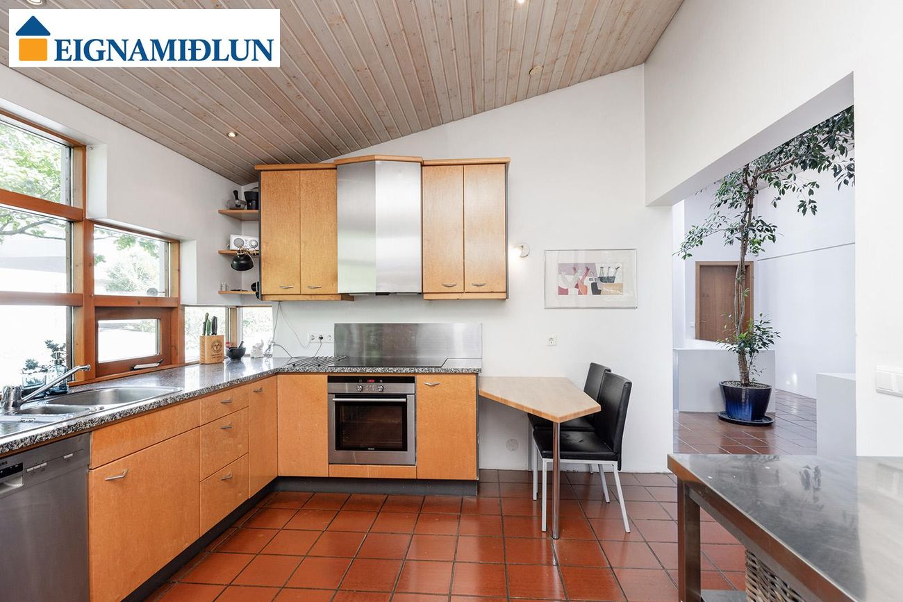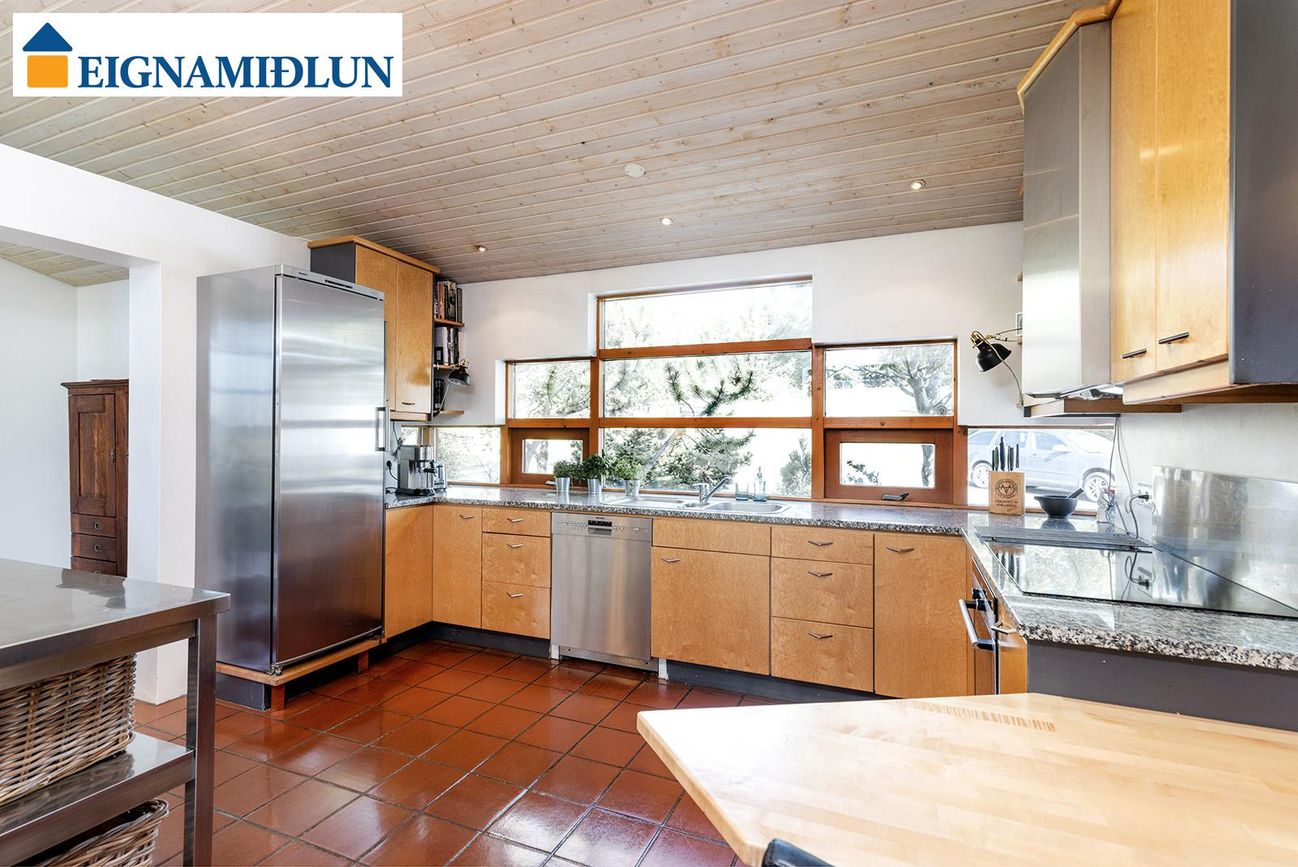Eldhús: Rúmgott eldhús með fallegri sérsmíðaðri viðarinnréttingu. Borðplata er úr granít. Ofn og háfur úr stáli. Áfast lítið eldhúsborð.