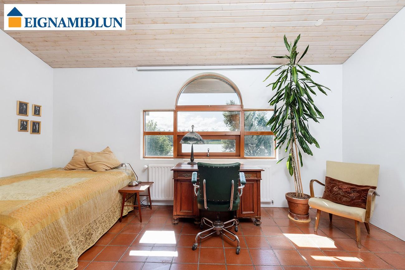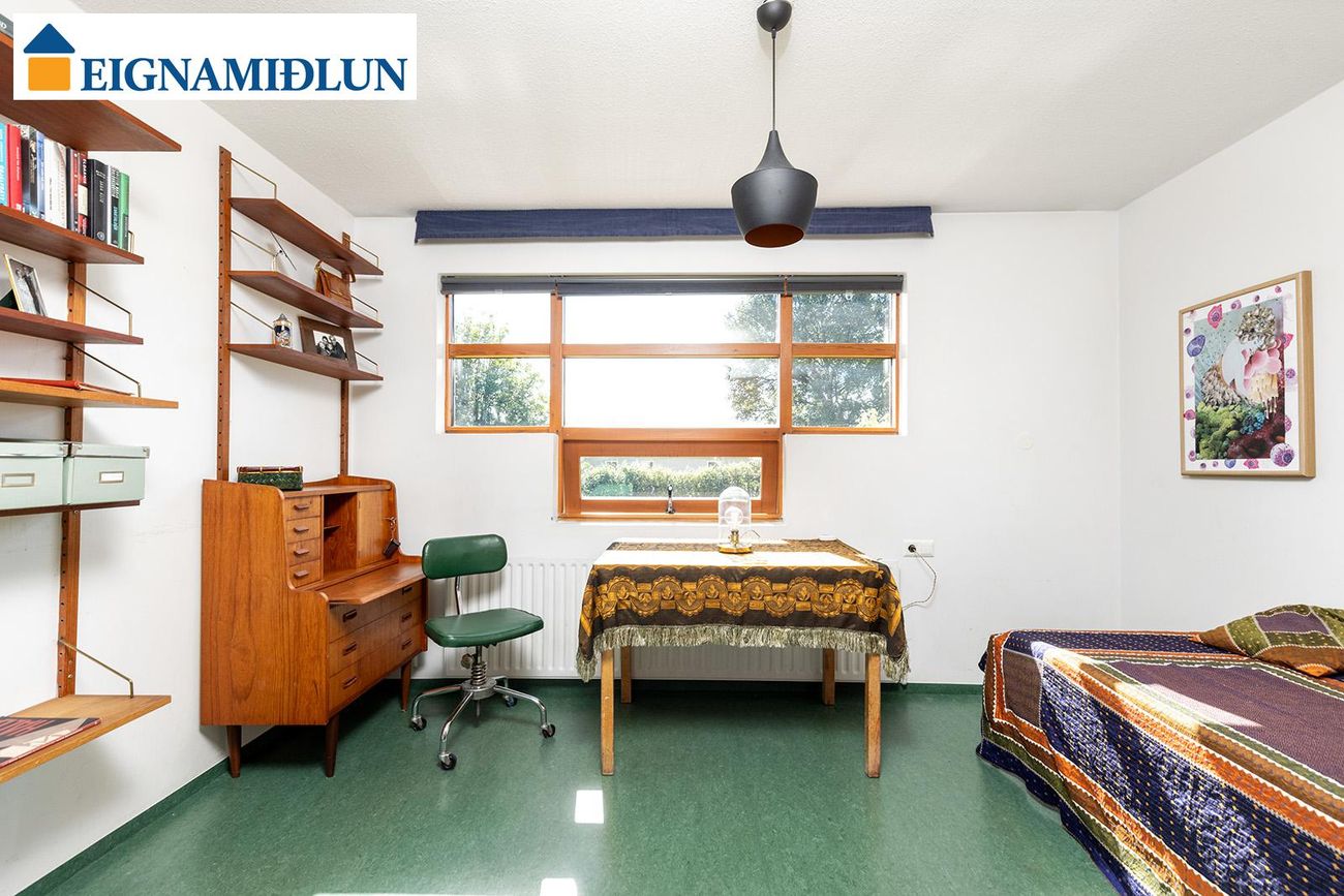 Herbergi: Mjög rúmgott flísalagt herbergi með fallegum bogadregnum glugga. Herbergið getur nýst sem vinnuherbergi og/eða svefnherbergi.