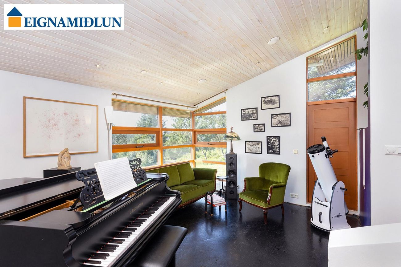 Stofa: Gengið er niður nokkur þrep í stofuna. Fallegur horngluggi í stofu. Gólf í stofu er málað. Gengið er út í garð úr stofu.