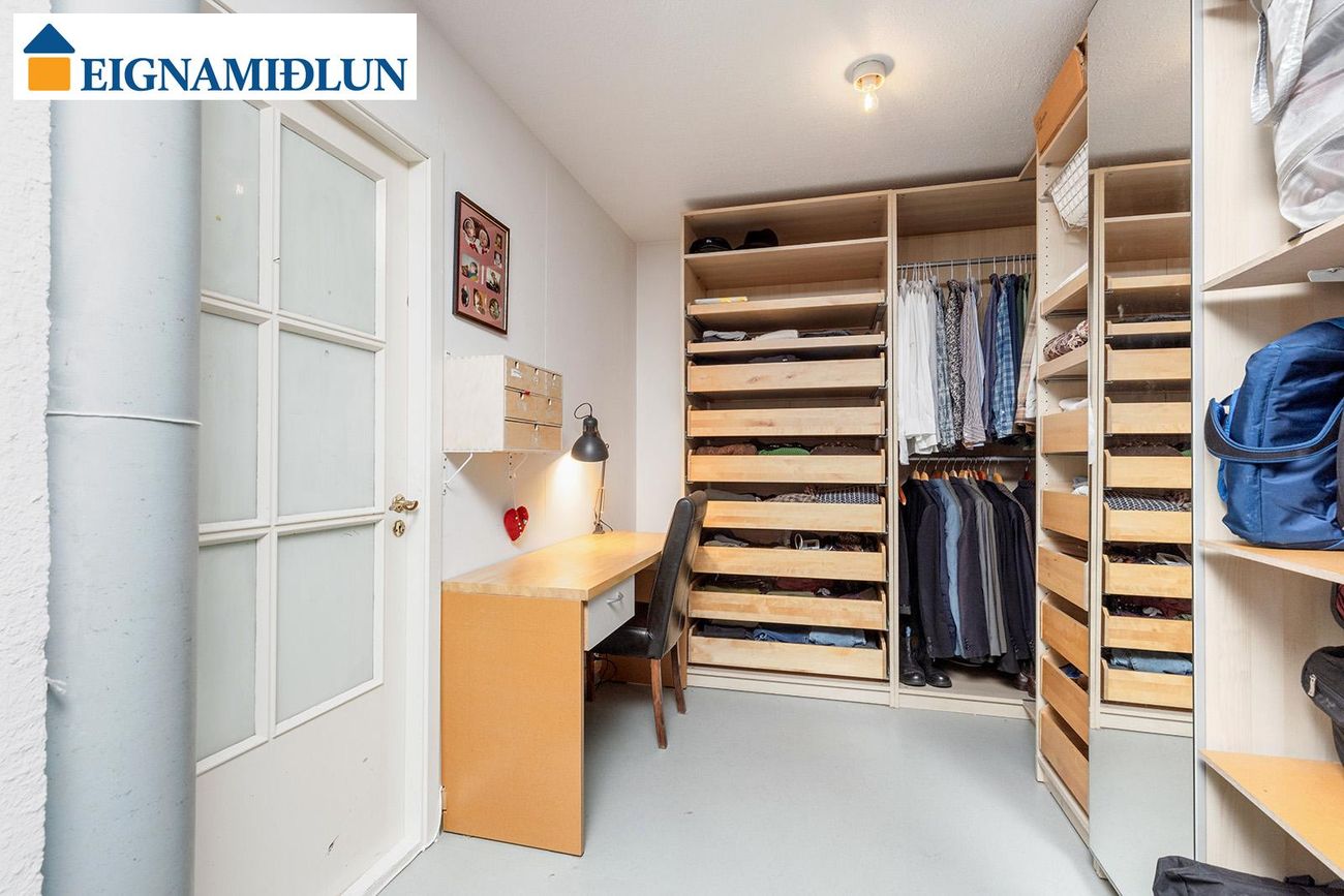 Tómstundaherbergi/fataherberg: Rúmgott rými sem er nýtt sem tómstundaherbergi, fataherbergi og geymsla. Rýmið er gluggalaust en á samþykktri teikningu er gert ráð fyrir gluggum. Linoleum dúkur á gófi.