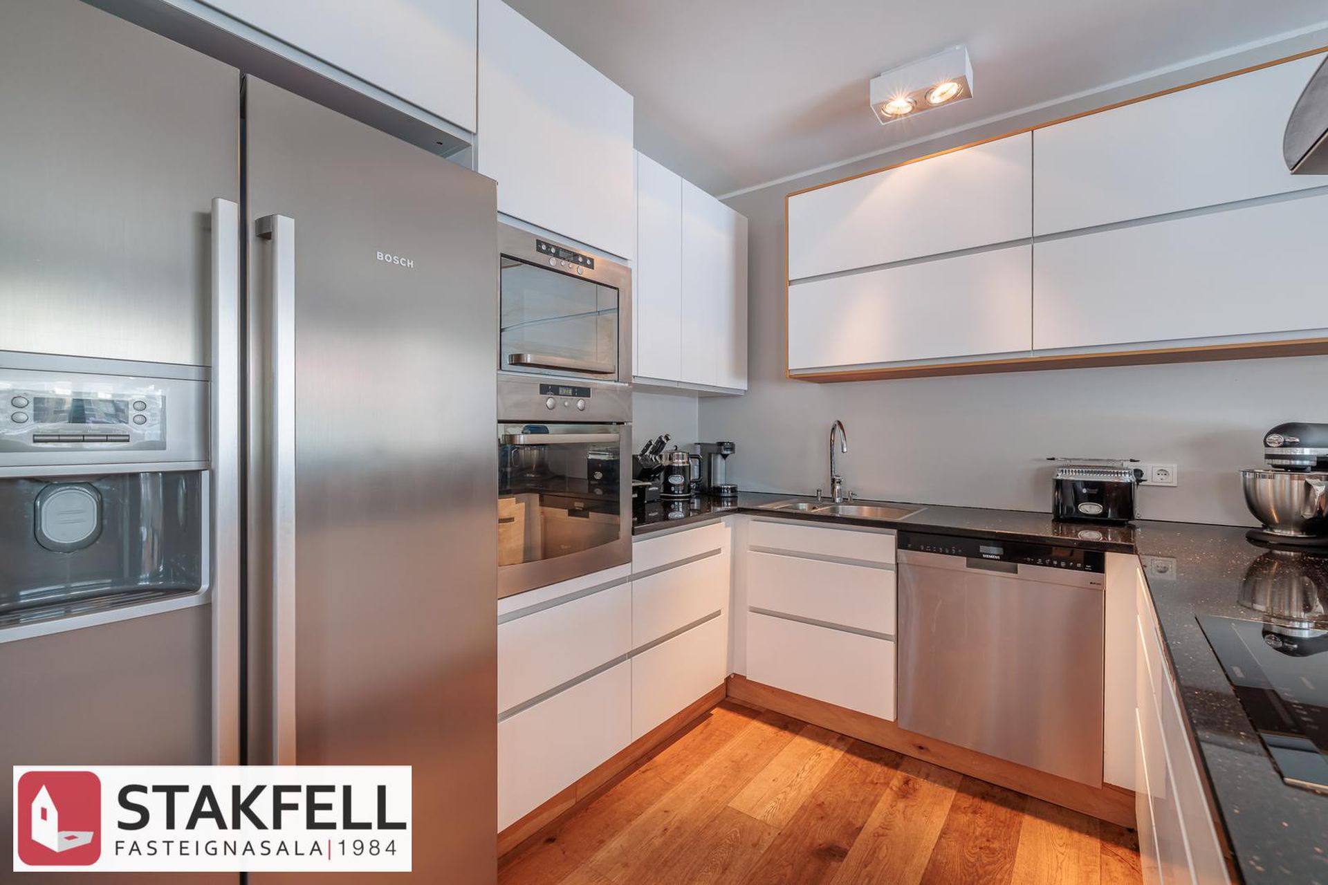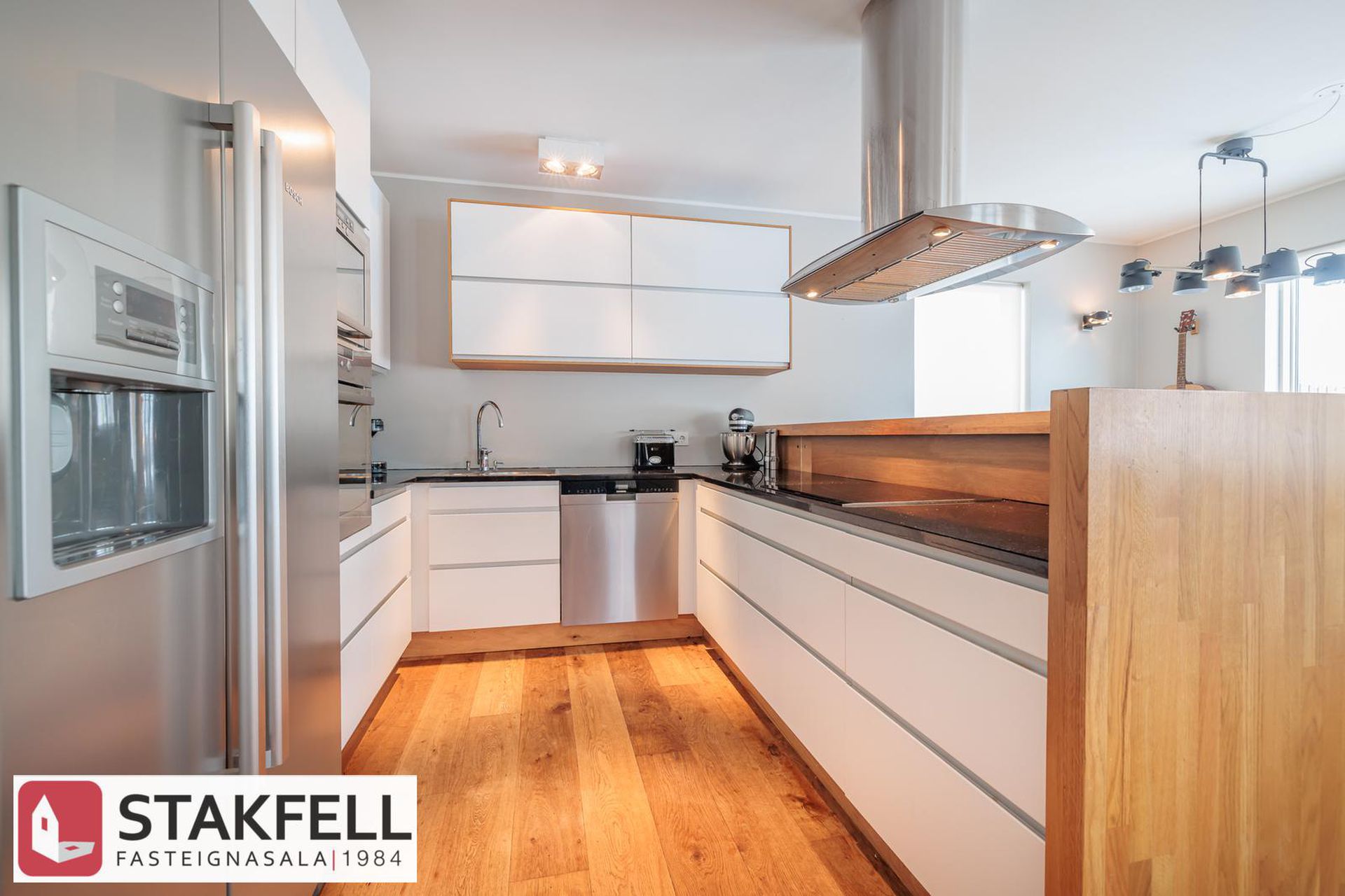 eldhúsi er falleg hvít innrétting með granít borðplötu, spanhelluborði, blástursofni og háfi.